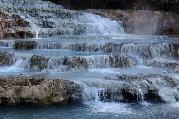 De formidables chutes d'eau coulent sur la commune de Mulino. Depuis plus de 3 000 ans, une eau sulfureuse jaillit à une température constante de 37,5 °C. Au petit matin, le phénomène d'évaporation est bien visible, de petits bassins se sont formés et délivrent leurs bienfaits aux baigneurs. En route pour la Toscane, nous parcourons … Lire la suite 371-Les chutes d’eau de Mulino et Sienne