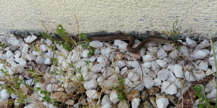 En admirant les jardins environnants, nous sommes tombés sur une coronelle lisse, petite couleuvre protégée totalement inoffensive d’une soixantaine de centimètres environ. La vitesse de déplacement est impressionnante. L’exposition au soleil lui permet d’emmagasiner de l’énergie avant de partir en chasse de lézards et de petits insectes.