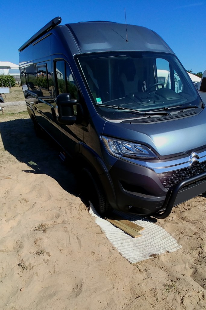 Le sable a ses avantages, mais aussi ses inconvénients qui nous ont valu un ensablement au camping. On a dû batailler deux heures pour sortir Jolly Jumper faute de matériel adapté, en prenant soin de ne pas endommager le réservoir d’eaux grises. Après quoi, nous sommes allés refroidir nos nervous breakdowns à la mer, toujours se méfier de nos nerfs. Ça fera partie des souvenirs.