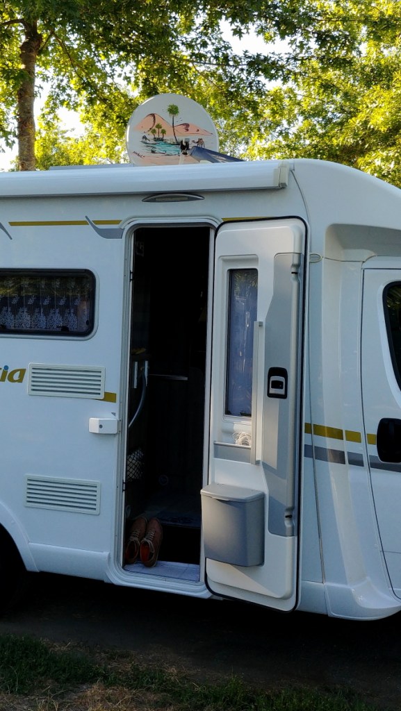 La canicule est annoncée et la chaleur se fait sentir. Il nous faut impérativement de l’ombre dans l’après-midi afin de ne pas finir dans une étuve. Il y va aussi de la protection du matériel : un camping-car chauffe plus vite qu’une maison, mais le soir, la carrosserie ne restitue pas cette chaleur et à la tombée de la nuit, nos ventilateurs au flux réversible accélèrent le refroidissement du véhicule pour une nuit plus agréable. On reconnait facilement les voyageurs adeptes des pays chauds.