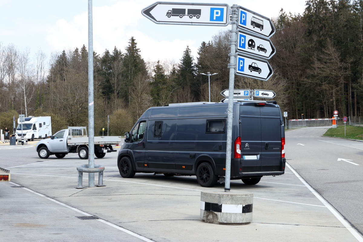 Ce matin, nous sommes réveillés par des petits soubresauts, Jolly Jumper a l’air surexcité. Au petit déjeuner, il nous annonce une journée très spéciale. Il souhaite nous faire une surprise et décide de prendre l’autoroute entre Berne et Zurich. À la sortie de la capitale, après quelques kilomètres, son cadeau nous saute aux yeux : un parking portant notre nom de famille avec tous les services disponibles pour camping-car. Faut avouer que la chose n’est pas très courante.