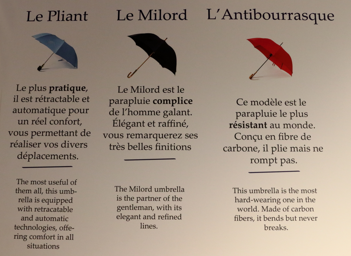 Rare sont les parapluies capables de résister à des bourrasques de plus de 150 Km/h pour un usage courant. Mais si vous craignez pour votre sécurité, optez pour le modèle, comment dire… blindé, enfin presque. Après avoir vu la vidéo durant la visite, tout commentaire devient superflu, semblable un peu au film Kingsman. La manufacture est installée dans l’ancienne succursale de la Banque de France.
