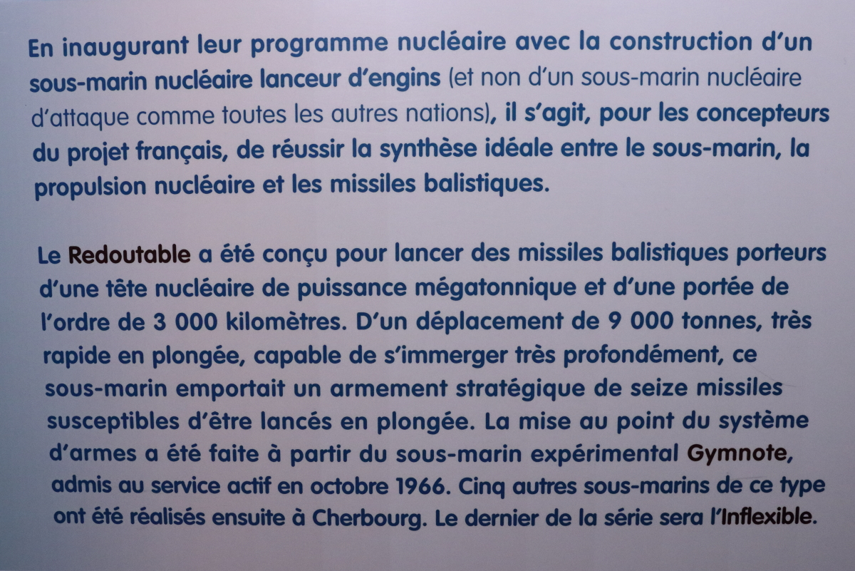 On attaque très fort avec un monstre d’acier, le Redoutable. Un sous-marin nucléaire de 128 m capable de naviguer 70 jours sous la surface. Son réacteur nucléaire était en mesure d’alimenter en électricité une ville comme Cherbourg.