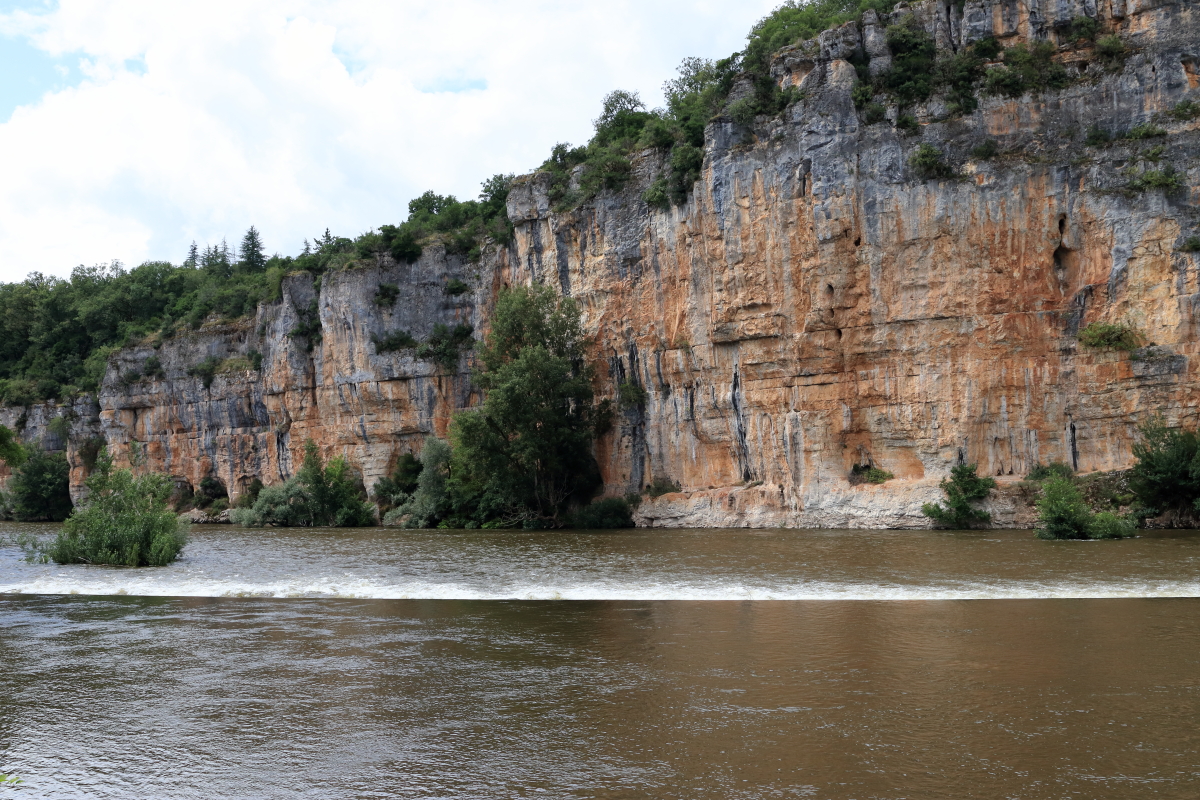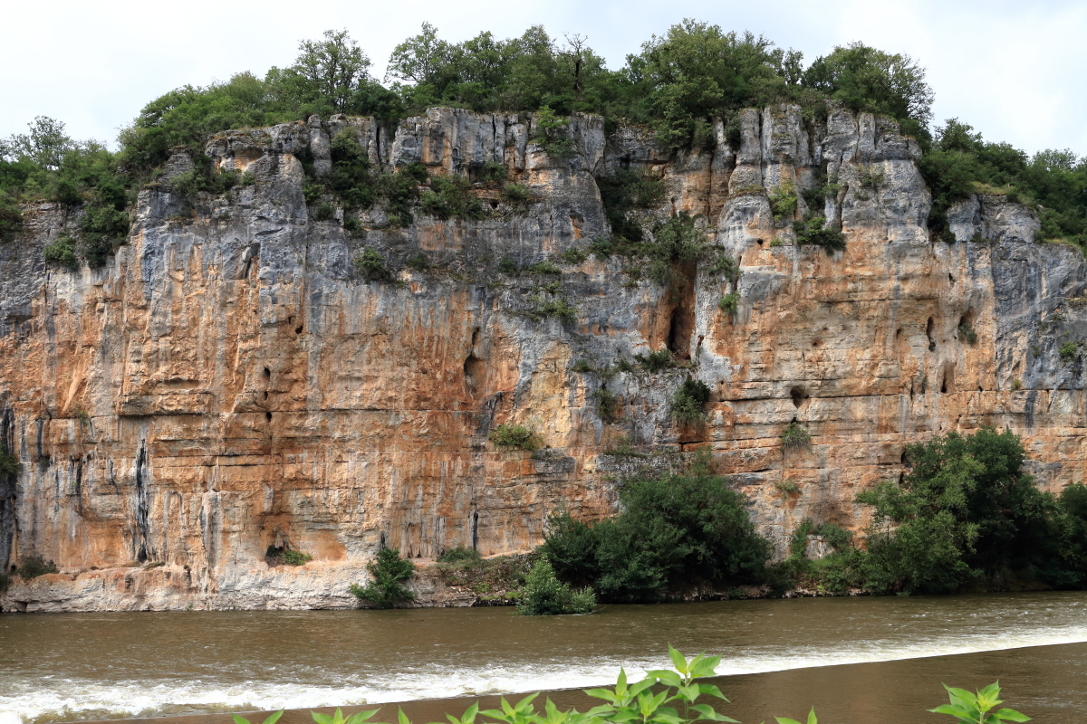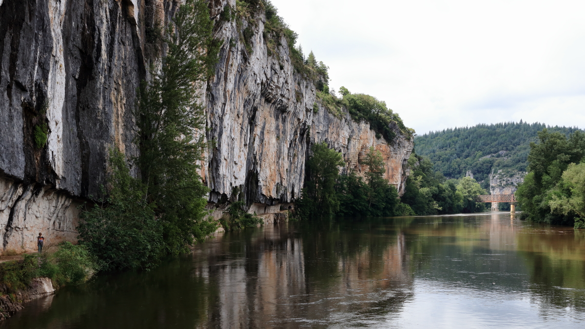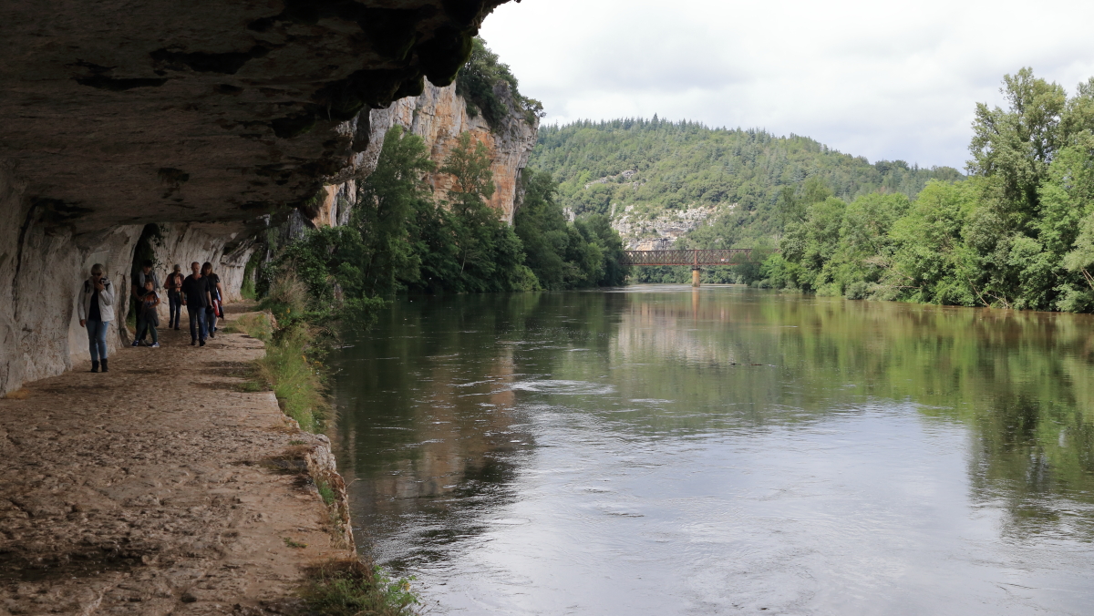 Nous continuons à cheminer le long du Lot pour la région du Quercy jusqu’à Bouziès. Équipement de rando et nous voilà partis sur le chemin de halage jusqu’à Saint-Cirq-Lapopie. Très vite, les falaises de granit apparaissent avec une échancrure dans la roche. Le sculpteur Daniel Monnier y a réalisé un bas-relief sur 40m2.