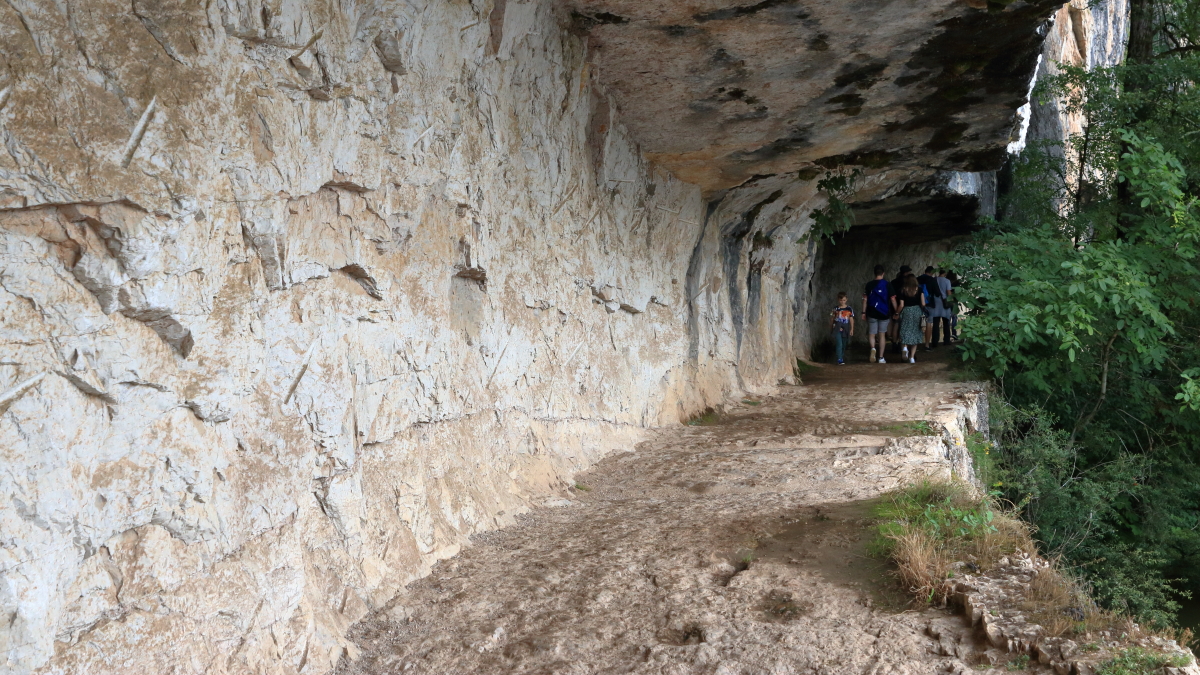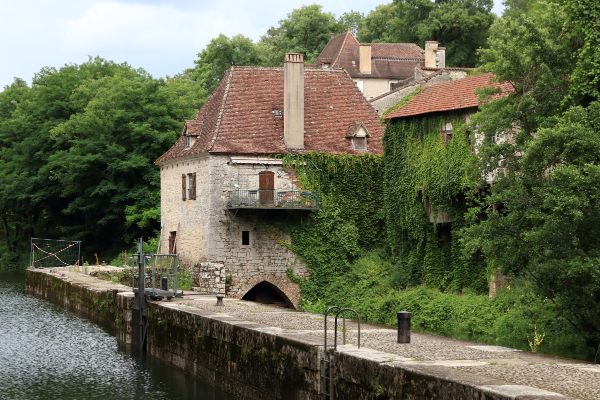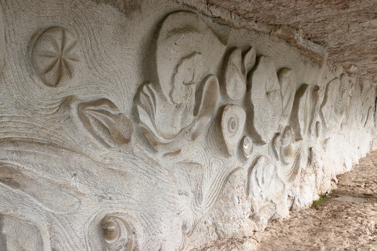 Nous continuons à cheminer le long du Lot pour la région du Quercy jusqu’à Bouziès. Équipement de rando et nous voilà partis sur le chemin de halage jusqu’à Saint-Cirq-Lapopie. Très vite, les falaises de granit apparaissent avec une échancrure dans la roche. Le sculpteur Daniel Monnier y a réalisé un bas-relief sur 40m2.