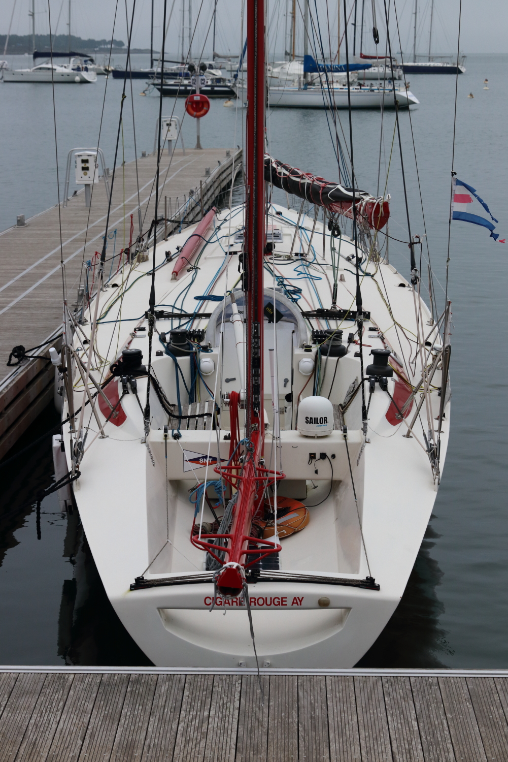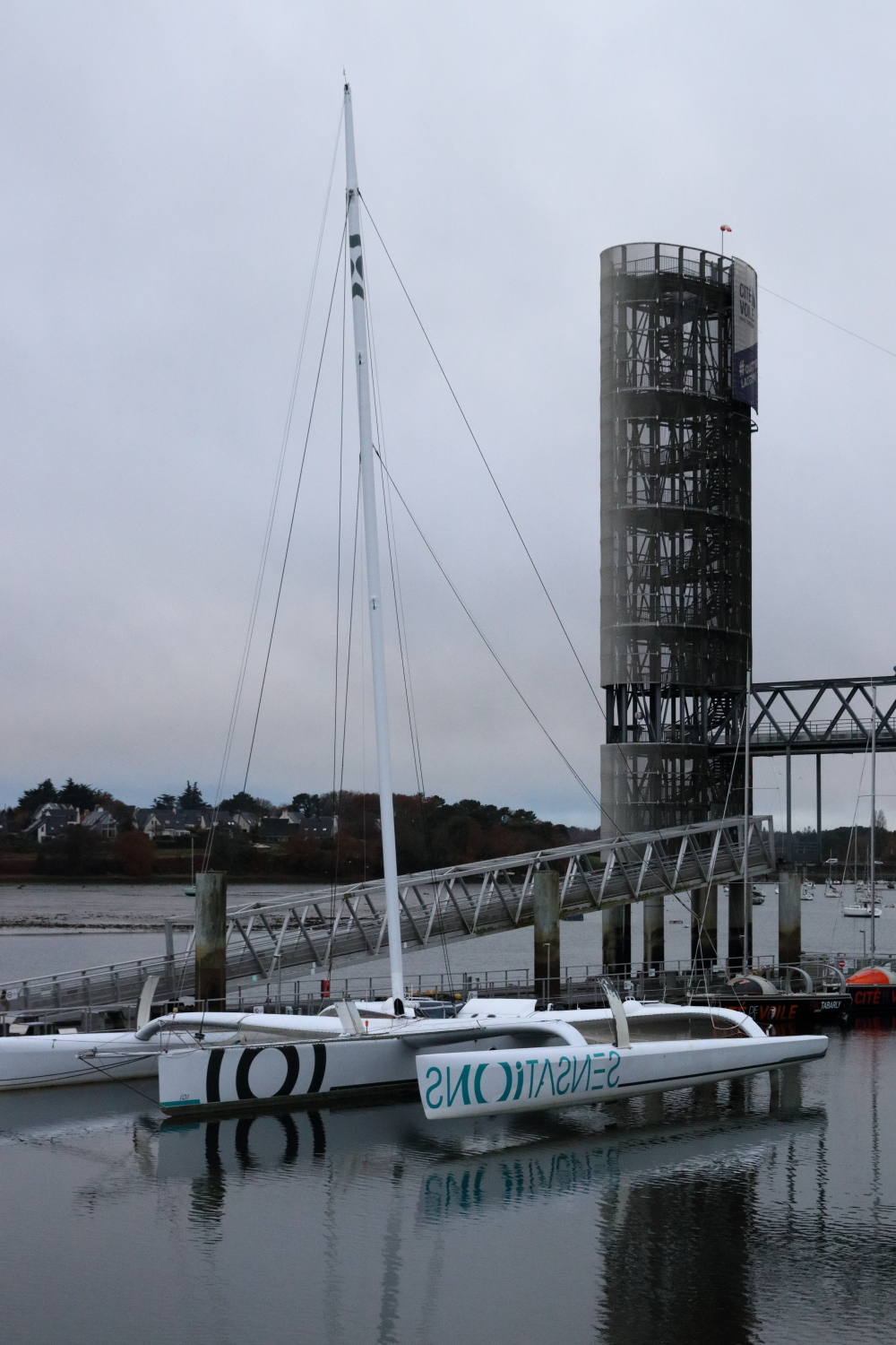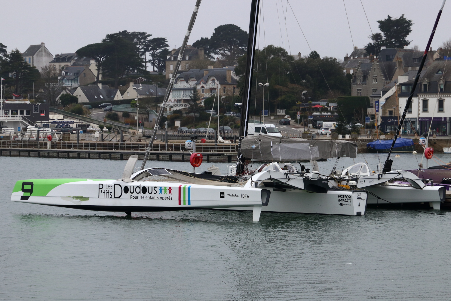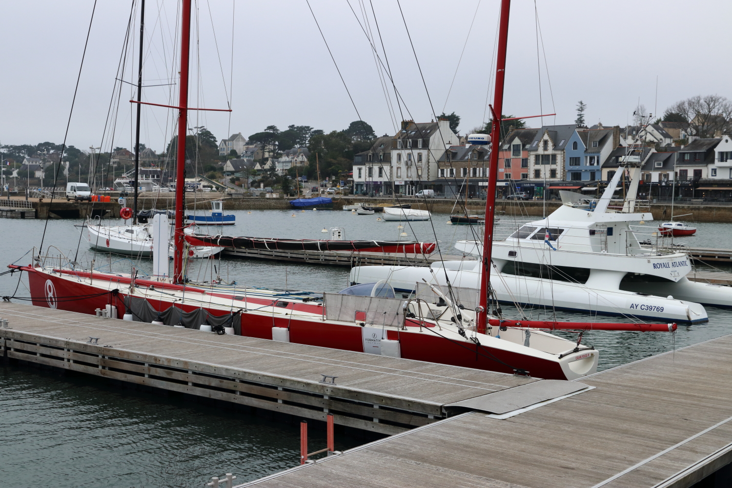 Autre milieu maritime incontournable pour la voile, La Trinité-sur-Mer, surtout quand le plus grand trimaran de course océanique au monde est à quai, le Sails of Change. La vue sur le port de plaisance donne une échelle de cette formule 1 des mers. Objectif, le Trophée Jules Verne avec un nouveau record pour un tour du monde en équipage, sans escale et sans assistance.