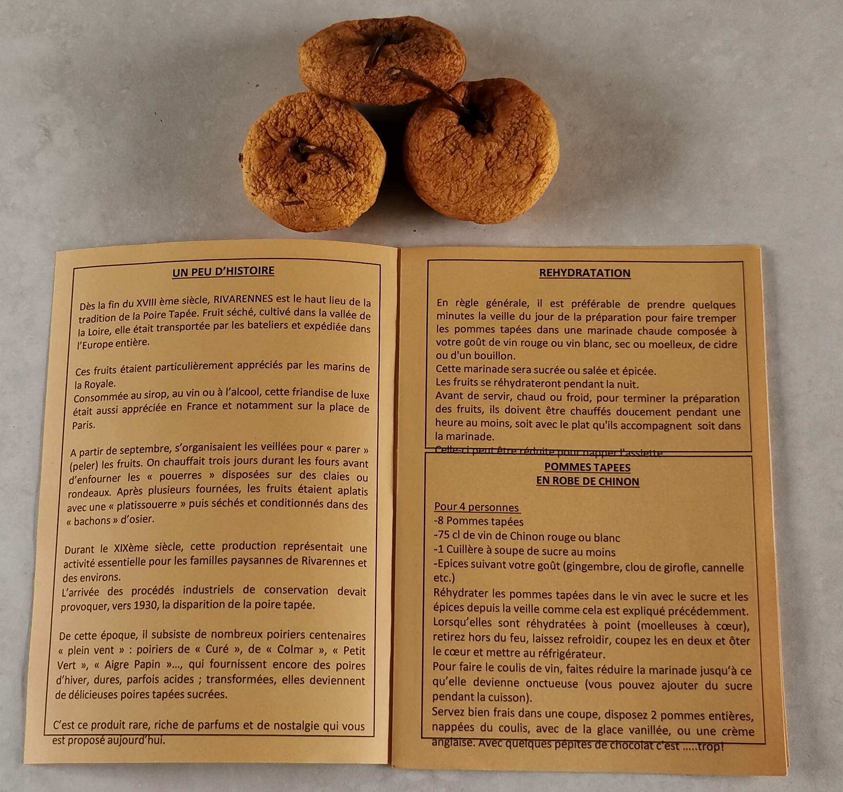 On termine avec une petite friandise, les Pommes tapées. Ce fruit séché, puis réhydraté au moment de sa consommation, était expédié à une époque dans toute l’Europe. Après l’avoir trempé toute une nuit dans le vin régional Saumur-Champigny et réchauffé, c’est plutôt savoureux.