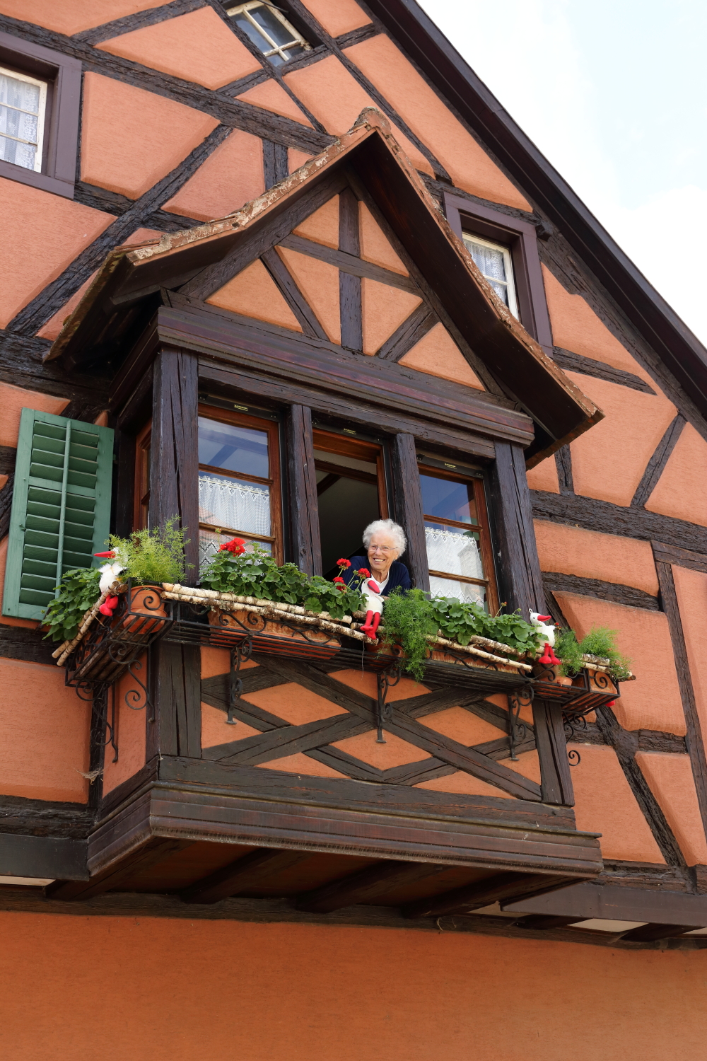 Turckheim, la ville possède encore un veilleur de nuit qui officie à 22 heures tous les soirs. Une habitante toute souriante a bien voulu poser au balcon de sa fenêtre décorée de cigognes.