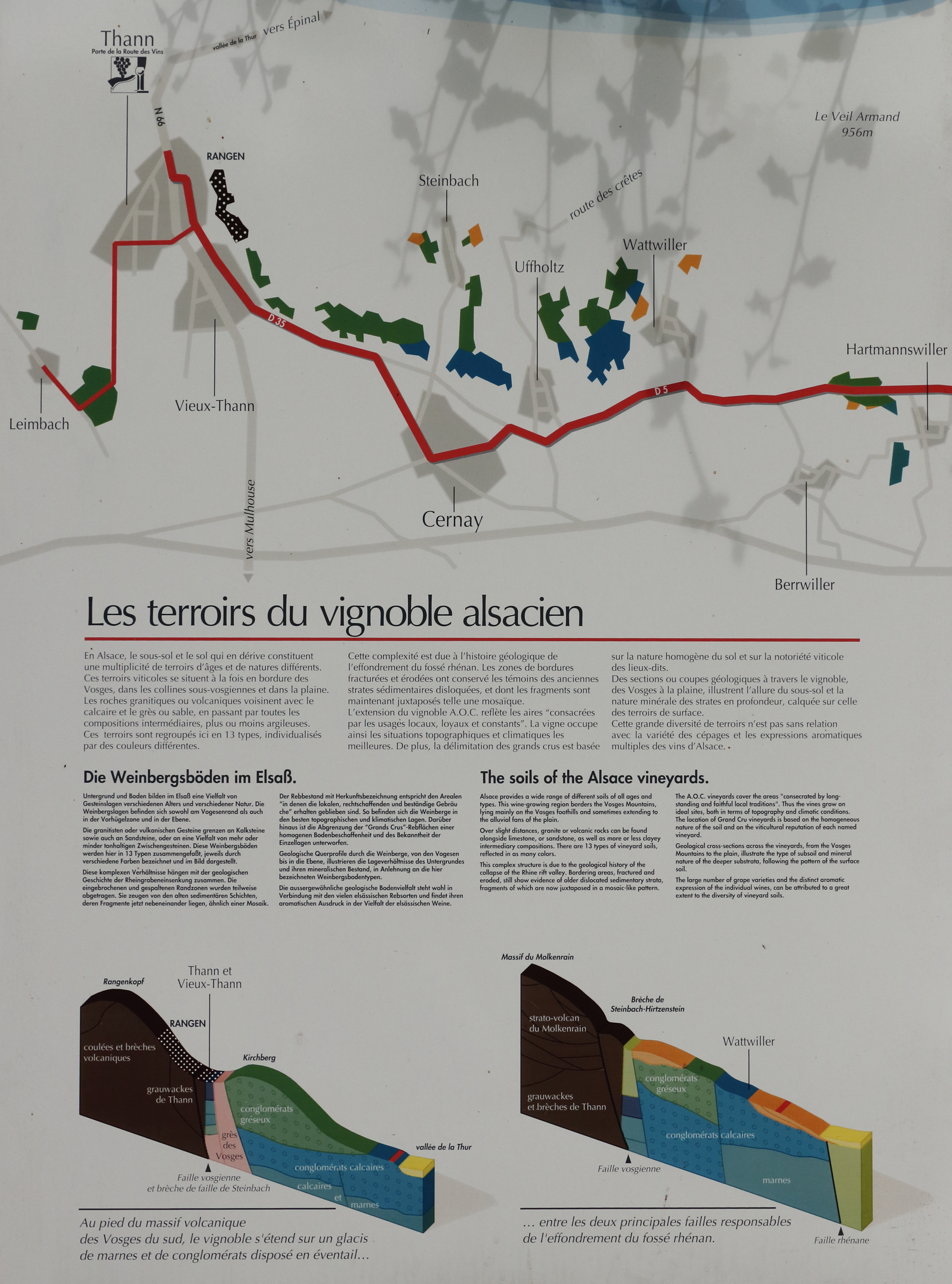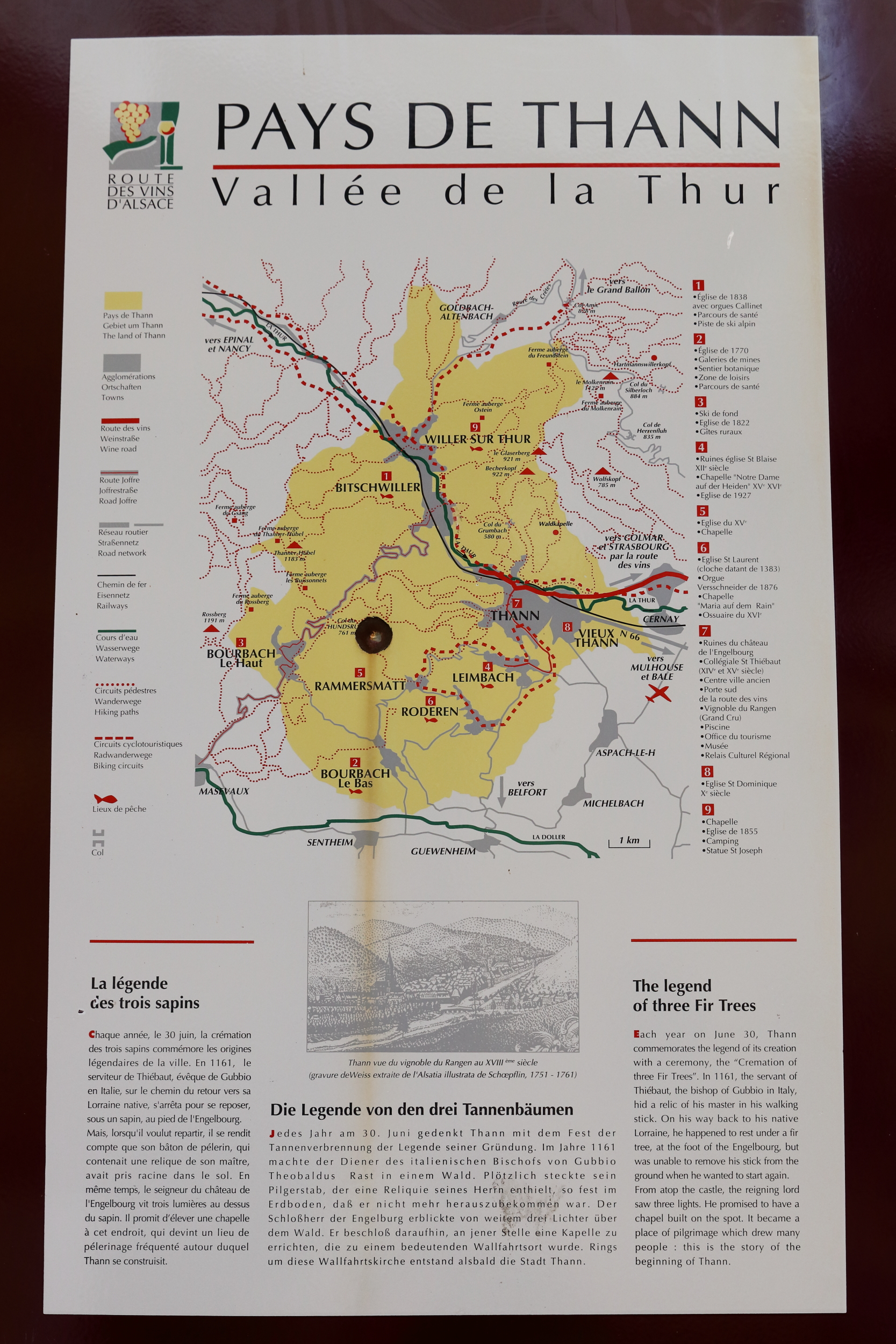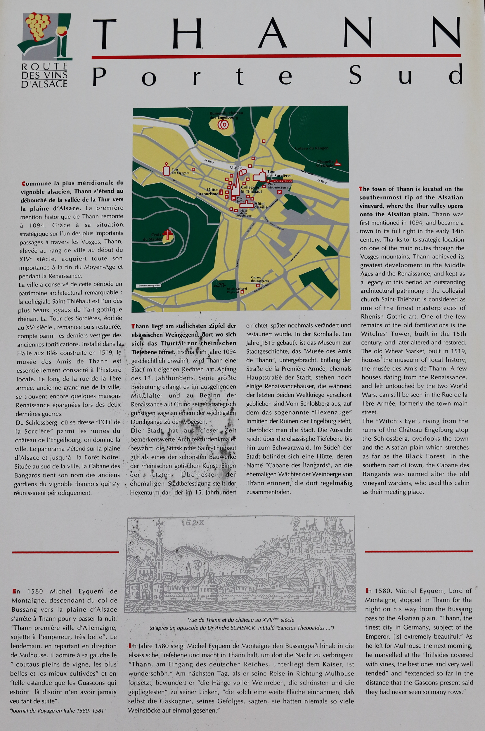 Thann, ce terroir volcanique a donné naissance au grand cru Rangen avec une grande capacité de garde. La collégiale gothique Saint-Thiébaut érigée au XIIIe siècle comporte plus de 500 personnages en parfait état. Sur ordre de Louis XIV, le château d’Engelbourg fut détruit. La tour de celui-ci en basculant forma un morceau arrondi appelé l’Œil de la Sorcière. Son regard porte sur les toits de la commune.