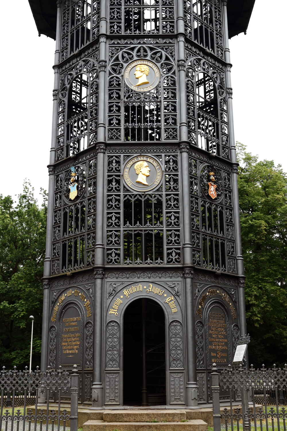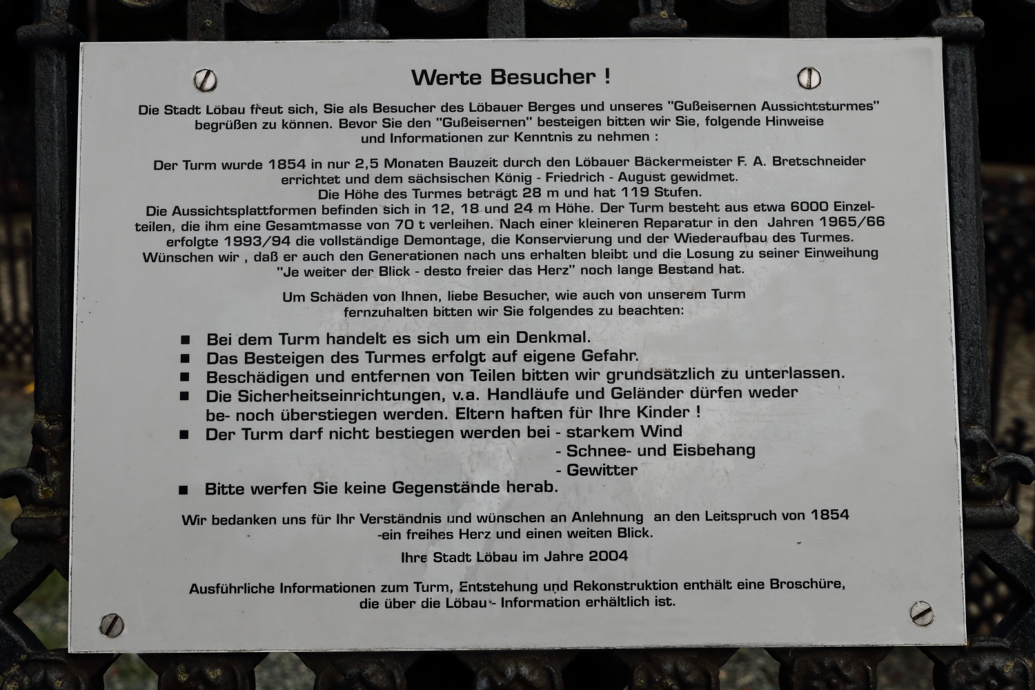 Une petite modification pour JJ nous a conduits chez Reisemobil-Manufaktur en Allemagne. On en a profité pour découvrir un peu plus la Saxe et ses trésors touristiques. C’est un mécano de 6000 pièces représentant 70 tonnes de fonte, haut de 28 mètres, composé de 3 plateformes panoramiques de 12, 18 et 24 mètres de hauteur après une ascension de 119 marches. Assemblé en deux mois et demi en 1854 sur la volonté d’un boulanger-pâtissier en l’honneur de son roi, Friedrich-August, à 15 km de la frontière polonaise et autant pour la Tchéquie.