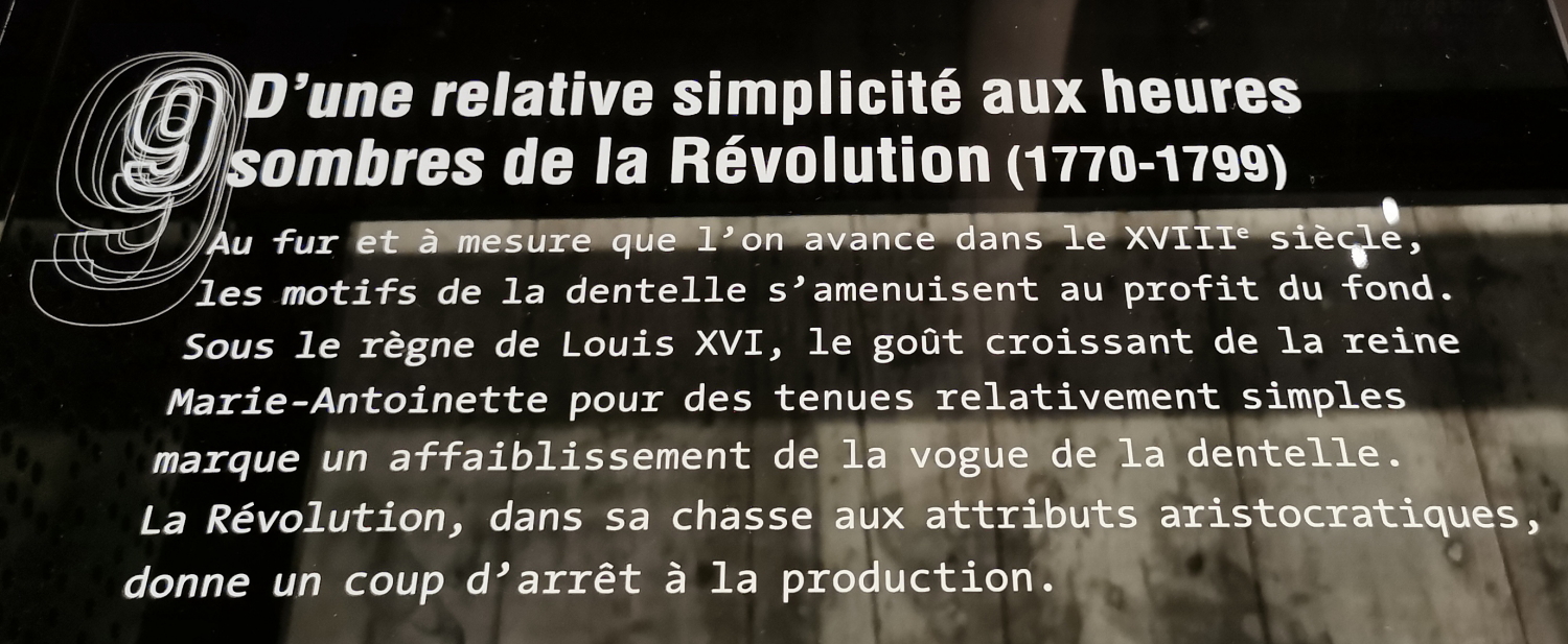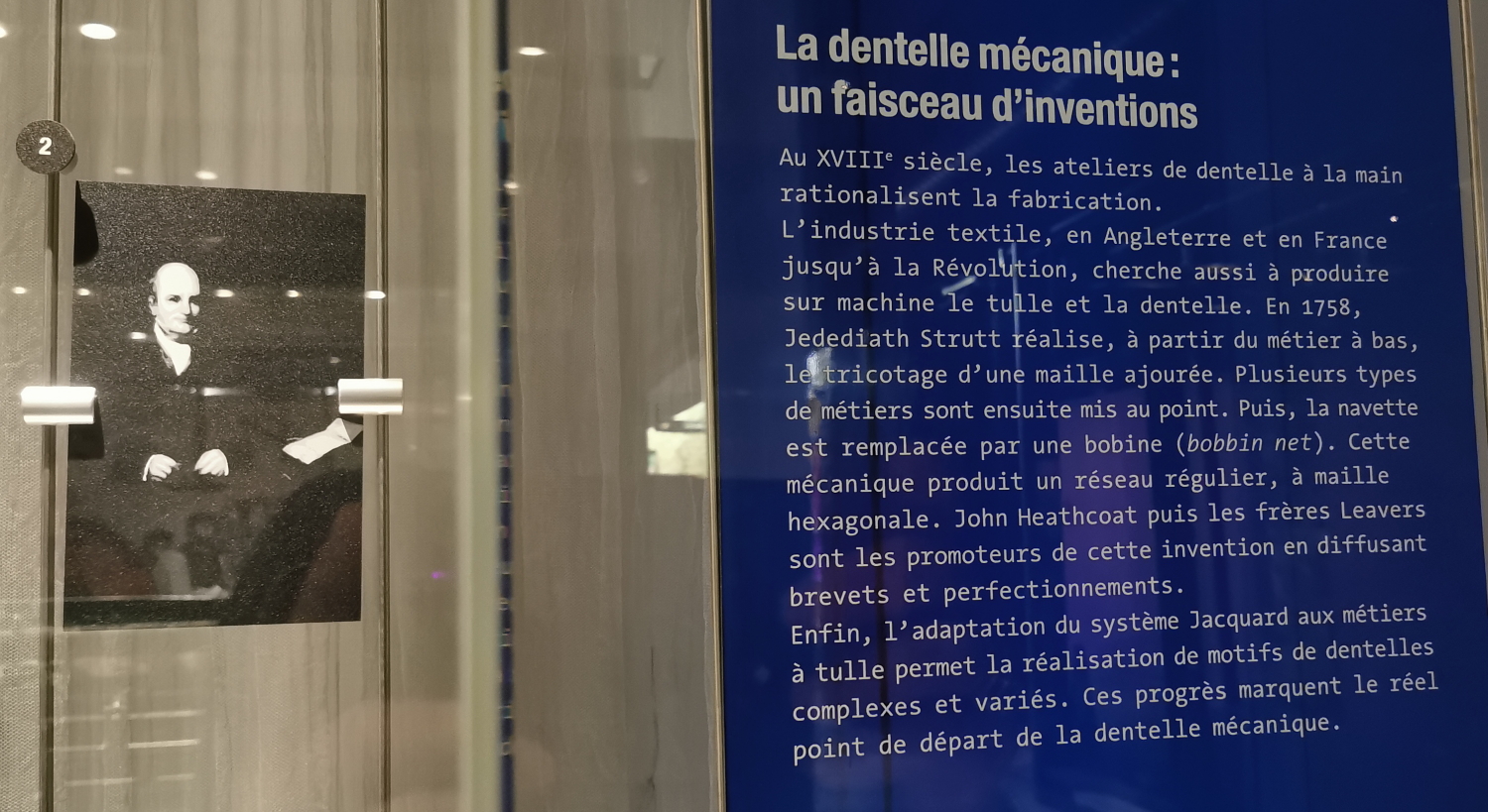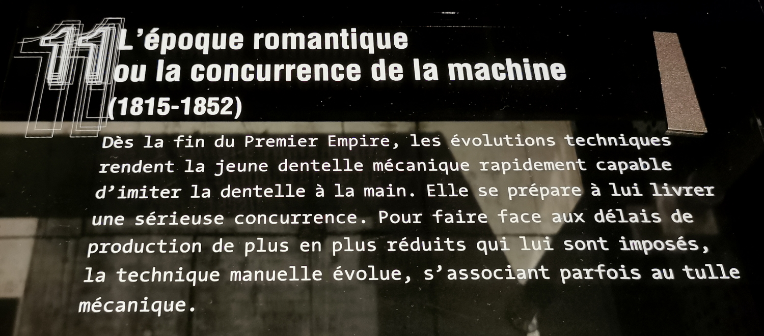 La Cité de la Dentelle et de la Mode, temple de la féminité. La sensualité, le charme, l’apparence sont le maître-mot. Confectionné à la main, cela demande une attention rigoureuse et minutieuse. Avec les machines, contrairement à l’orgue de Barbarie, sur le papier perforé, l’outil ne travaille pas lorsqu’il tombe dans un trou.