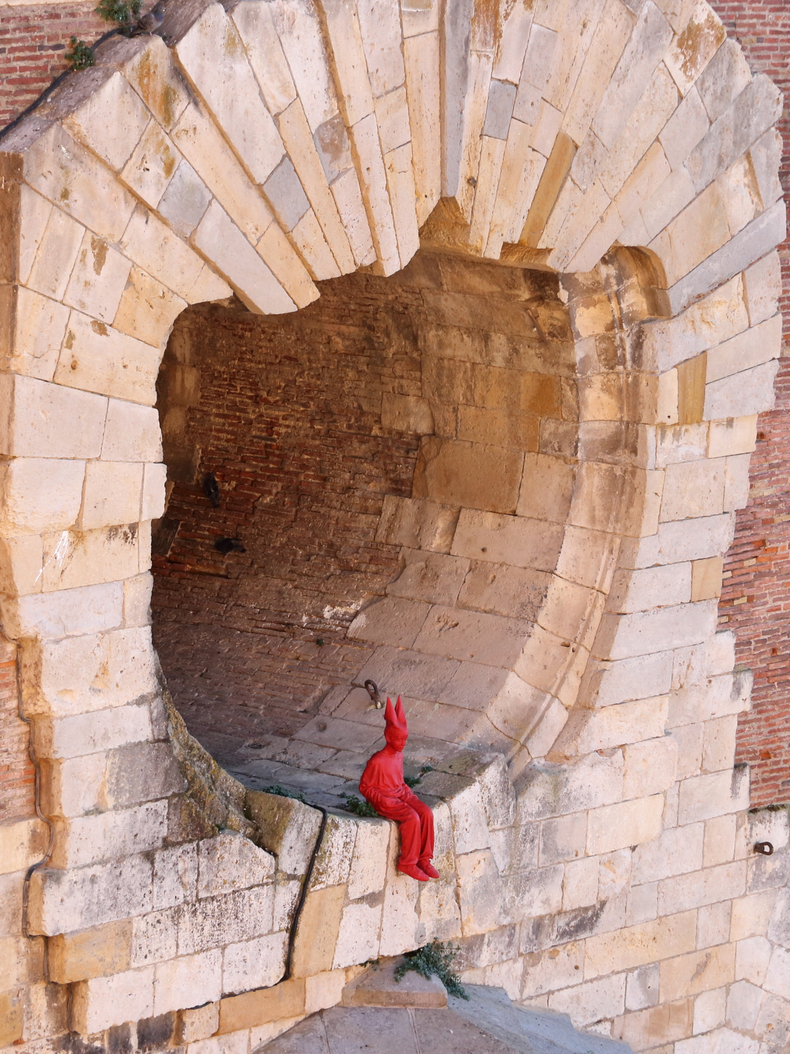 L’enfant au bonnet d’âne, sculpture rouge au Pont-Neuf de l’artiste James Colomina, représente les stigmatisés de notre société. Sous le soleil de l’après-midi, sur les quais de la Garonne, la passion des cœurs se reflète dans le lit du fleuve.