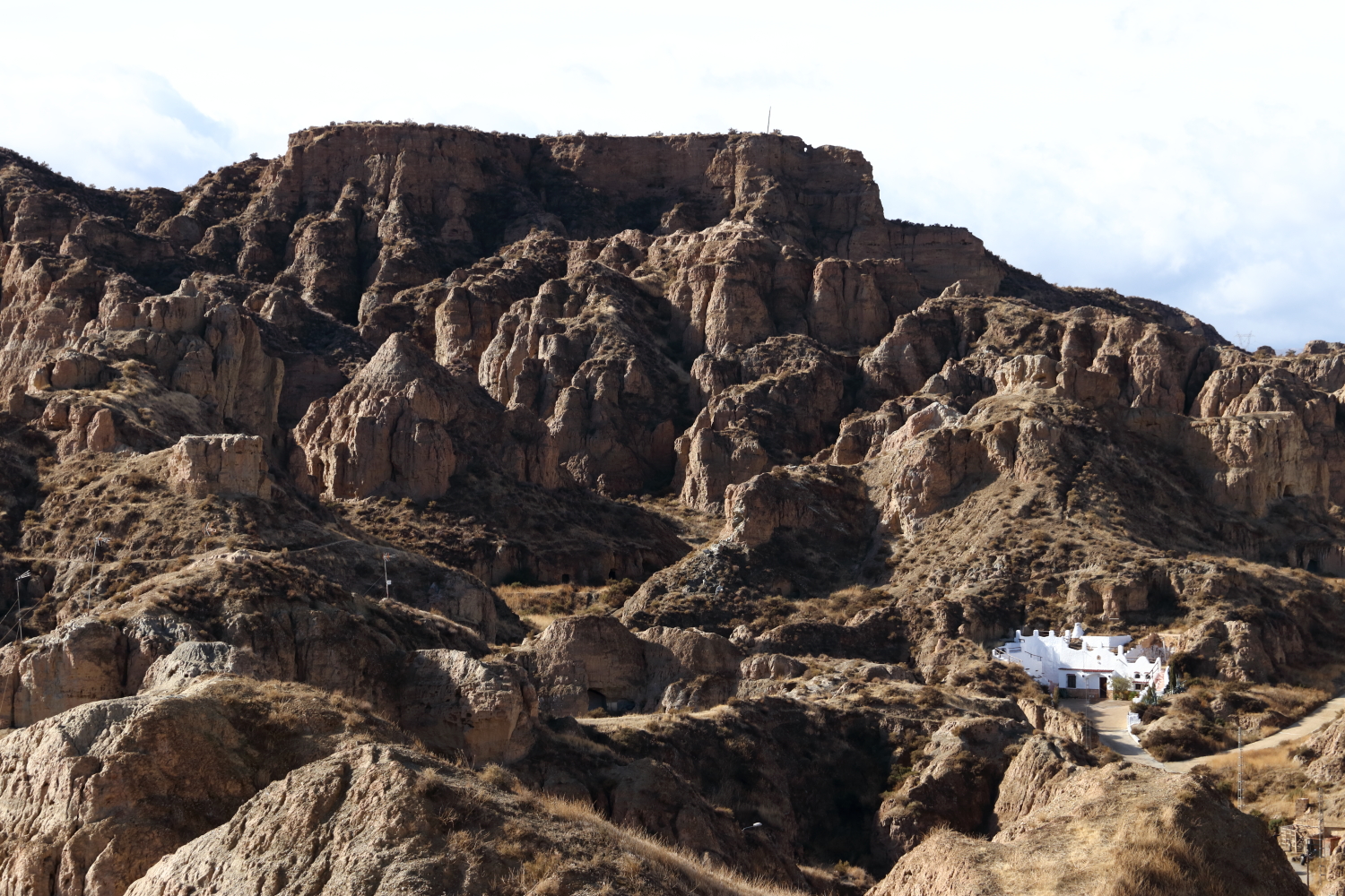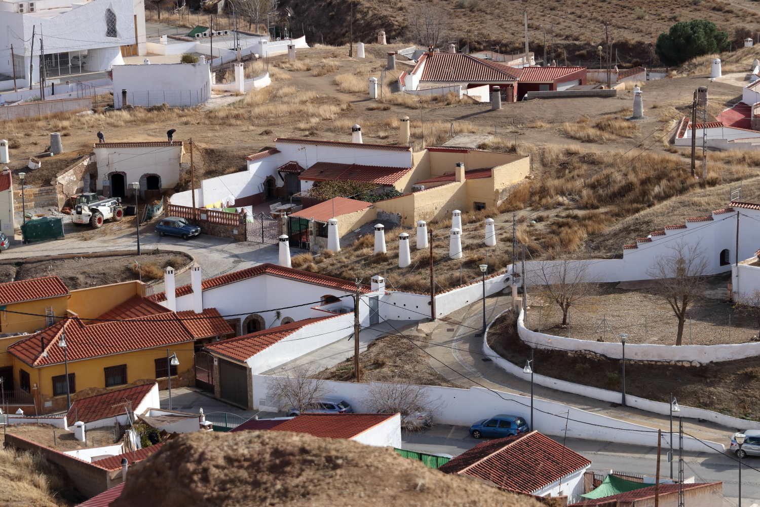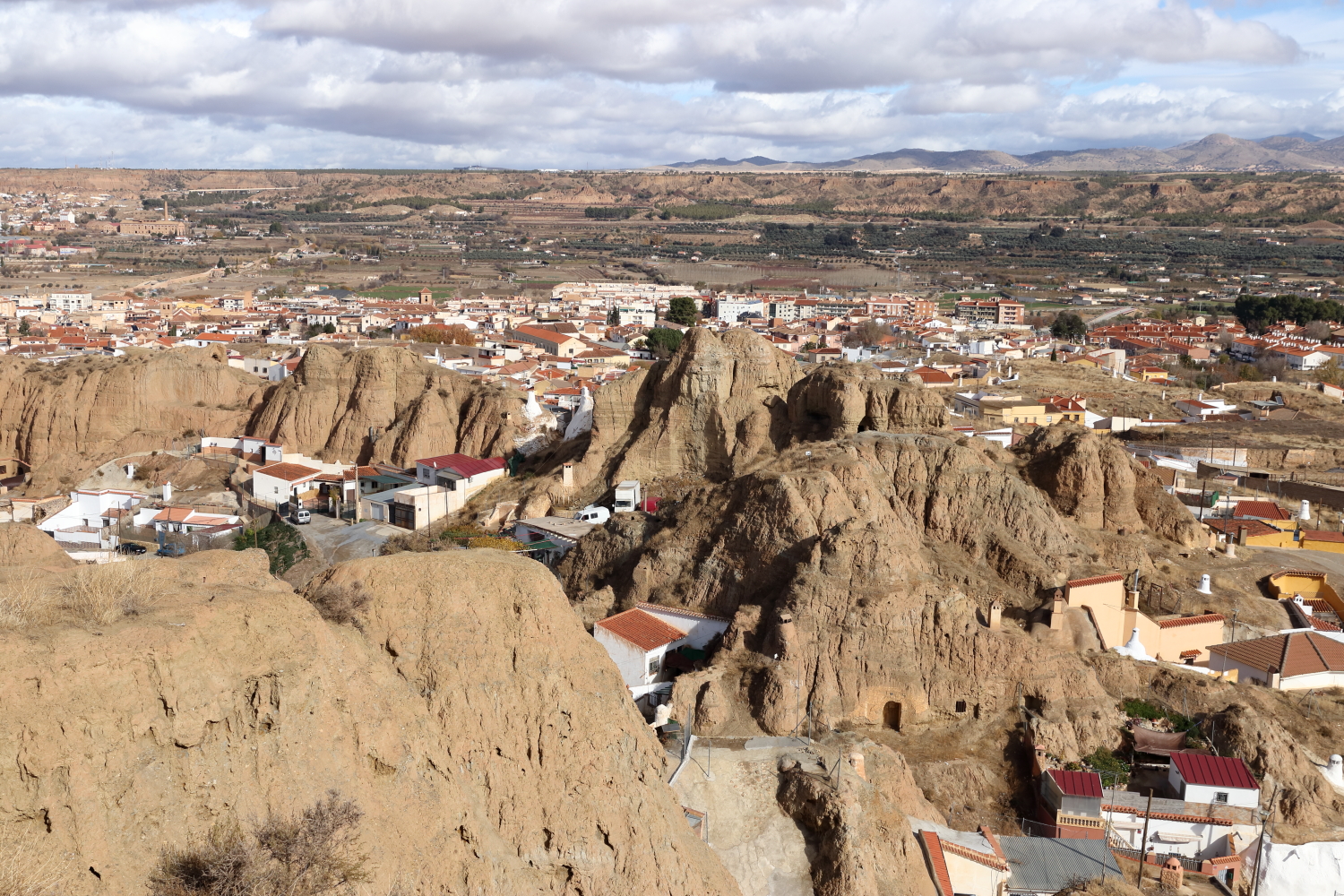 Et le plus insolite, celui des maisons troglodytiques (casas cuevas) remontant au Xe siècle. Avec un dédale de ruelles et de venelles, en marchant quelquefois sur le toit d’habitations, nous arrivons au plus spectaculaire. Sur un des spots de la ville, on se rend compte de cette termitière. Les maisons troglodytiques sont semi-enterrées et les cheminées poussent comme des champignons. La terre qui compose les troglodytes reste assez friable, un mélange de sable caillouteux de couleur ocre rouge. Difficile d’évaluer la surface habitable de cet habitat traditionnel creusé dans tous les sens.