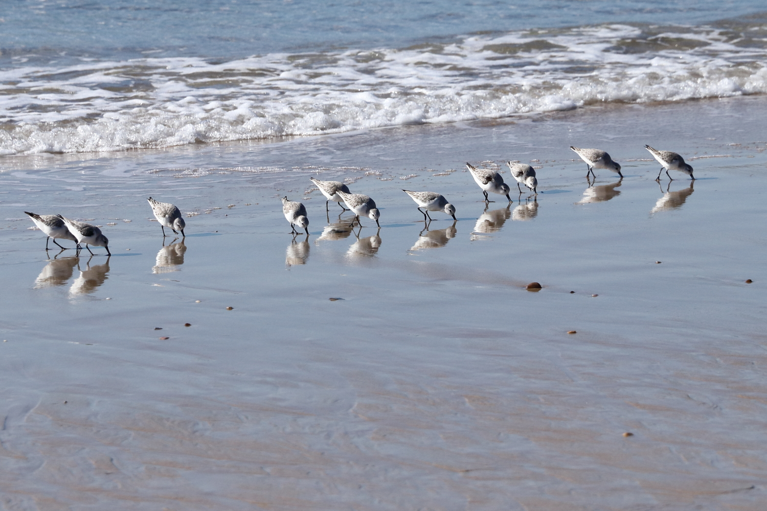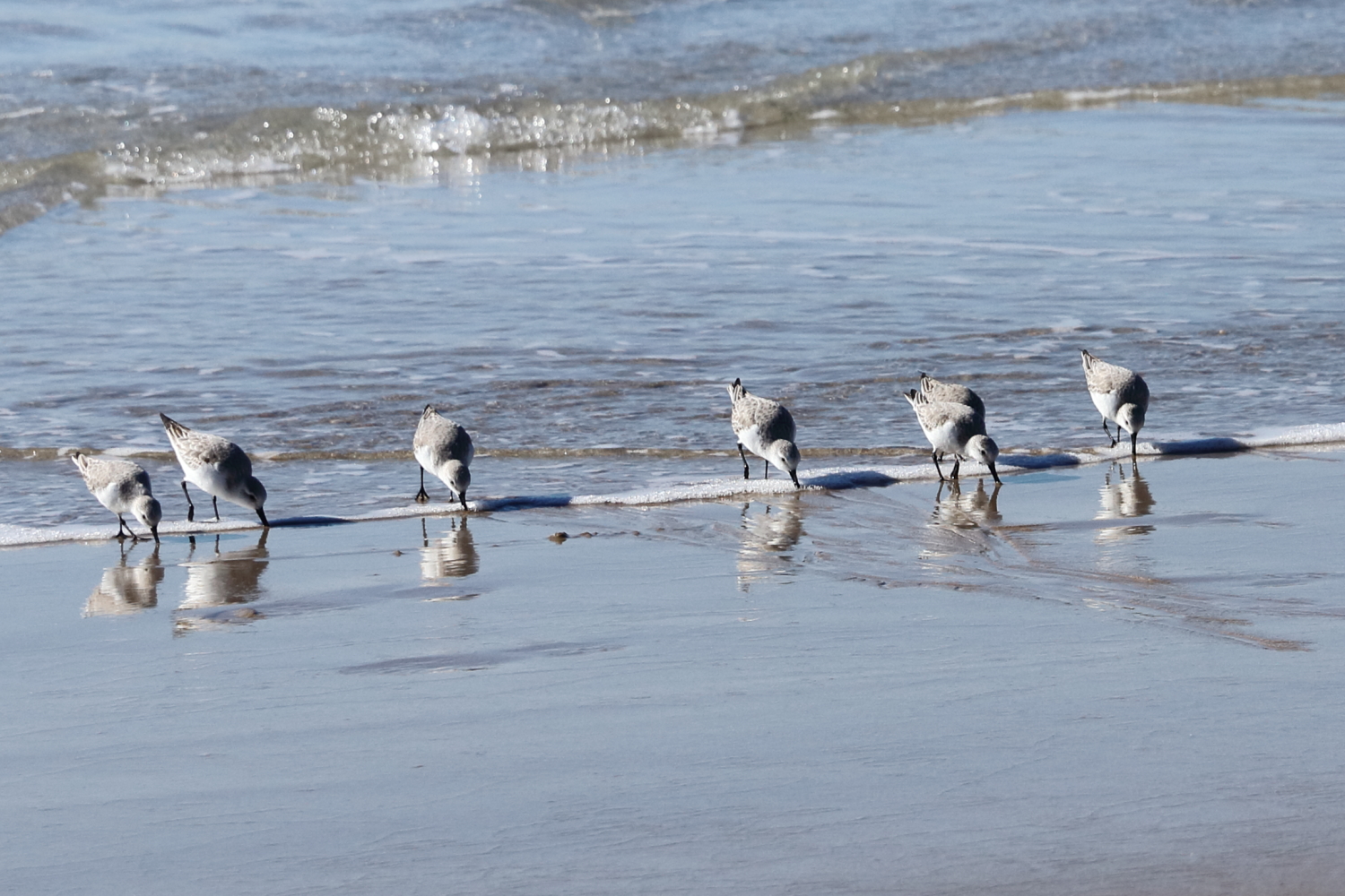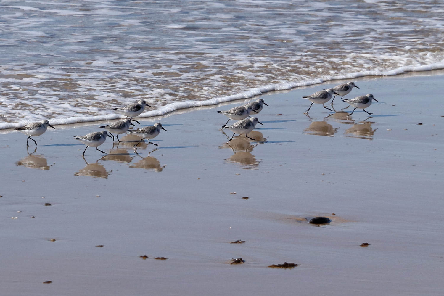 Lorsque la vague arrive, les bécasseaux Sanderling commencent à courir avec la précision d’un défilé militaire. C’est adorable et trop marrant dans le mouvement. C’est un grand migrateur qui se reproduit dans la toundra au niveau de l’Arctique. En revanche, à force de photographier les oiseaux, je ne vais pas tarder à valider ma thèse en ornithologie.