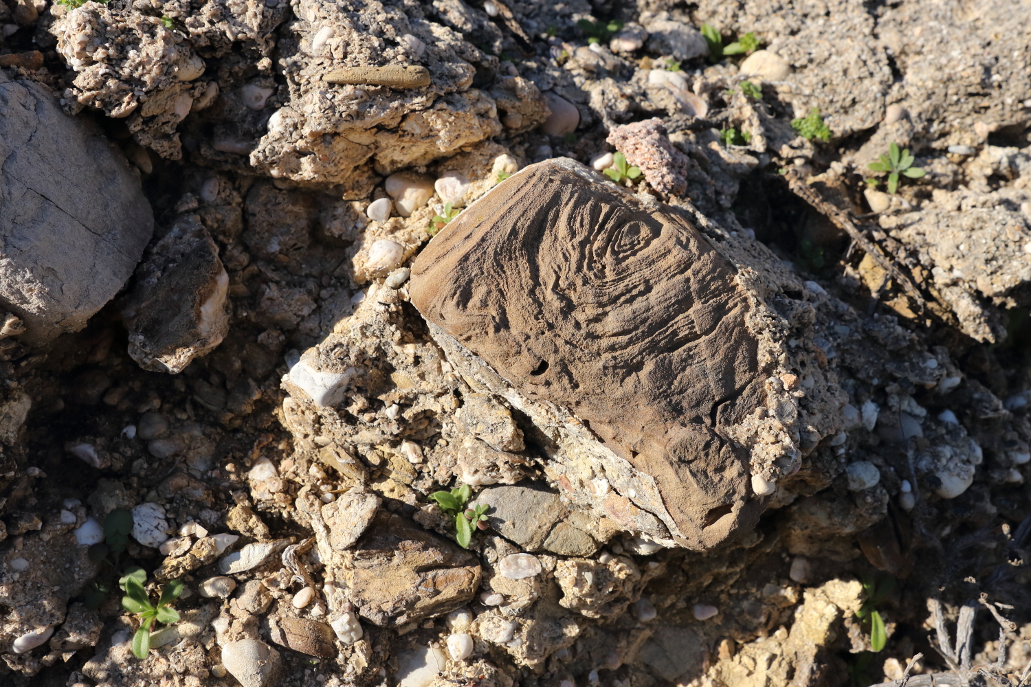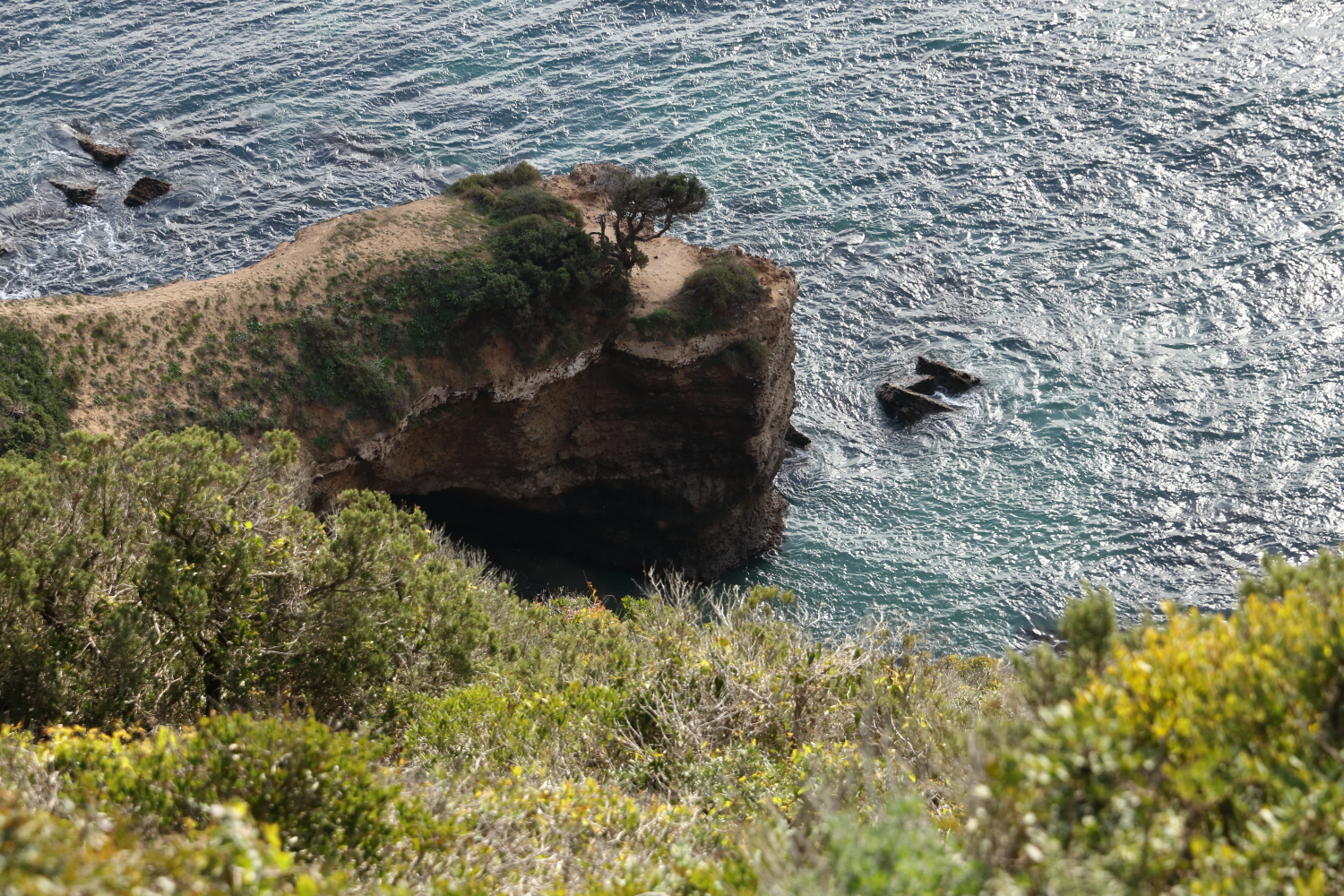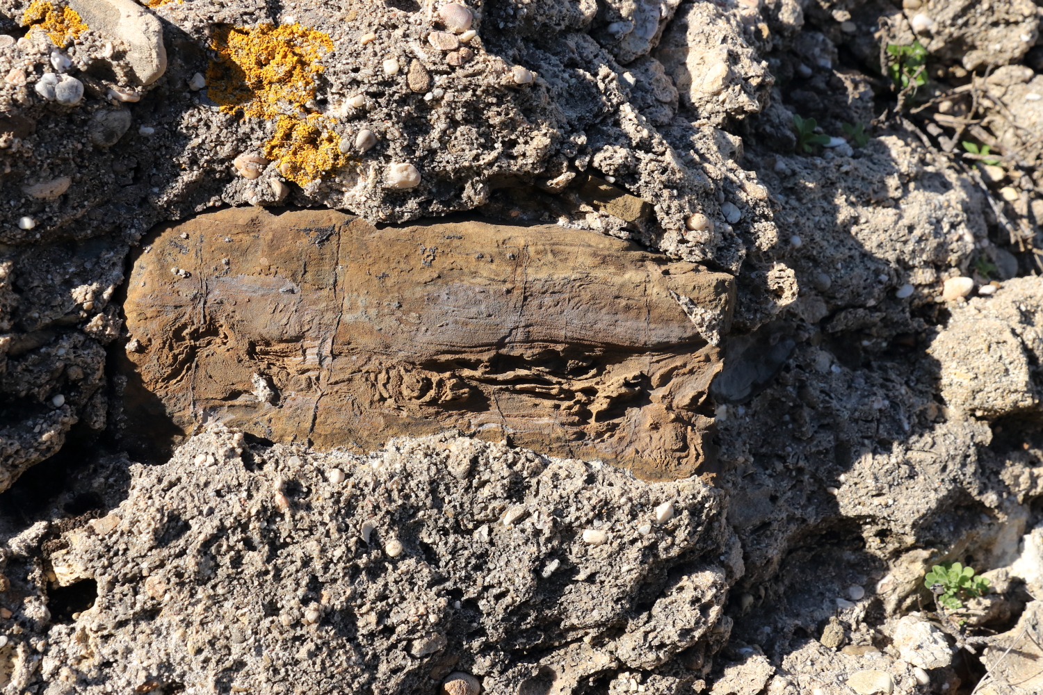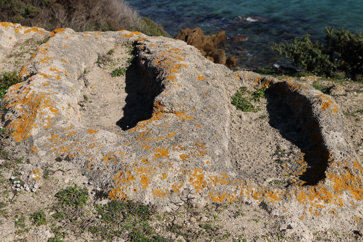 Sur le trait de côte qui avance dans l’océan, on a supposé que les deux cavités étaient des tombes et le matériau incrusté dans la roche du bois fossilisé. Désolé, je n’ai pas encore validé ma thèse en archéologie.