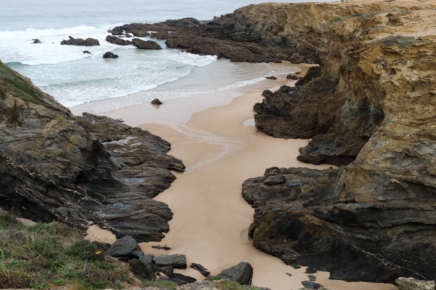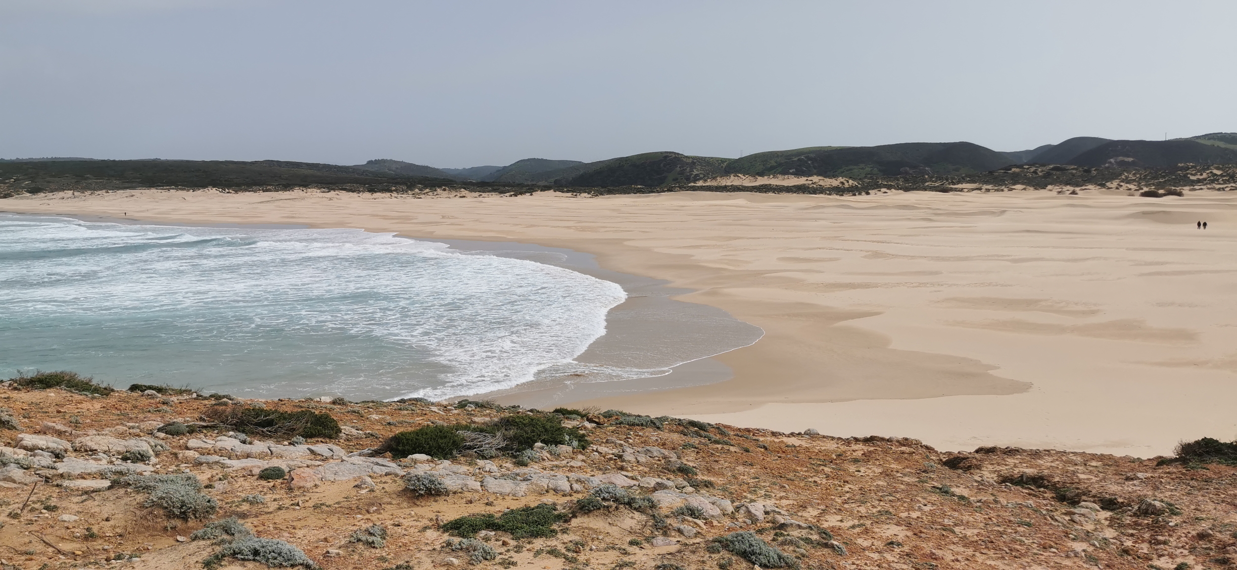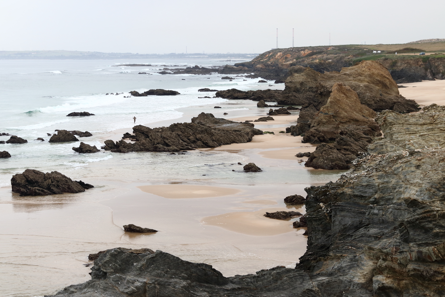 Nous allons couvrir dans un premier temps la côte atlantique portugaise jusqu’à Lisbonne. En quittant Sagres, après 23 km, nous stoppons sur la plage de Bordeira. Face à l’immensité de Dame Nature, notre taille humaine lilliputienne ne fait qu’amplifier les beautés du paysage.