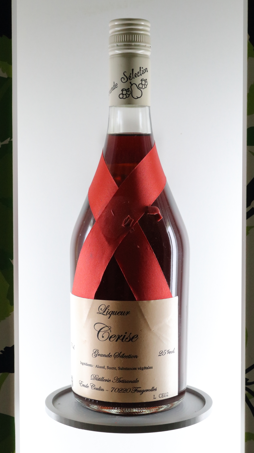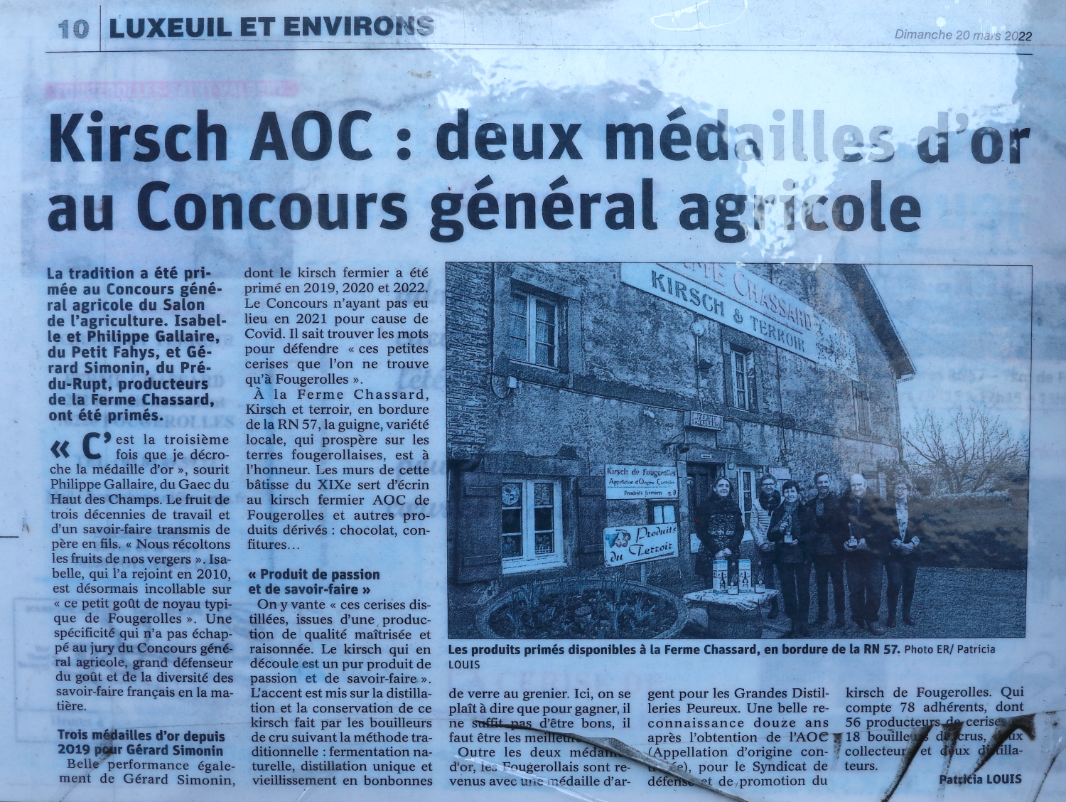 Nous sommes en Haute-Saône, sur la commune de Fougerolles-Saint-Valbert, le pays de la cerise et du Kirsch (AOC). Elle a compté jusqu’à 400 bouilleurs de crus et 40 distilleries. 10 000 arbres produisent potentiellement chaque année 500 tonnes de cerises et 35 000 litres de Kirsch après distillation.