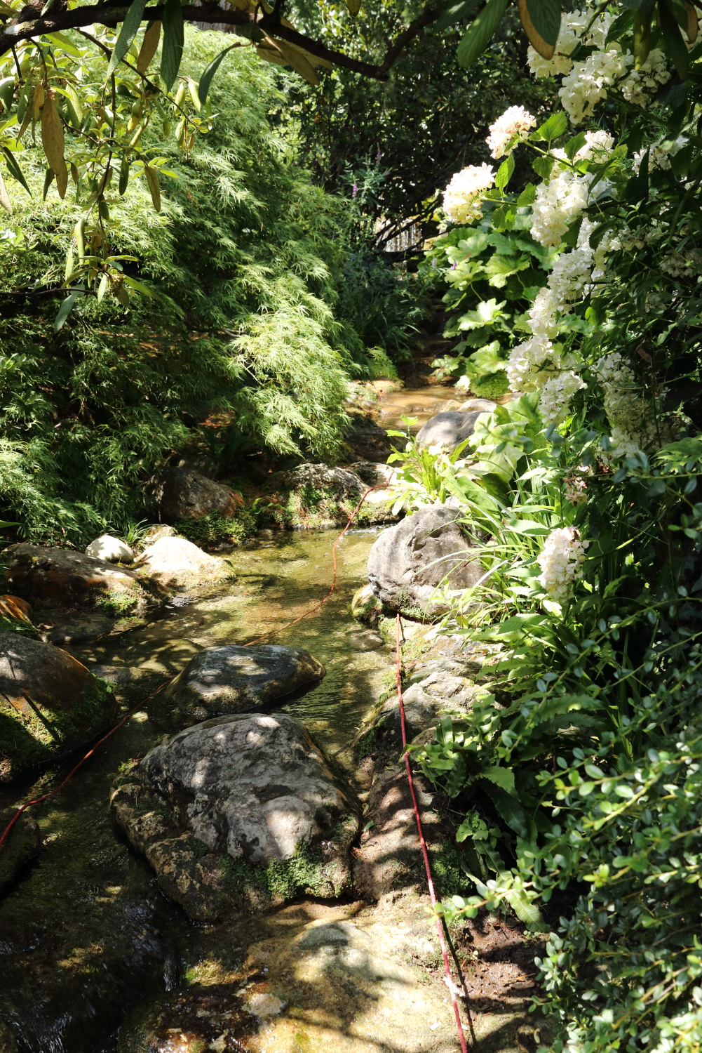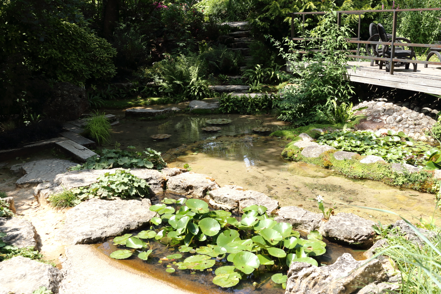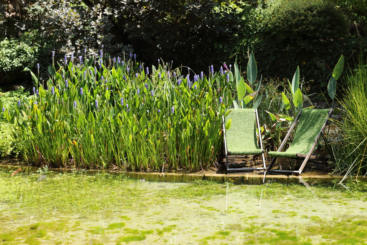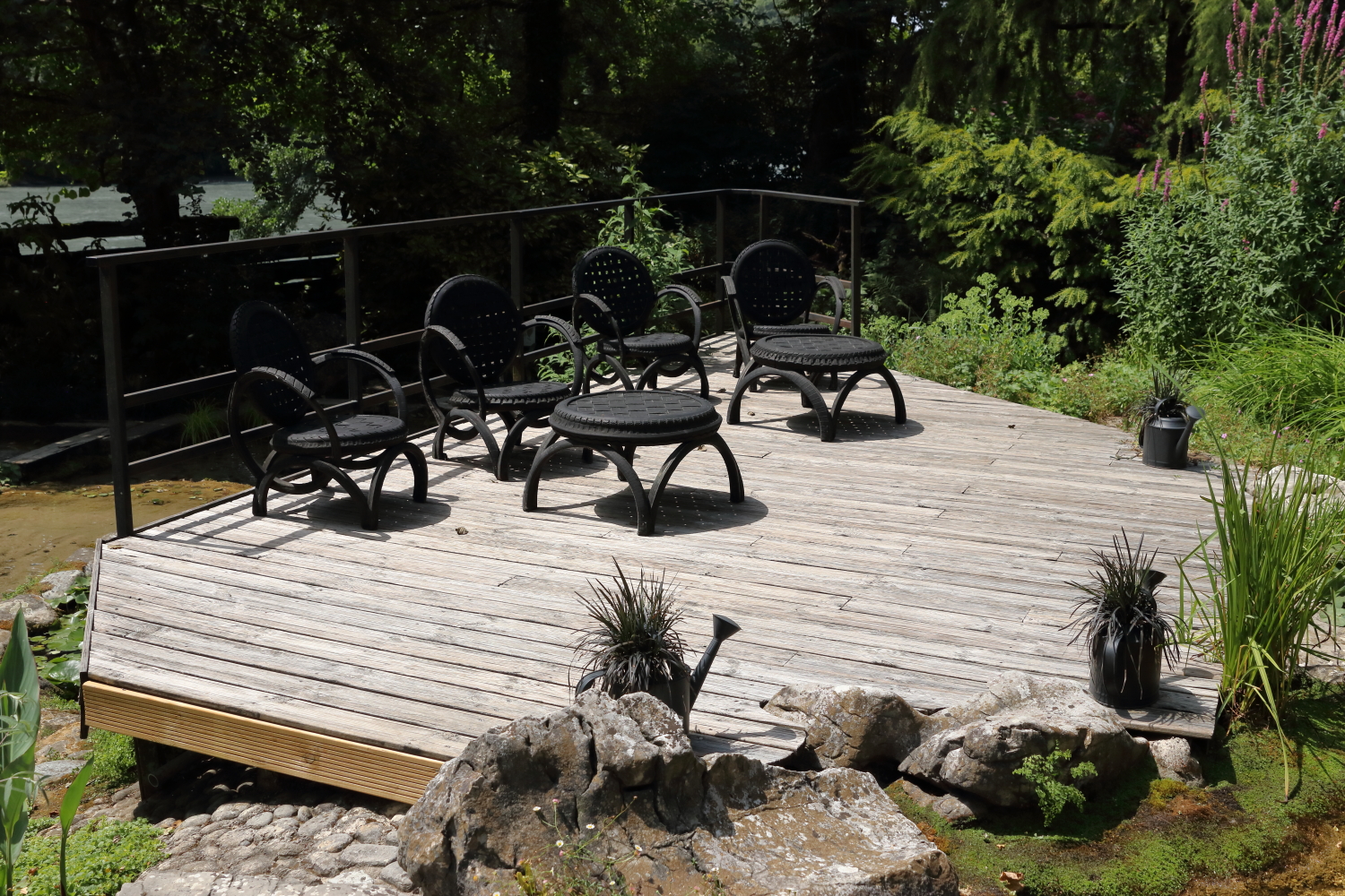 Tout au long de la visite, le mobilier de jardin permet d’en apprécier le cadre. Son exposition lui assure un microclimat où l’eau des bassins ne descend jamais en dessous de 10 °C.