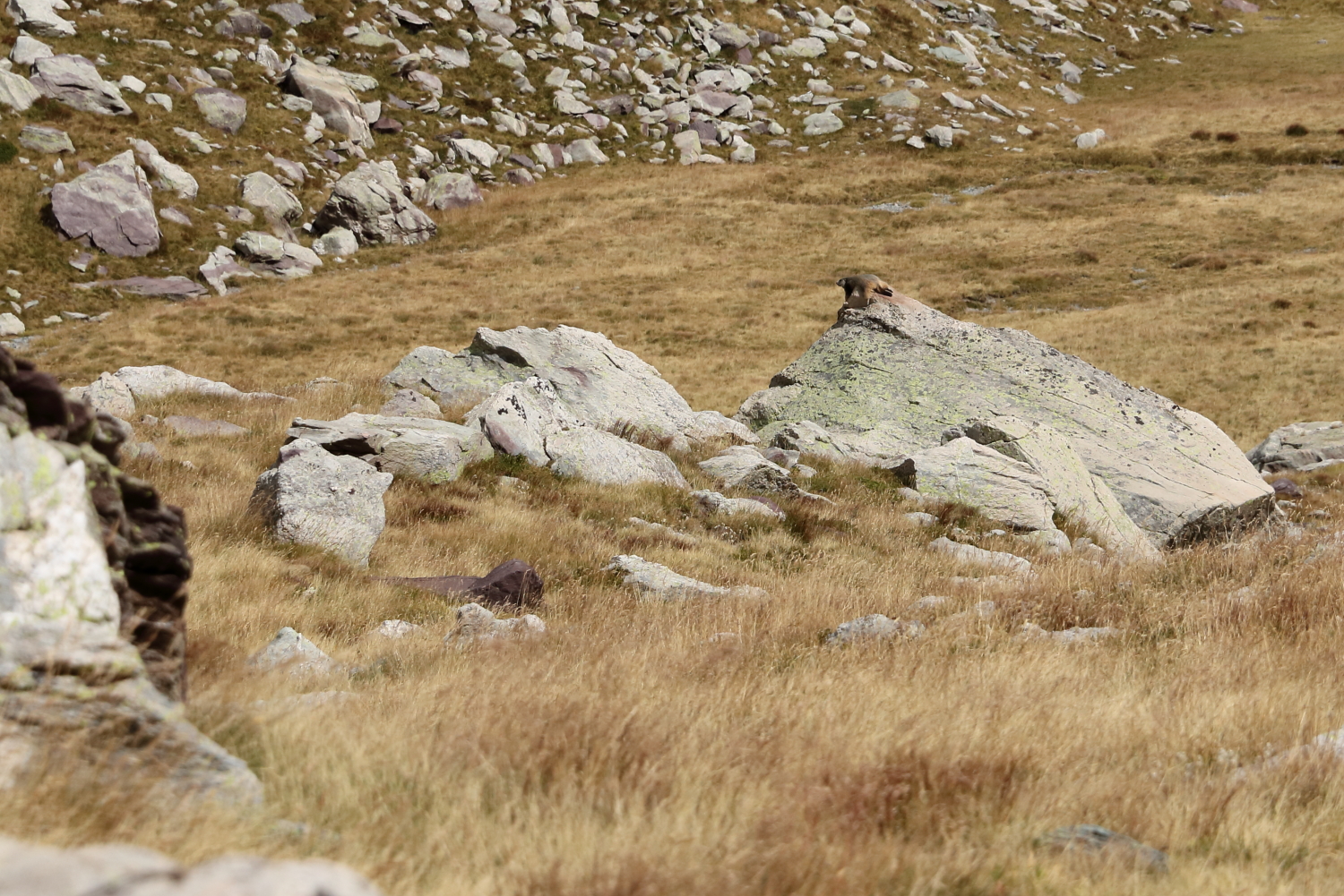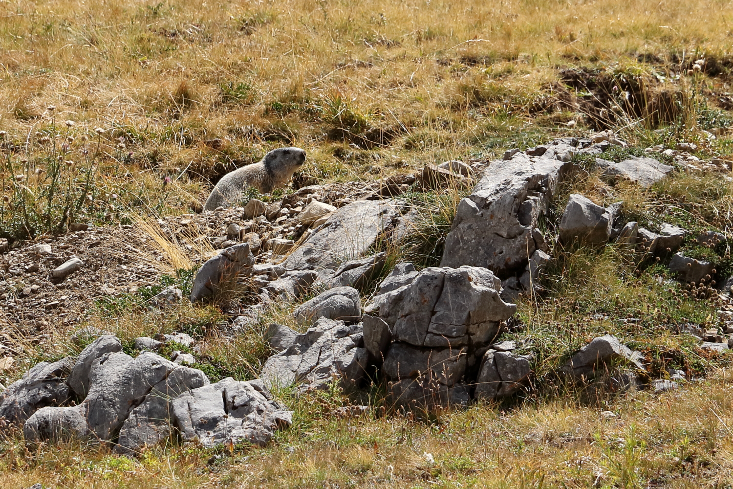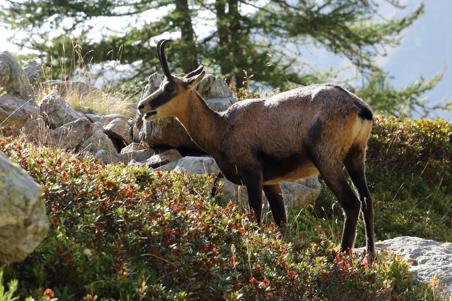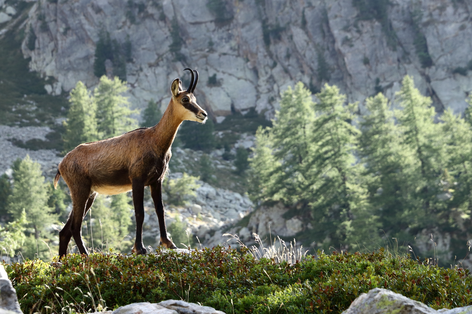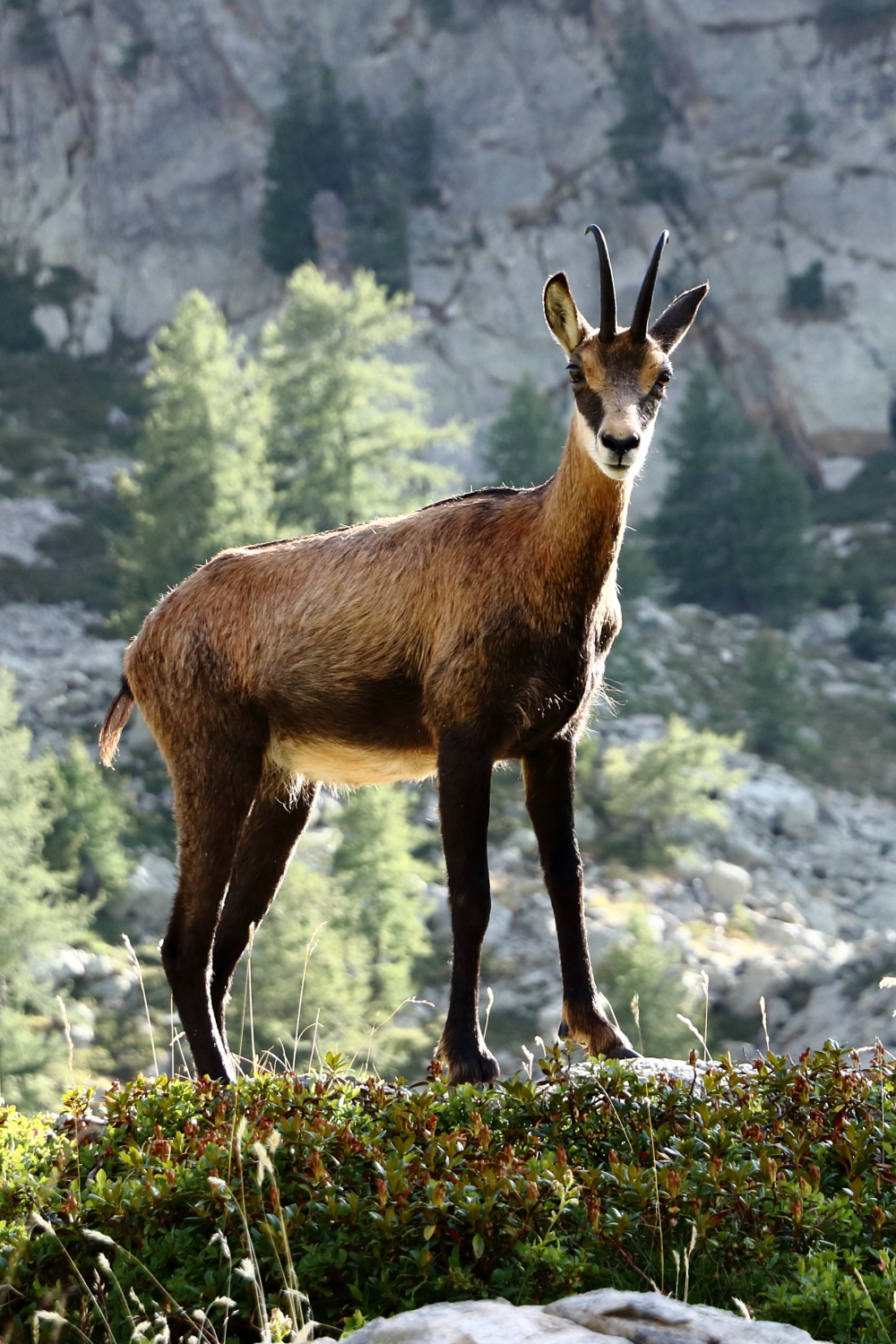 À mi-chemin, face à des chamois, j’exulte derrière ma boîte à images… Notre calme apparent a peut-être contribué à cette belle rencontre. Sur son rocher, une marmotte s’étire au soleil.