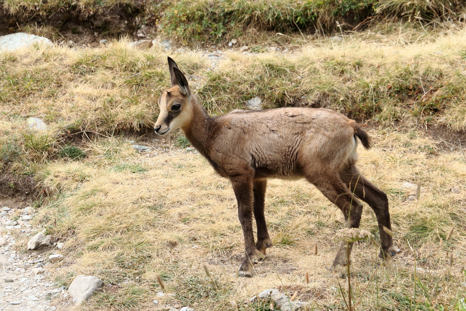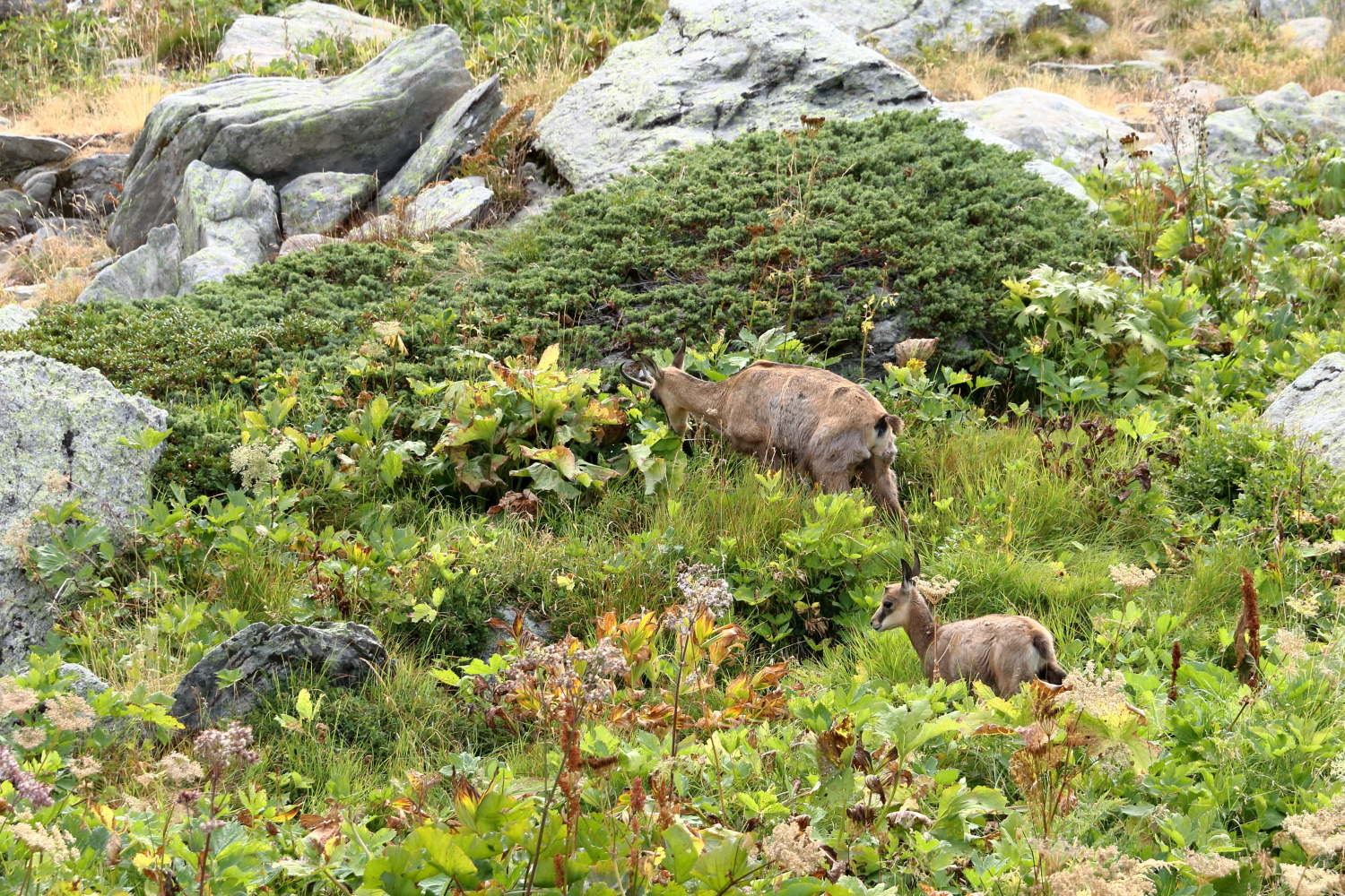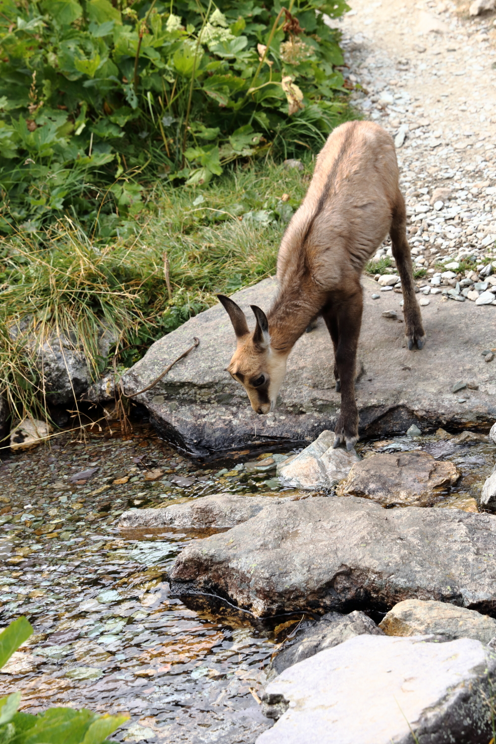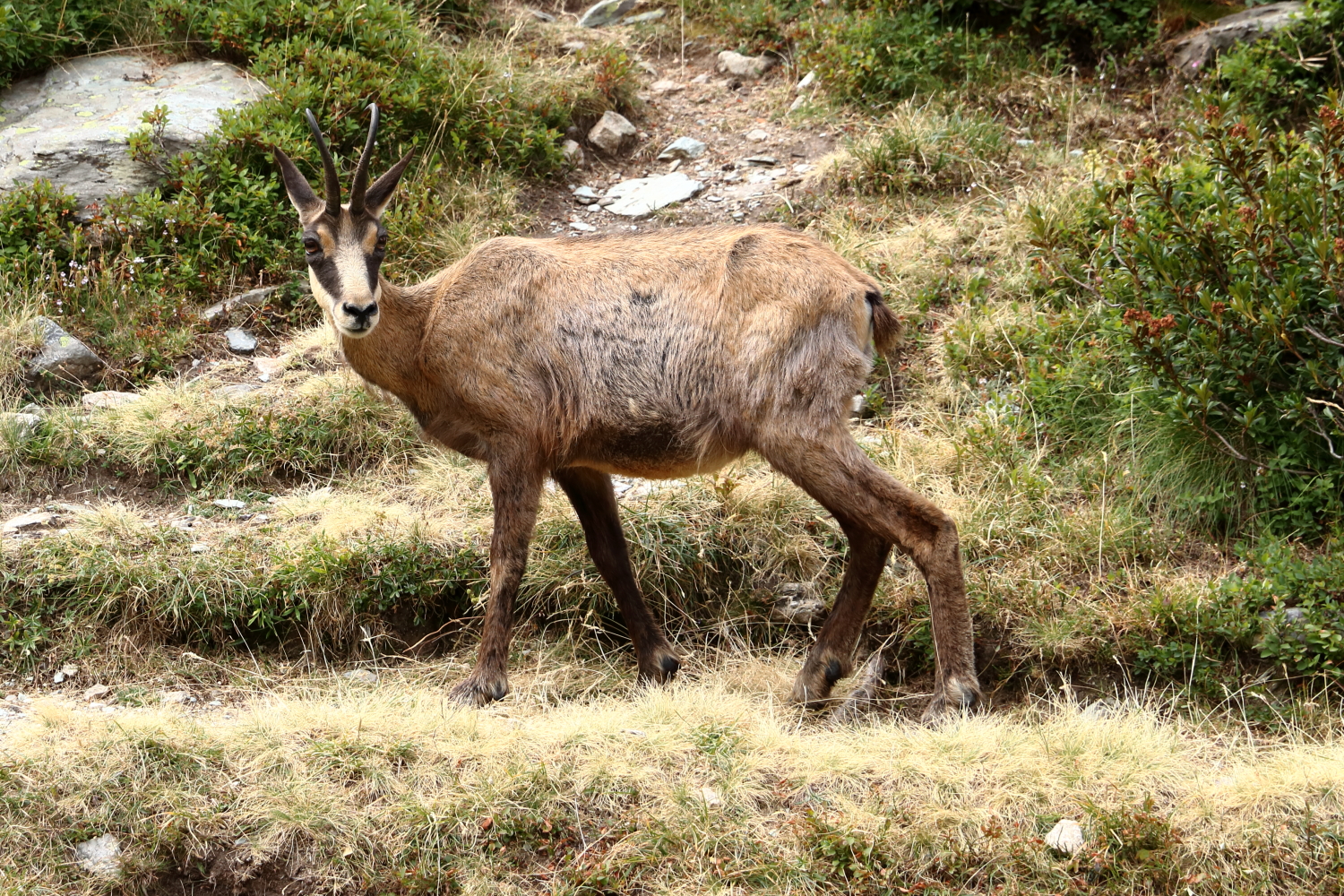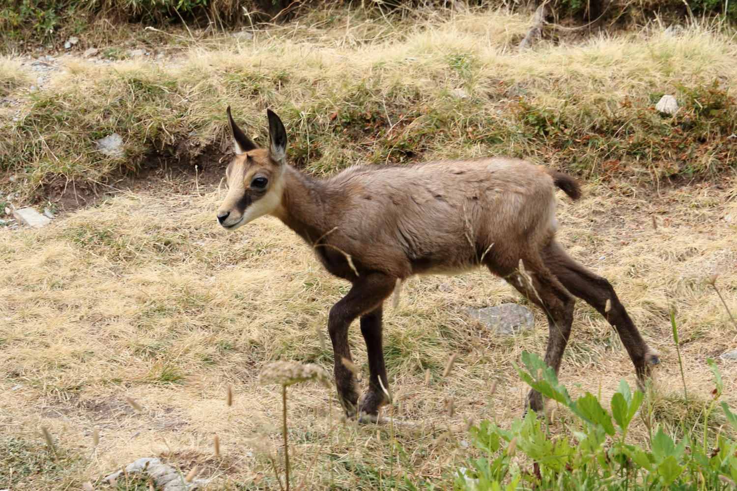 À mi-chemin, face à des chamois, j’exulte derrière ma boîte à images… Notre calme apparent a peut-être contribué à cette belle rencontre. Sur son rocher, une marmotte s’étire au soleil.