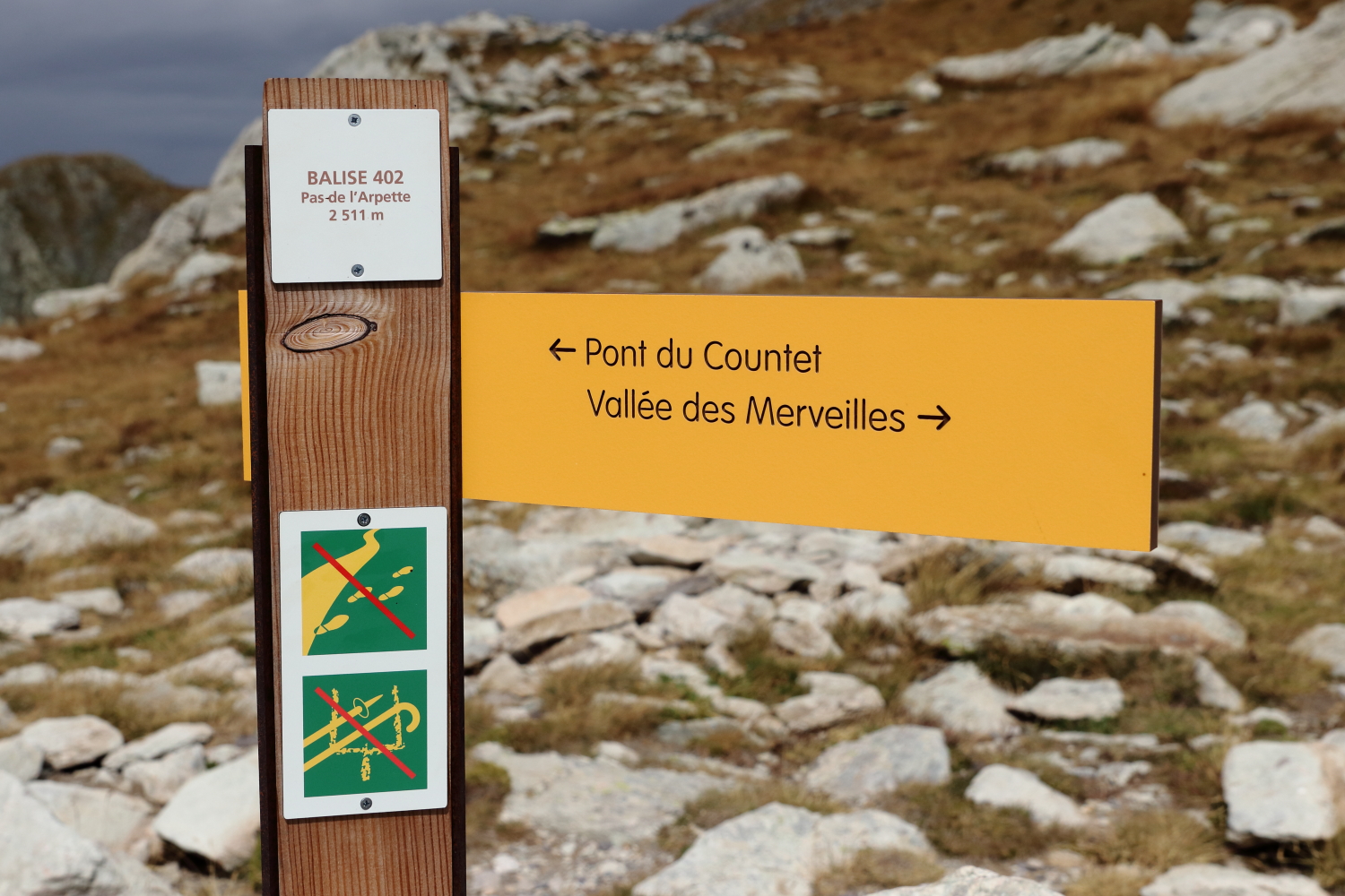 Une randonnée qui va pousser nos capacités physiques à ses limites. Départ du parking du pont du Countet (1687 m) pour rejoindre le refuge de la Vallée des Merveilles (2111 m) en franchissant le Pas de l’Arpette (2511 m), dénivelé positif 824 m, négatif 395 m, difficulté moyenne, distance 5,84 km, durée moyenne 4 h 00. On a beau connaître ces informations, la nature du terrain est toujours une inconnue…