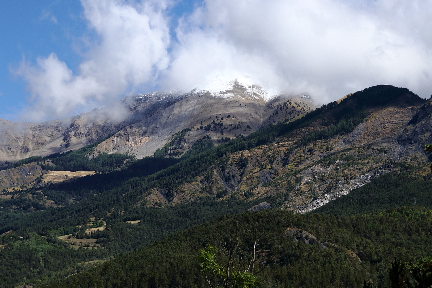 Après deux jours de pluie intensive, on est passé de 36° C à 14° C en une journée. Au moment de reprendre la route, les cimes étaient enneigées.