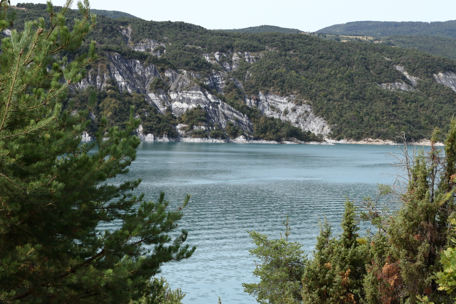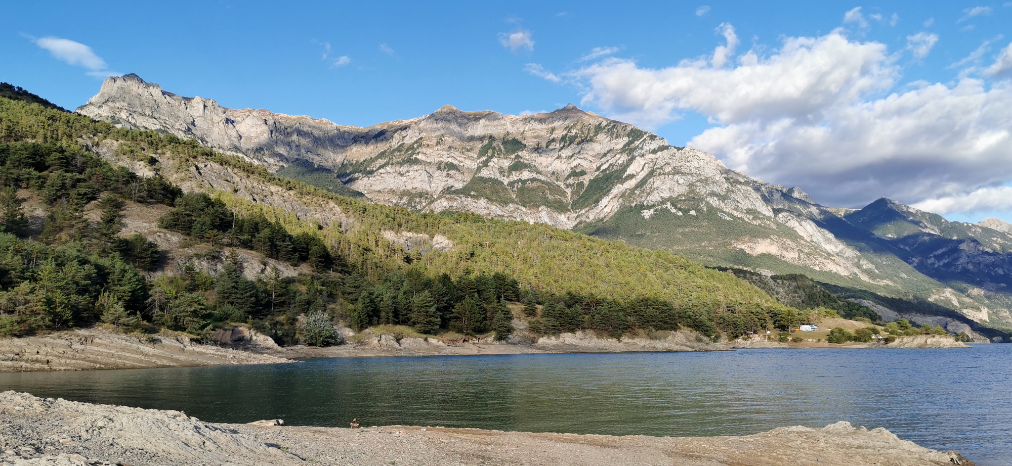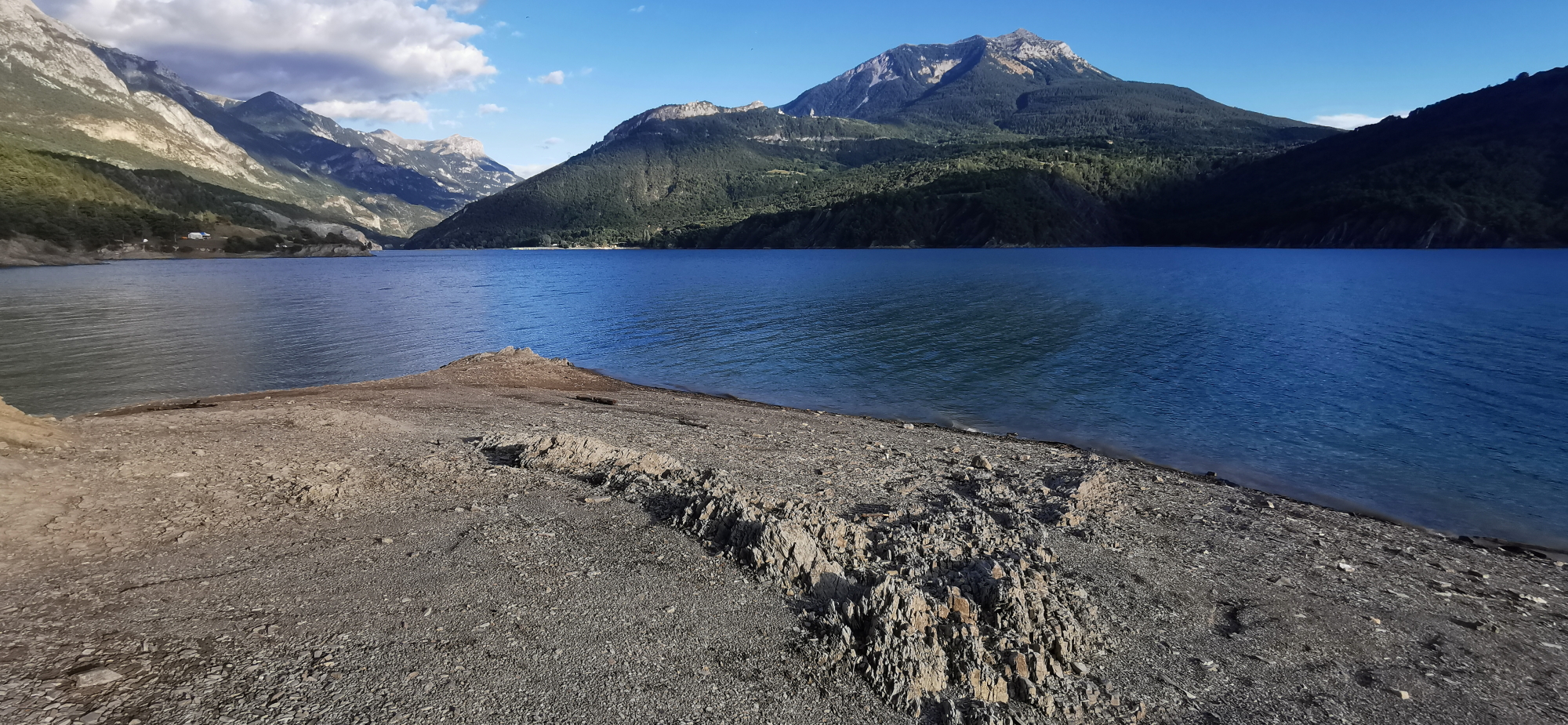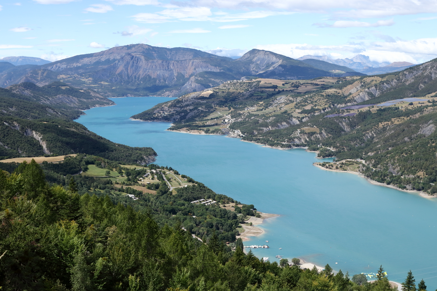 Nous poursuivons notre route dans la vallée de l’Ubaye avec des paysages toujours aussi grandioses. Au détour d’un promontoire, le lac de Serre-Ponçon nous apparaît dans une belle couleur émeraude.