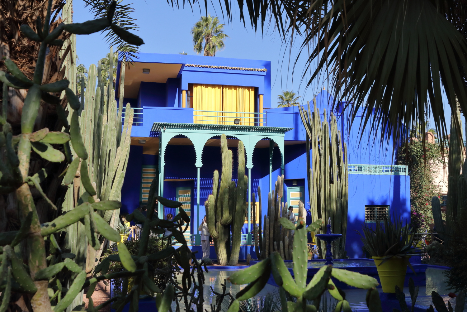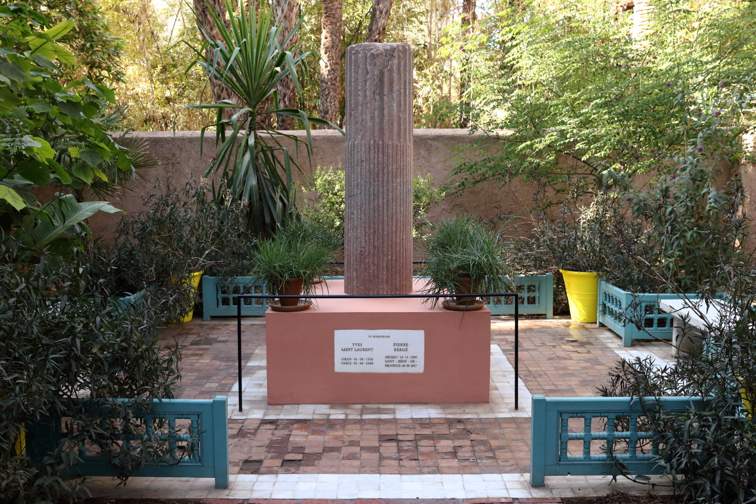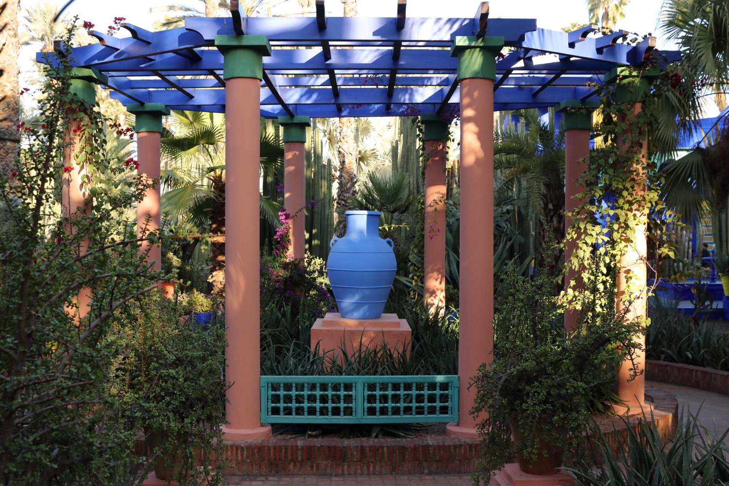 Passionné de botanique, le peintre Jacques Majorelle a créé en 1931 un jardin avec des espèces venues du monde entier. Il a teinté les murs de sa propriété d’un bleu outremer qu’il a lui-même élaboré, le bleu Majorelle. Voué à la destruction pour un projet immobilier, Yves Saint-Laurent et Pierre Bergé l’ont racheté en 1980.