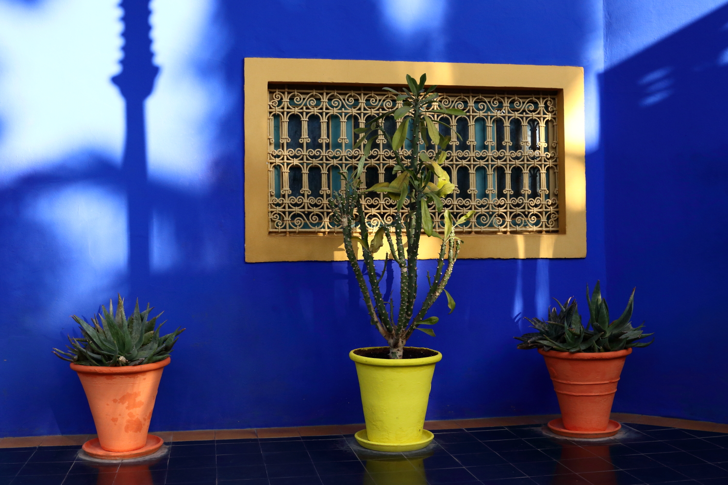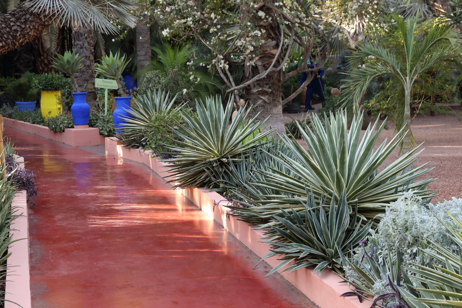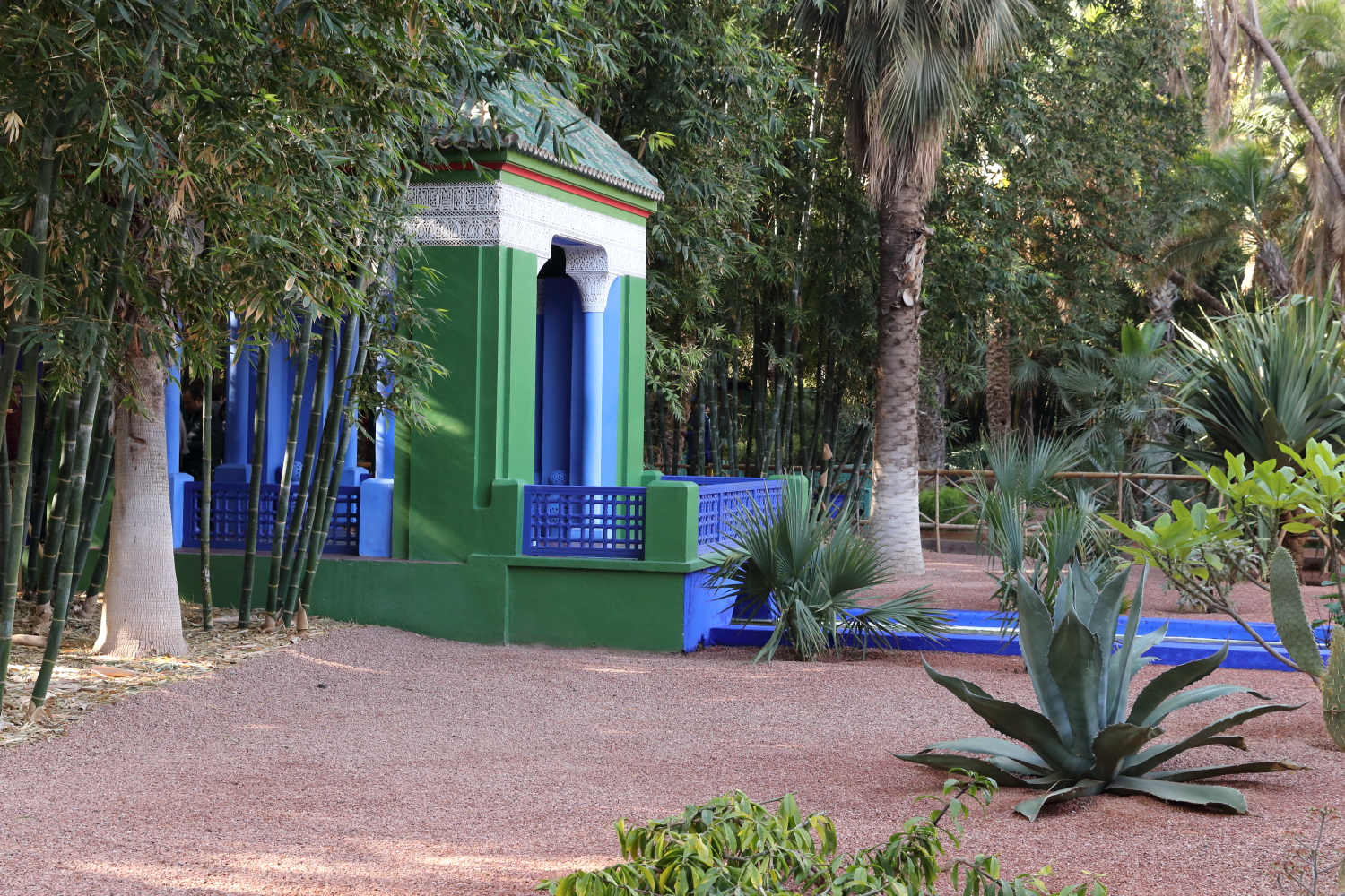 Passionné de botanique, le peintre Jacques Majorelle a créé en 1931 un jardin avec des espèces venues du monde entier. Il a teinté les murs de sa propriété d’un bleu outremer qu’il a lui-même élaboré, le bleu Majorelle. Voué à la destruction pour un projet immobilier, Yves Saint-Laurent et Pierre Bergé l’ont racheté en 1980.