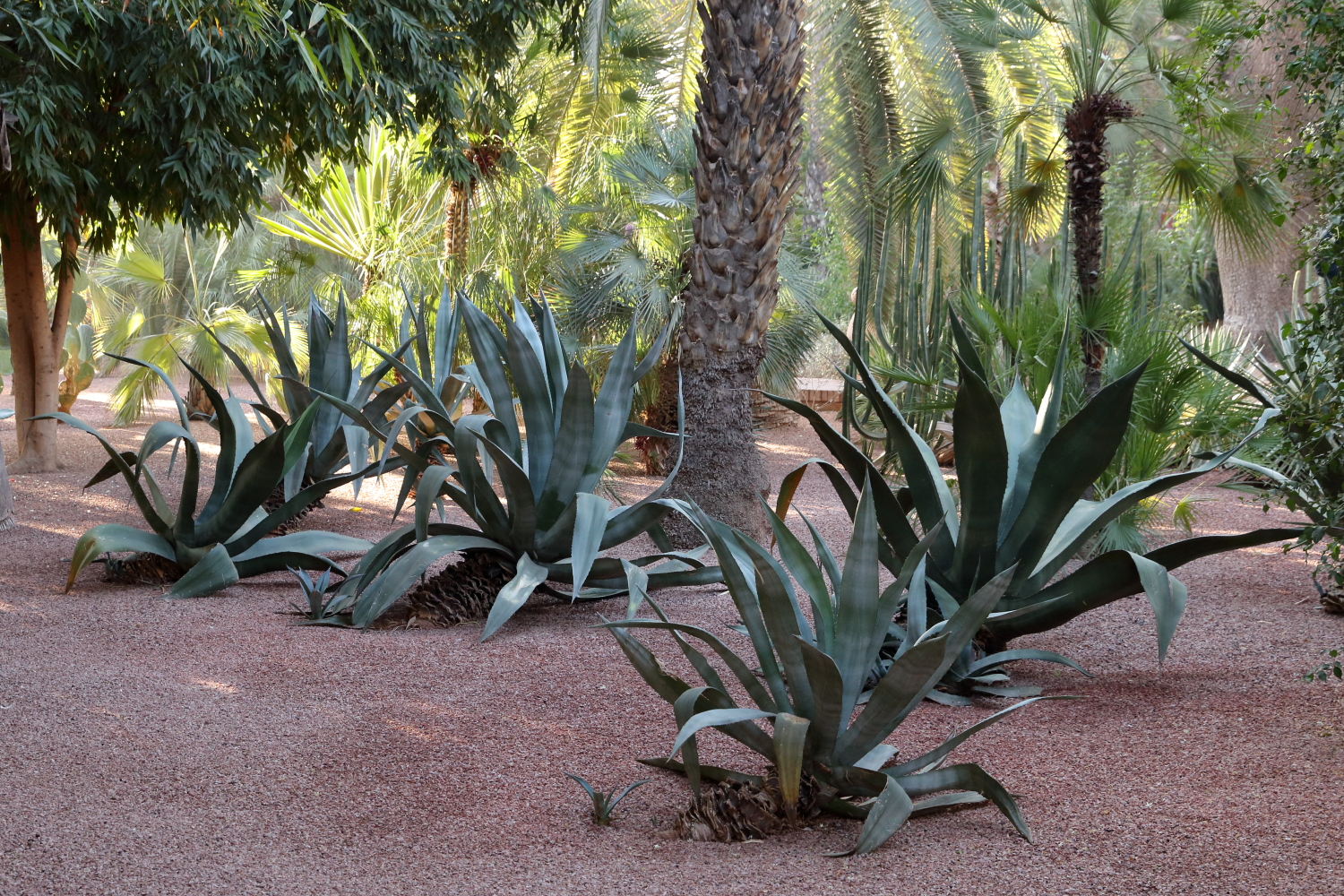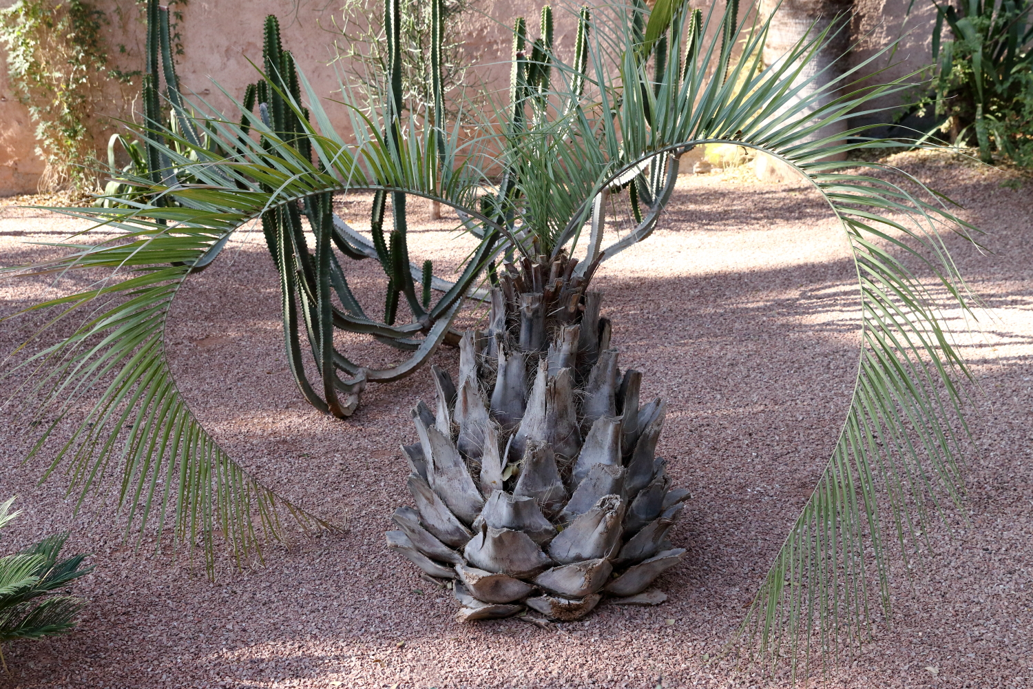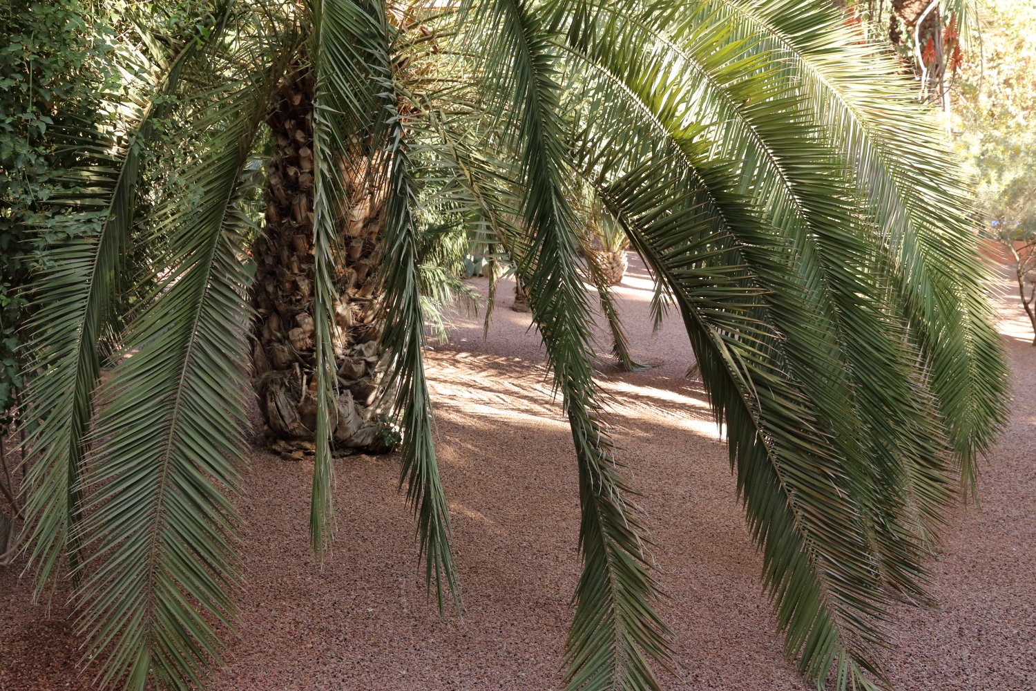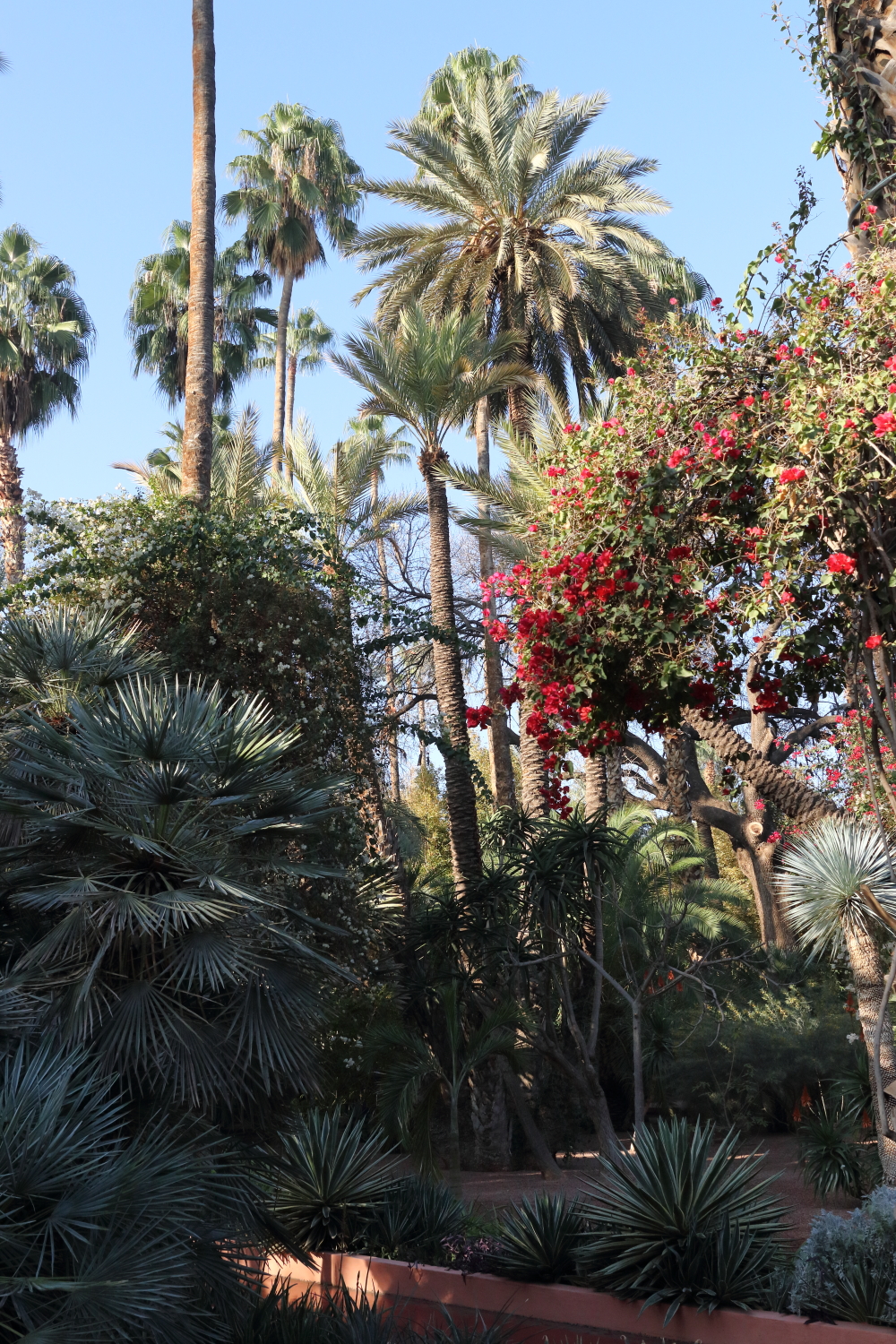 Si l’ensemble de l’aménagement est un écrin d’une exceptionnelle beauté, les plantes en sont le couronnement par l’aboutissement consenti, par leurs formes, leurs variétés et leurs tailles. Petite parenthèse, sur les boulevards de Marrakech, on plante une variété de cocotier qui pousse beaucoup plus vite qu’un palmier dont le développement est très lent.
