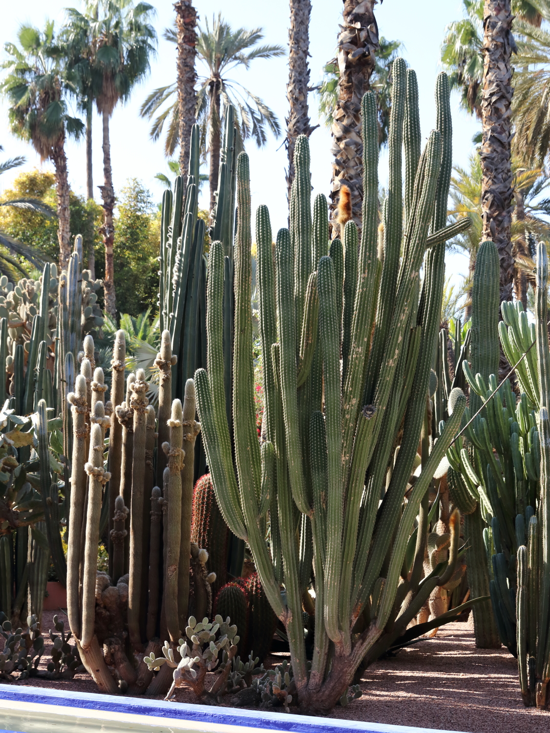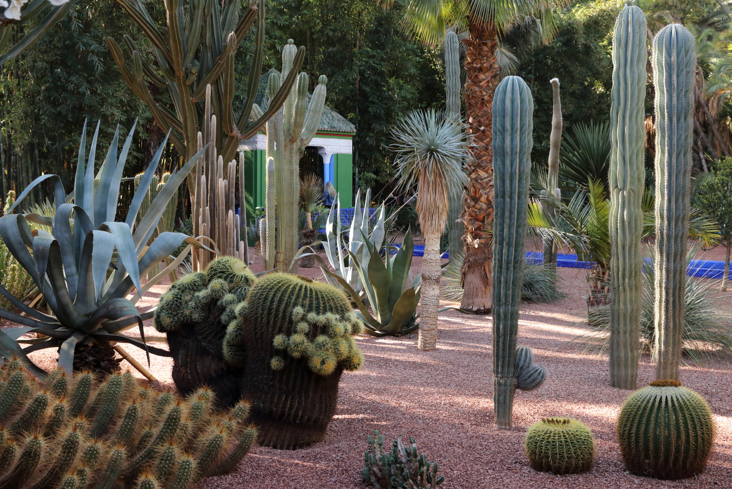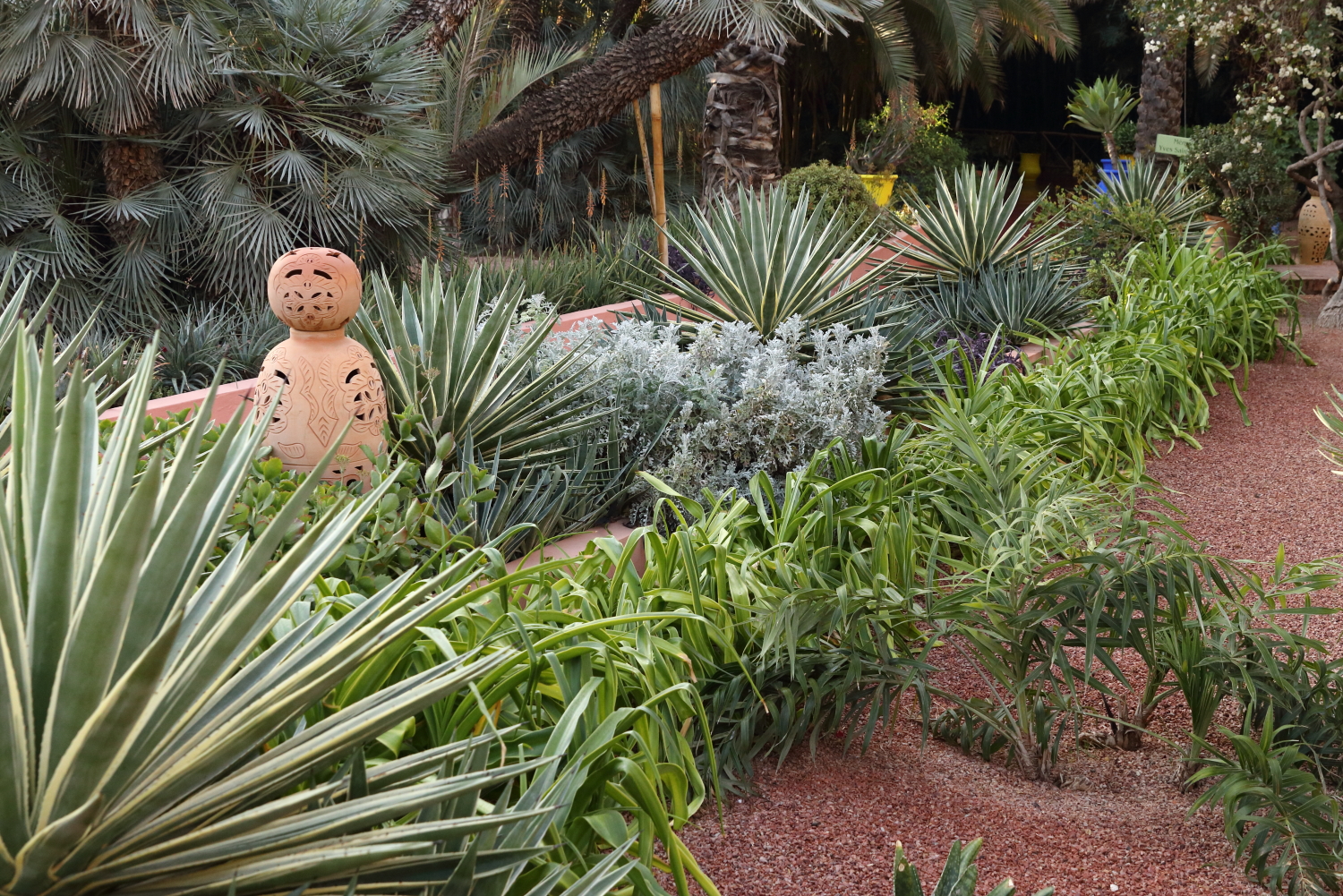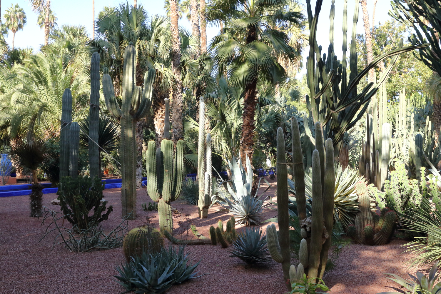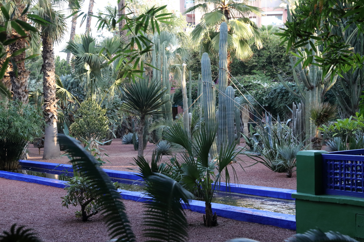 Si l’ensemble de l’aménagement est un écrin d’une exceptionnelle beauté, les plantes en sont le couronnement par l’aboutissement consenti, par leurs formes, leurs variétés et leurs tailles. Petite parenthèse, sur les boulevards de Marrakech, on plante une variété de cocotier qui pousse beaucoup plus vite qu’un palmier dont le développement est très lent.