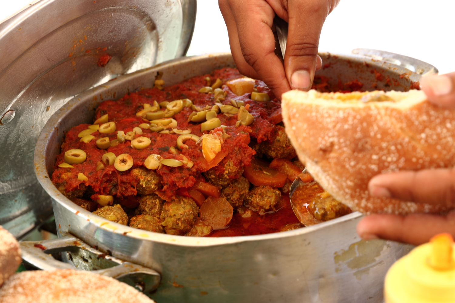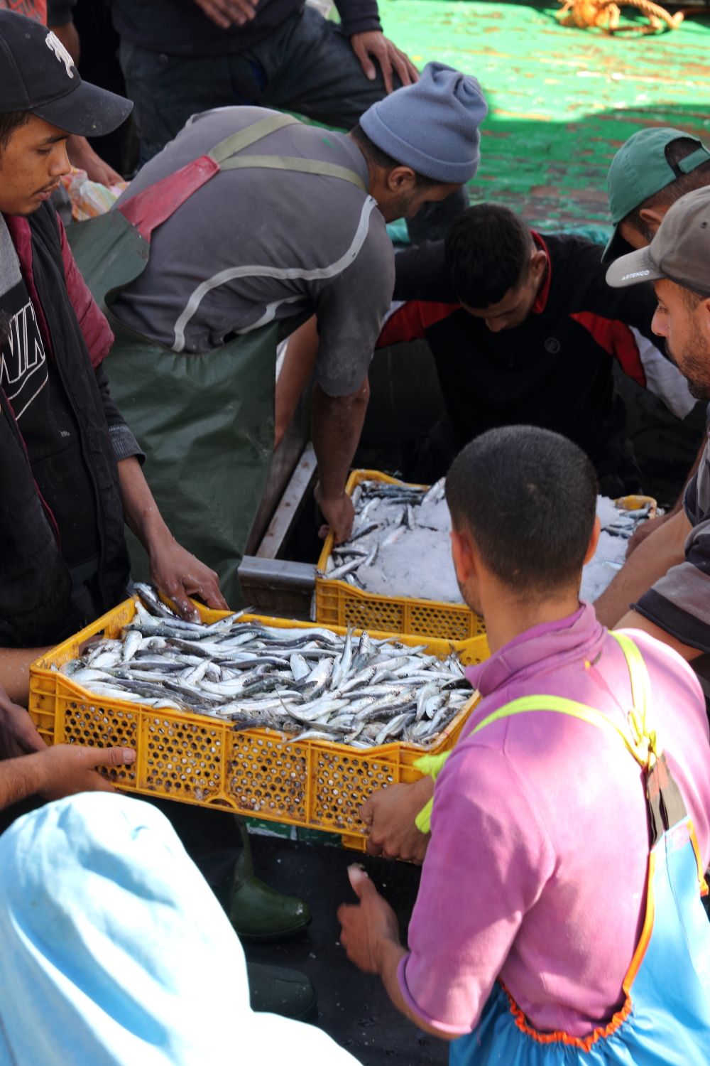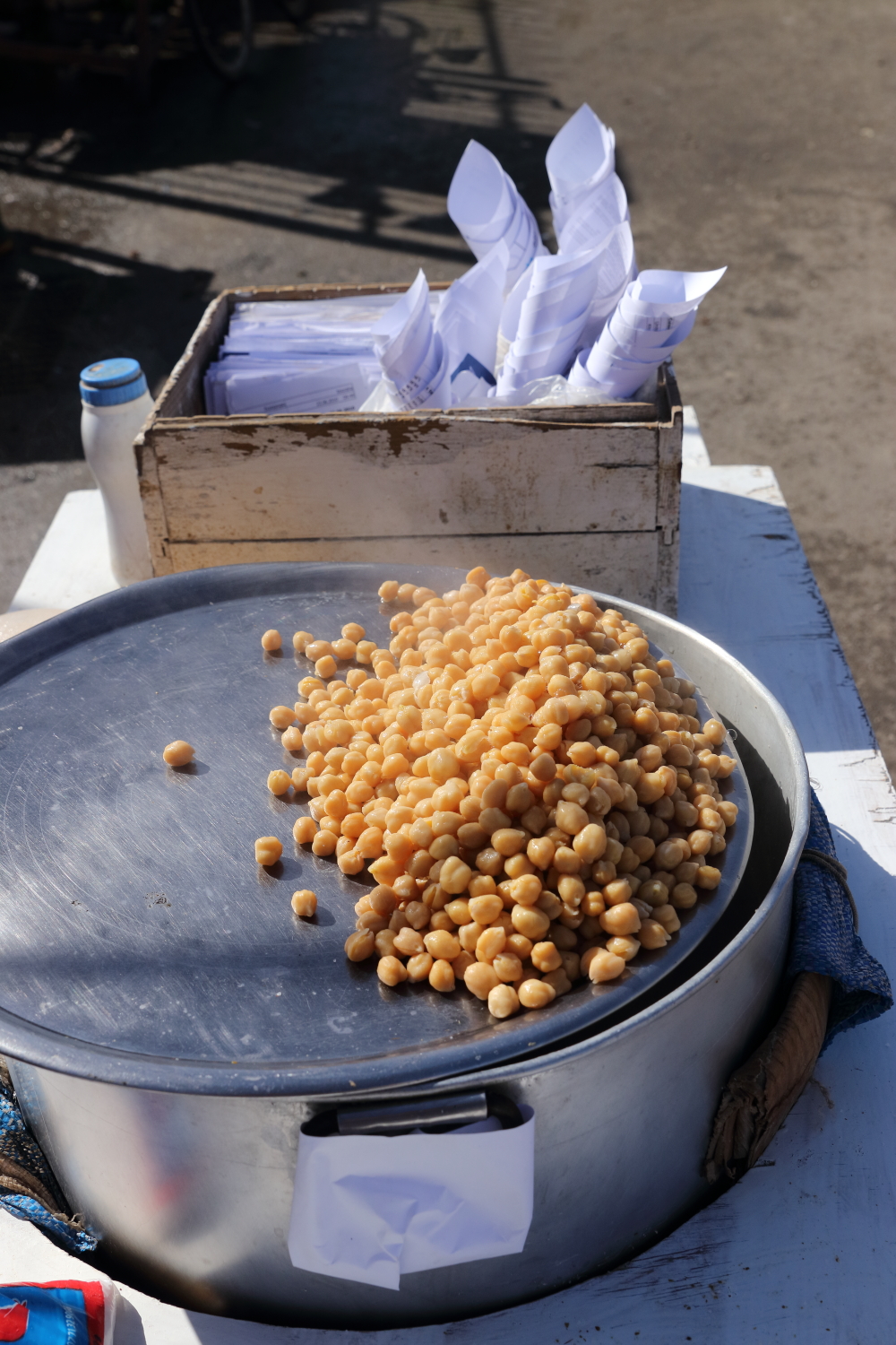 La pêche du jour arrive au port, un petit pousseur l’aide à la mise à quai. Nous n’avons pas hésité une seconde à goûter un sandwich aux boulettes de sardines, plutôt savoureux. En cuisine de rue, c’est une chose que l’on apprécie pour s’immerger dans le culinaire local. Il y avait aussi des cornets de pois chiches.