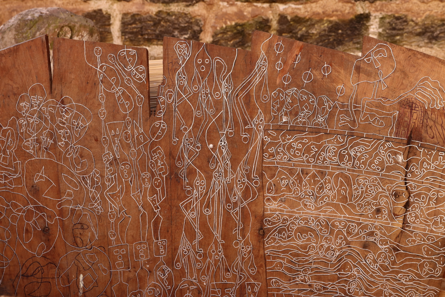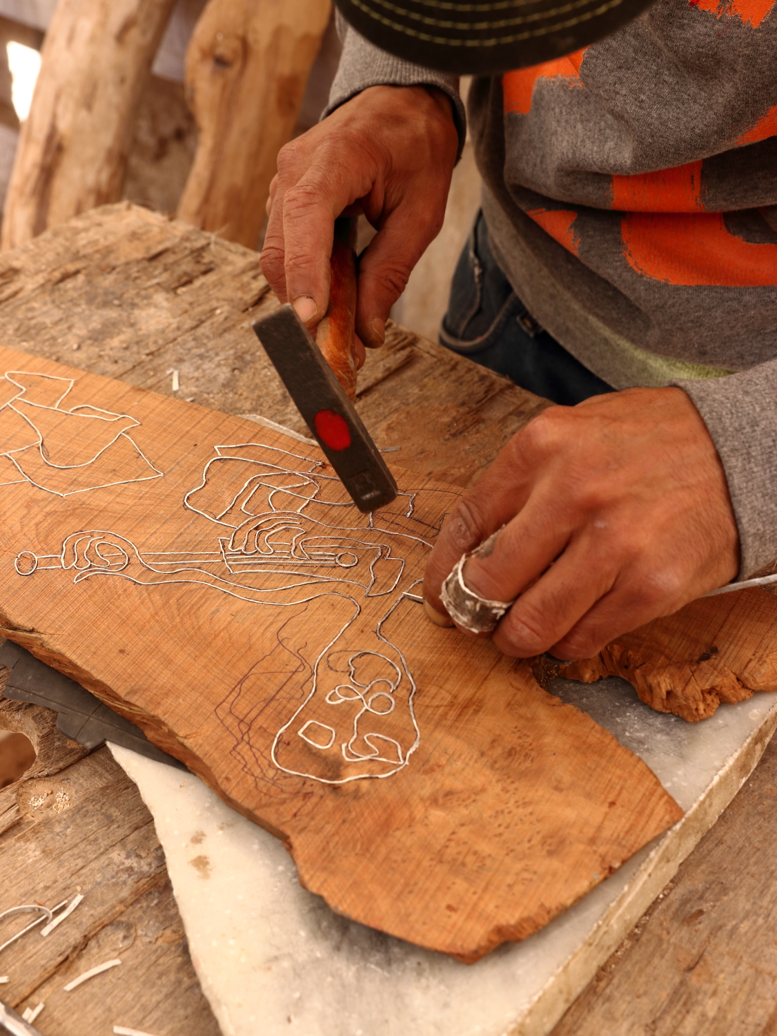 Après avoir rainuré le bois, cet artiste découpe et incruste de fines lamelles en recyclant une gamelle en aluminium, le tout avec un marteau, une pointe pour le dessin et une cisaille à main. En prenant un peu de recul pour admirer son œuvre, le contraste du bois et du métal est bluffant.