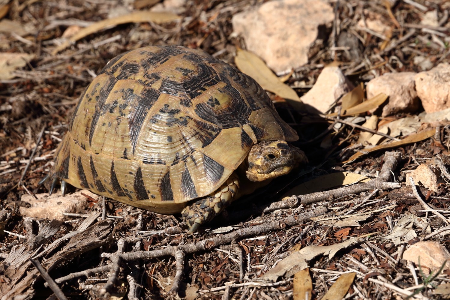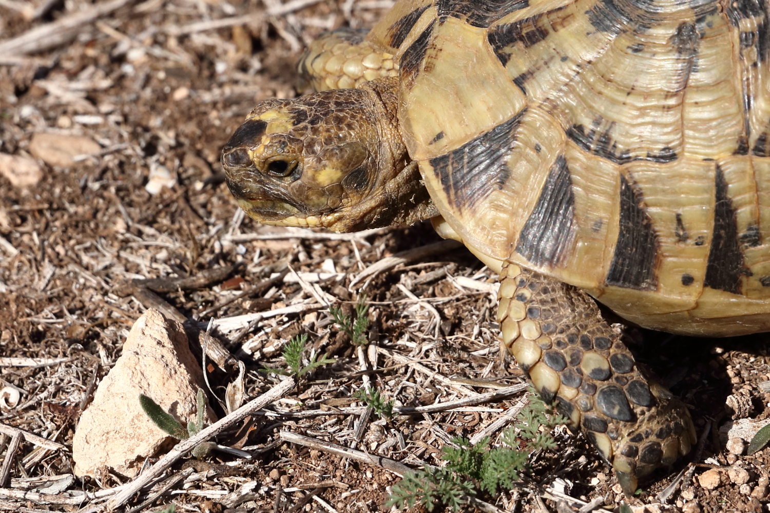 Une petite tortue mauresque (espèce protégée) déambulait sur le camping. Elle n’a pas d’éperon corné sur sa queue, contrairement à la tortue Hermann que l’on peut confondre.
