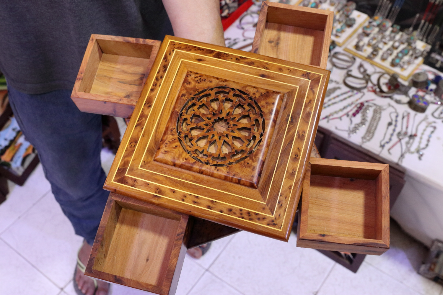 Dans les souks du pays, on peut toujours choisir selon ses envies : tissus de canapé, menuiserie, couture, l’artisan fera du sur-mesure si besoin. Nous avons appris que les motifs de tapis berbères comportaient des significations comme éloigner le mauvais sort, par exemple. Pour une boîte à bijoux, il suffit de tourner le couvercle pour que les tiroirs apparaissent… Et c’est encore mieux en grignotant des dattes.