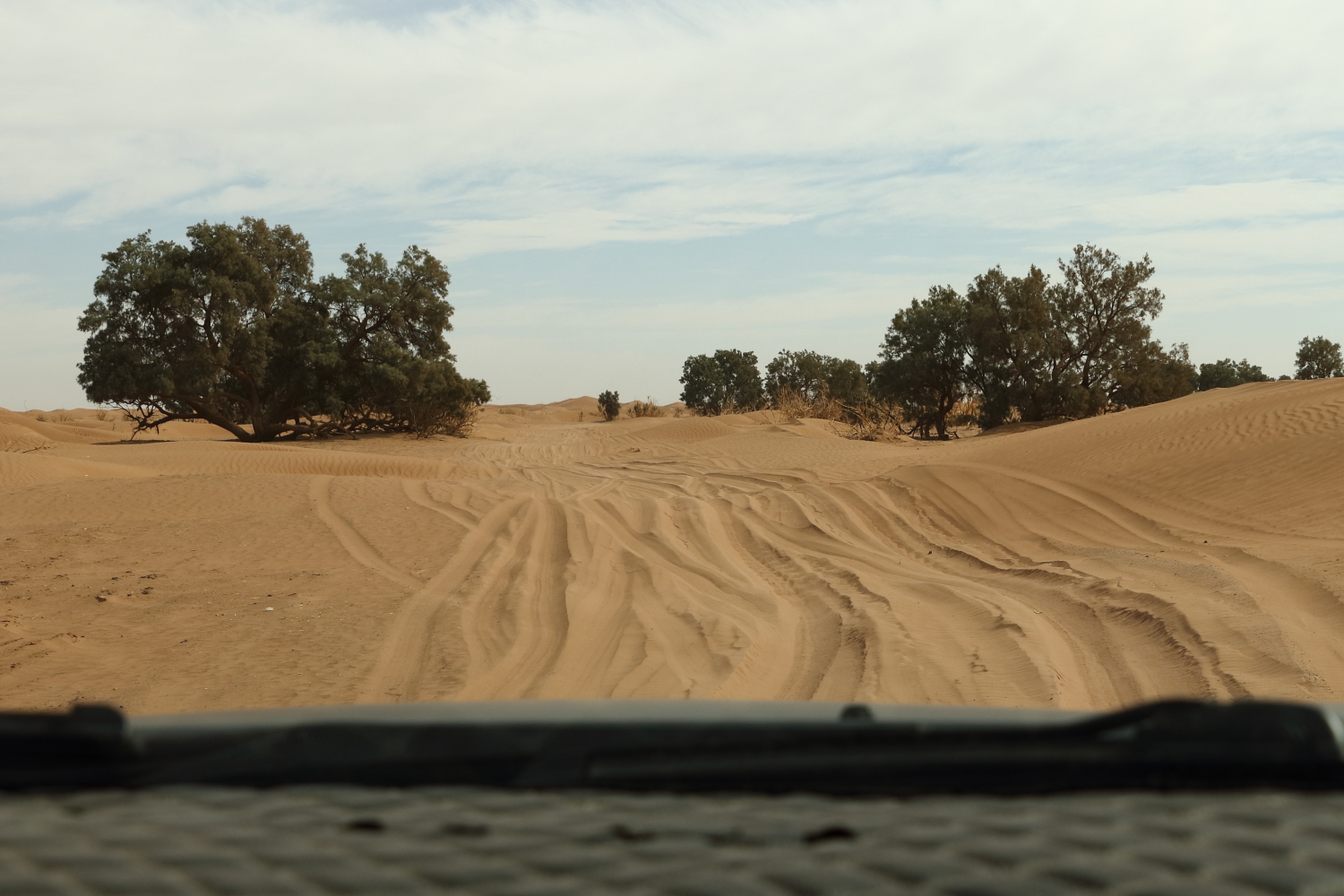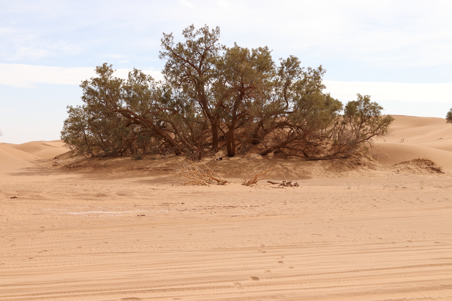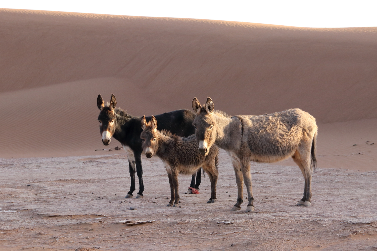 Passage dans les dunes, emprunté autrefois par le rallye du Paris-Dakar. Tout comme les dromadaires, les ânes sauvages se regroupent sous un arbre pour se mettre à l’ombre.
