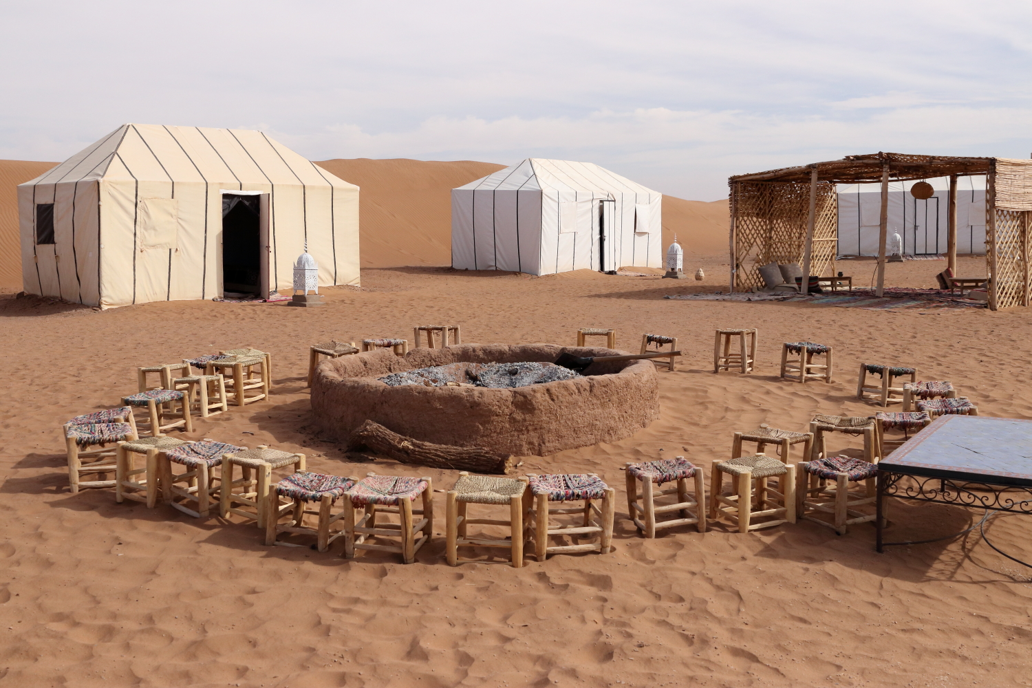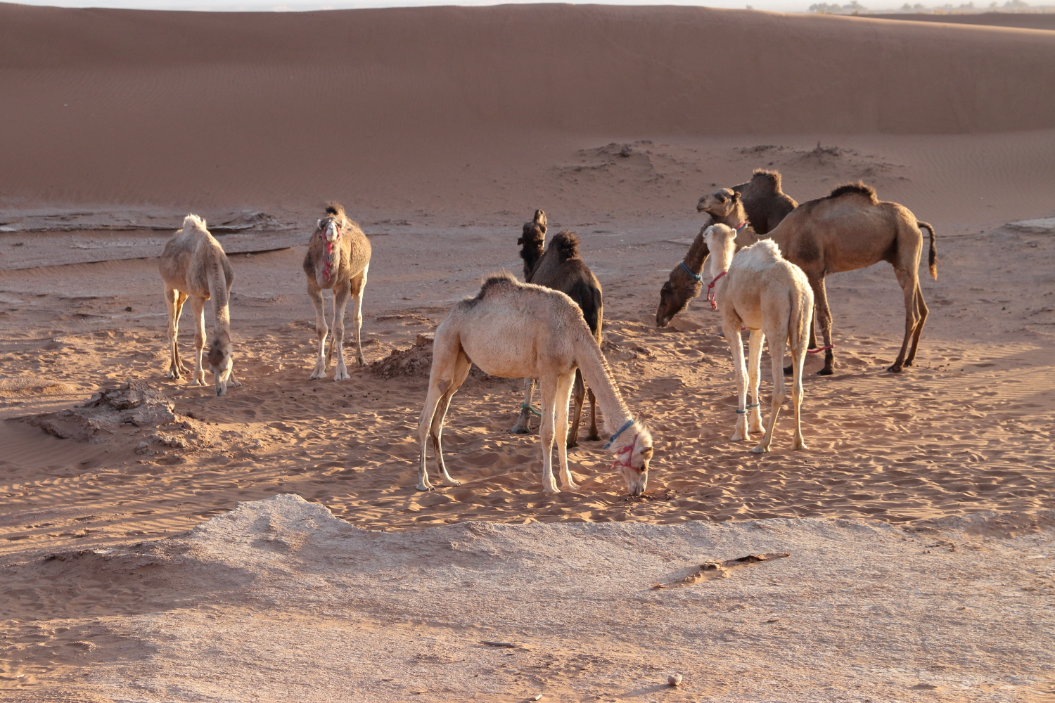 Le bivouac où le soir venu la fraîcheur se fait vite sentir, les musiciens et le feu de camp ont réchauffé l’atmosphère. Les dromadaires sont laissés en liberté, mais il arrive que l’on entrave leurs membres antérieurs d’un cordage pour limiter leur déplacement.