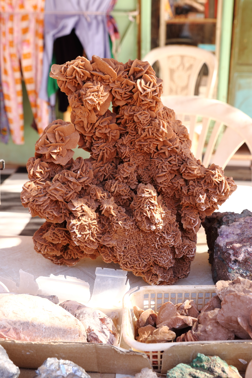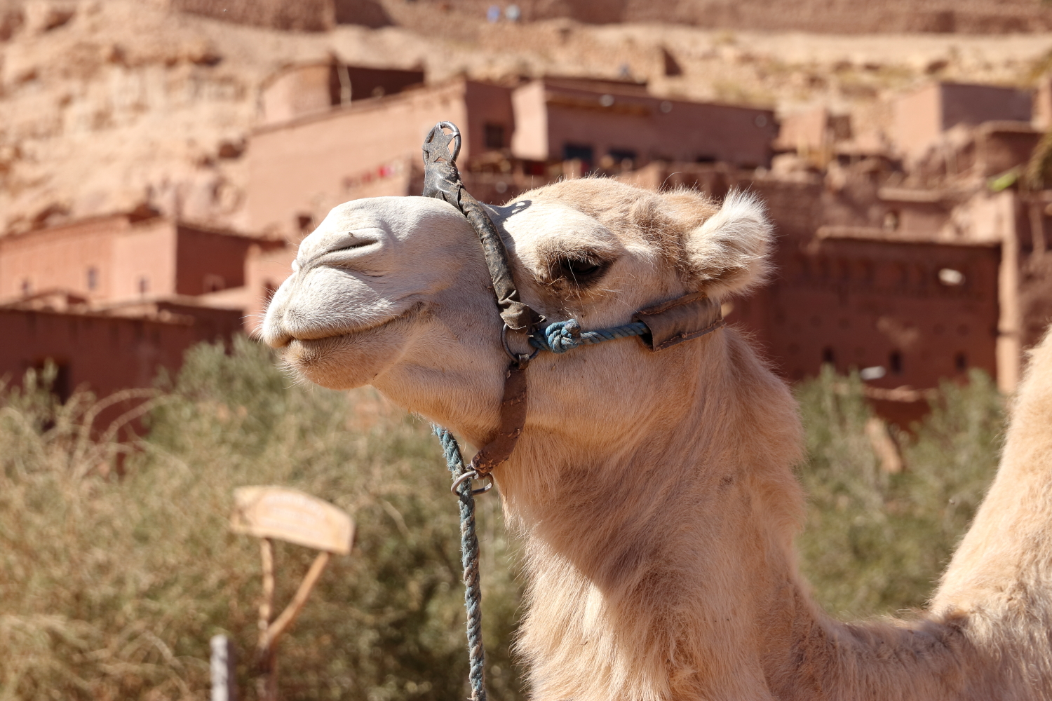 La rose des sables, l’évaporation d’eau infiltrée dans le sable du désert provoque sa cristallisation. J’ai remarqué ce licol peu habituel sur ce dromadaire.