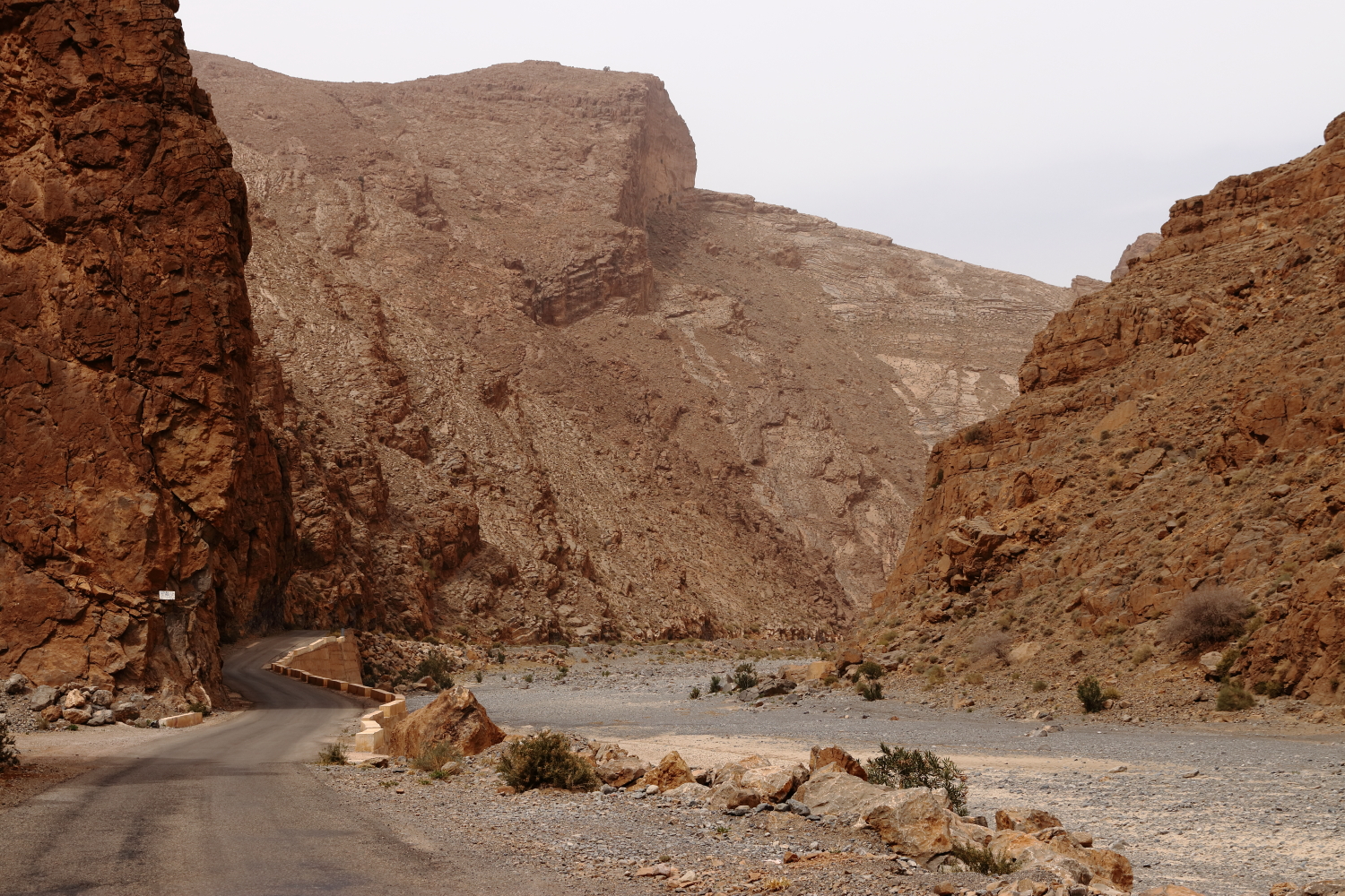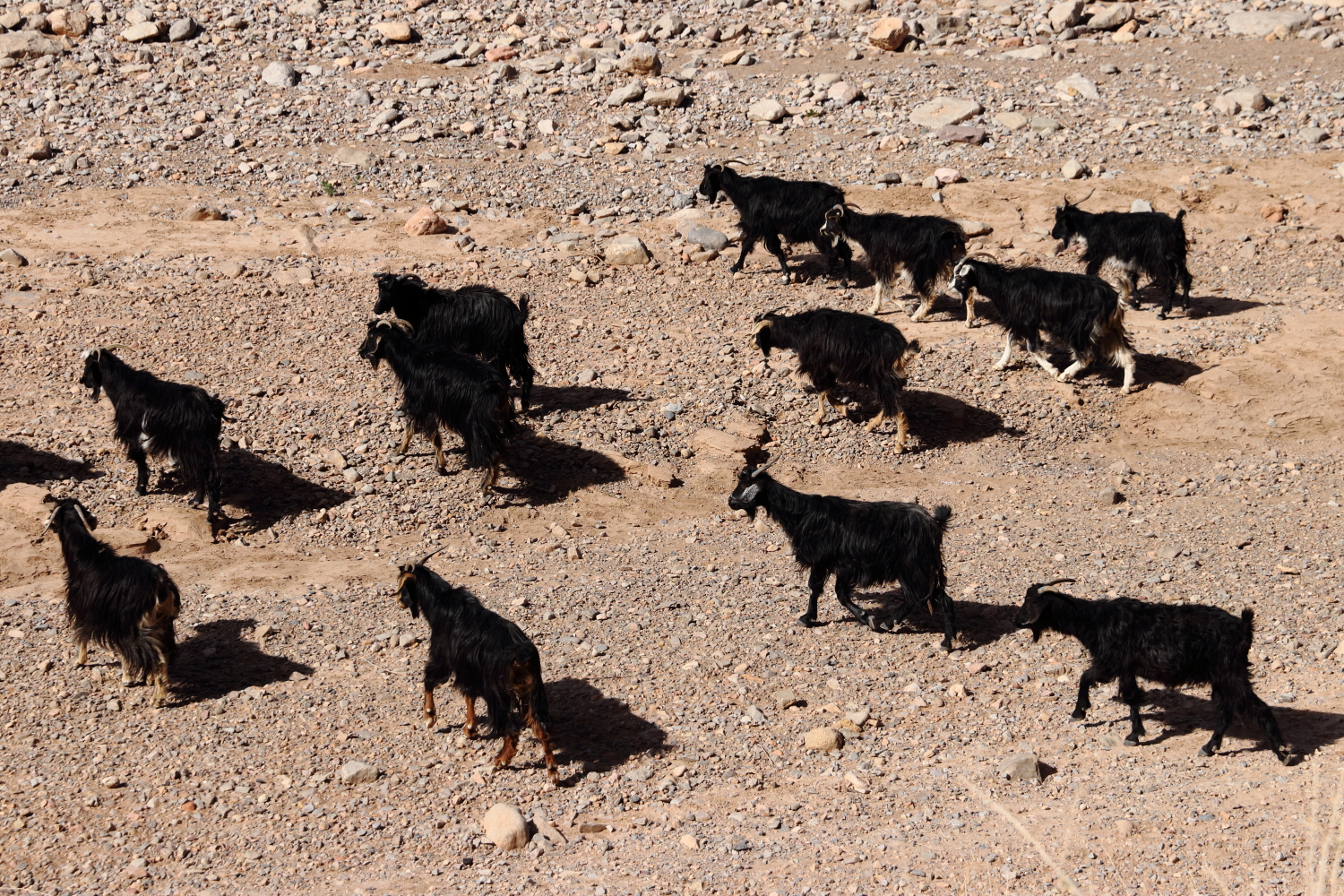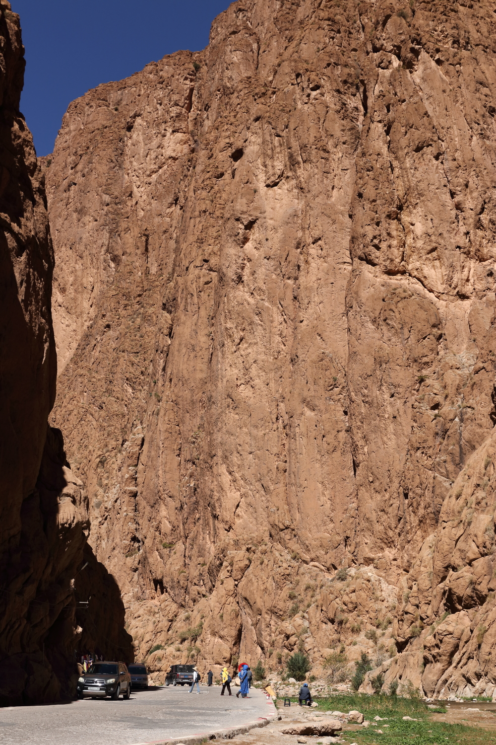 Les brochures touristiques orientent les futures découvertes, mais elles sont souvent liées à des raisons économiques. Nous avons pour habitude de toujours interroger les habitants pour connaître l’état des routes ou récolter de précieux conseils. Et justement, le propriétaire du camping nous a suggéré de faire la boucle depuis Tamtetoucht jusqu’à Gulmina, encore plus spectaculaire que les gorges du Todra. Au Maroc, la chaussée est souvent surbaissée pour l’écoulement de la rivière, certains passages se sont faits à vitesse réduite, nous n’avons croisé qu’un seul camping-car. Le réseau routier est en général de bonne facture dans l’ensemble du pays. Dans les failles, les bergers établissent leur campement avec leurs chèvres.