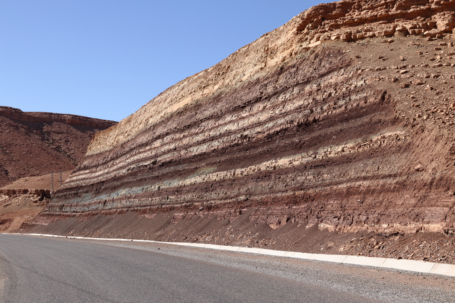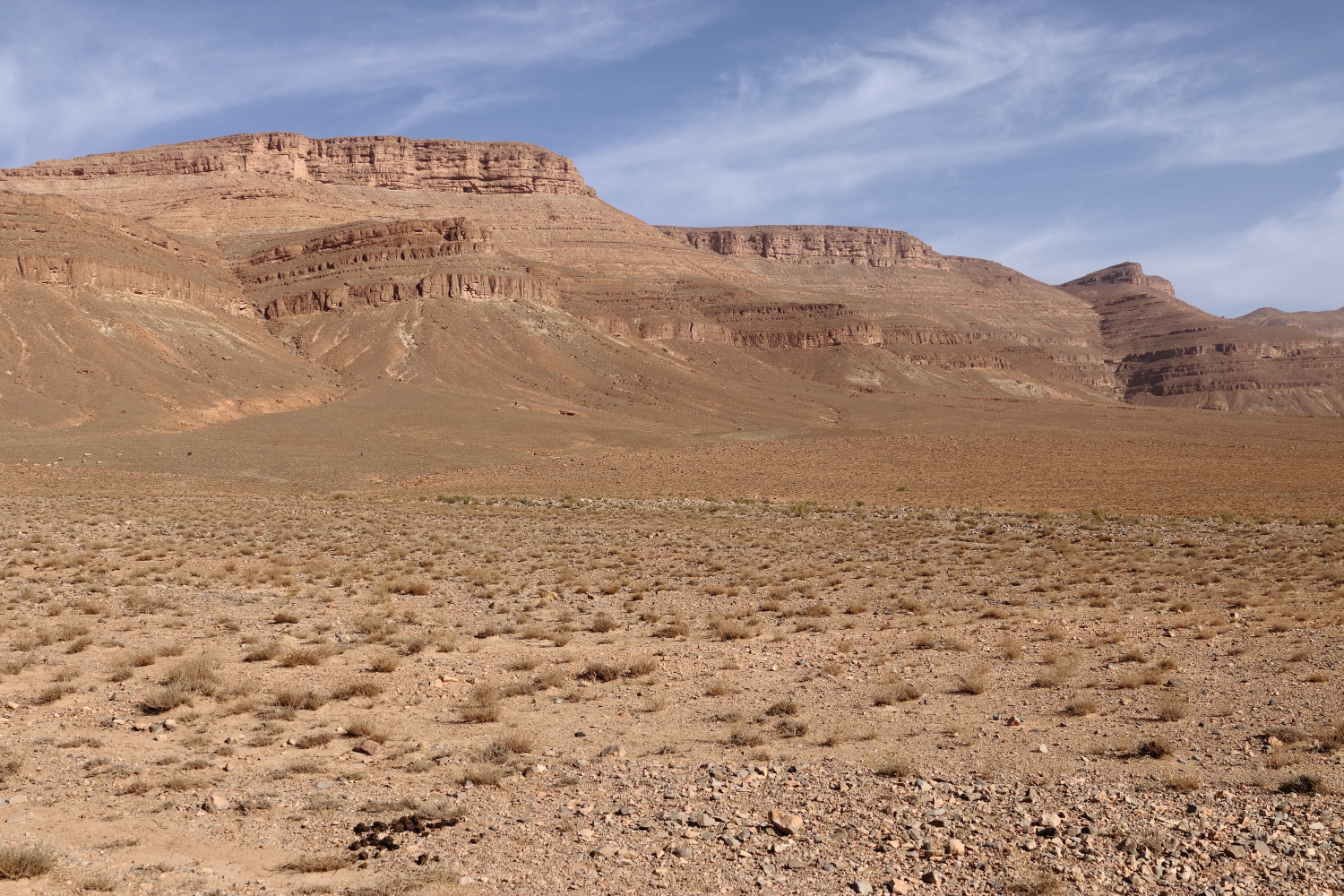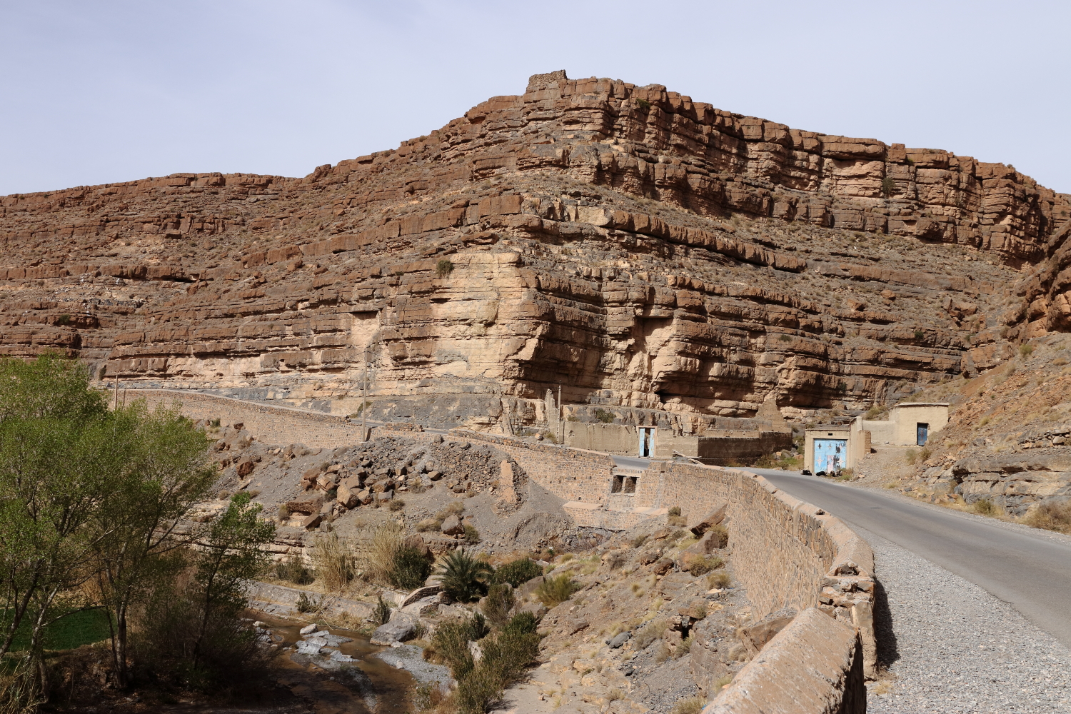 Les brochures touristiques orientent les futures découvertes, mais elles sont souvent liées à des raisons économiques. Nous avons pour habitude de toujours interroger les habitants pour connaître l’état des routes ou récolter de précieux conseils. Et justement, le propriétaire du camping nous a suggéré de faire la boucle depuis Tamtetoucht jusqu’à Gulmina, encore plus spectaculaire que les gorges du Todra. Au Maroc, la chaussée est souvent surbaissée pour l’écoulement de la rivière, certains passages se sont faits à vitesse réduite, nous n’avons croisé qu’un seul camping-car. Le réseau routier est en général de bonne facture dans l’ensemble du pays. Dans les failles, les bergers établissent leur campement avec leurs chèvres.
