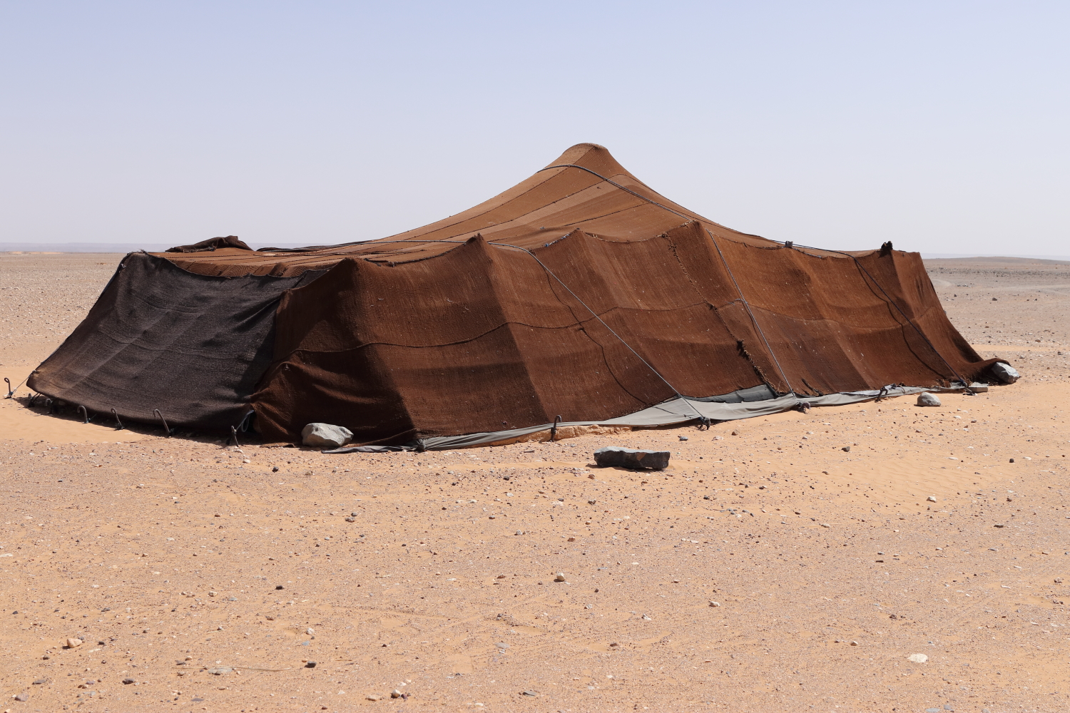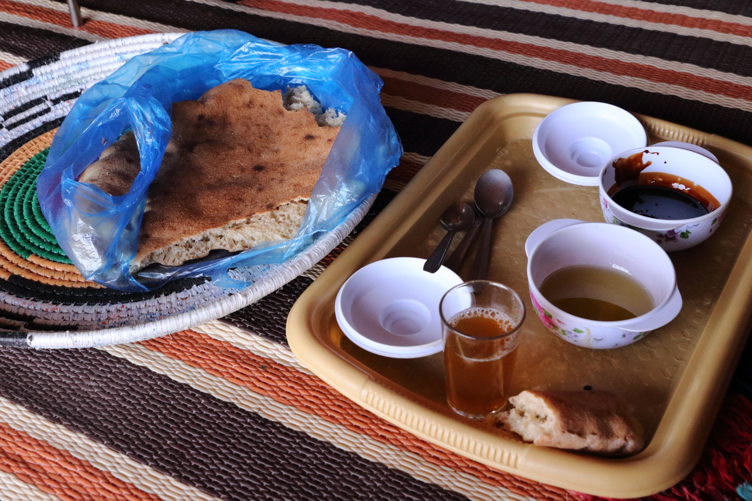 Un moment de partage dans une tente berbère, du pain trempé dans de l’huile d’olive et du sirop de dattes accompagné d’un thé à la menthe. Il arrive que d’autres herbes aromatiques se rajoutent à cette boisson. Nous avons ressenti une grande solidarité chez les nomades. Au Maroc, il n’y a que des dromadaires…