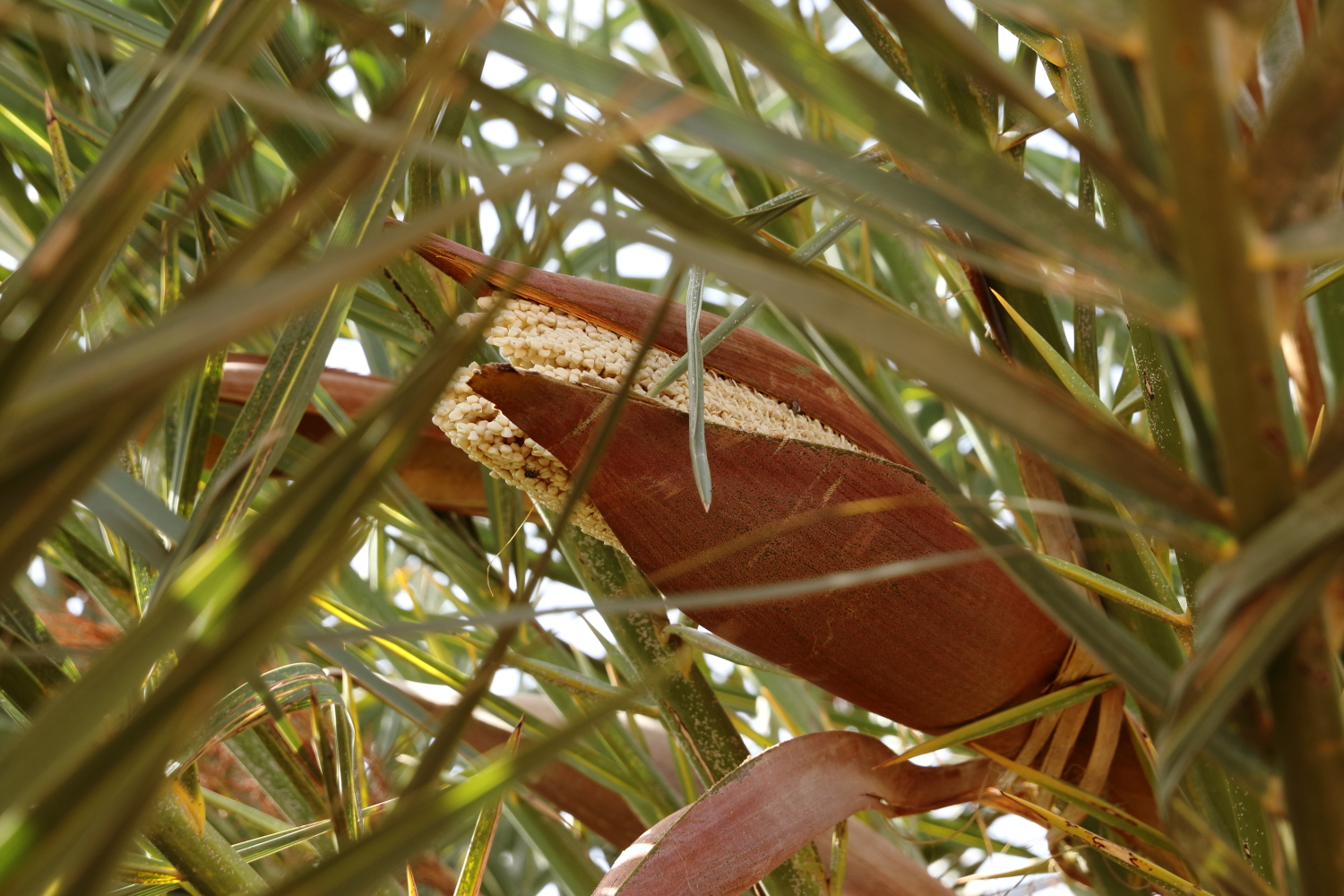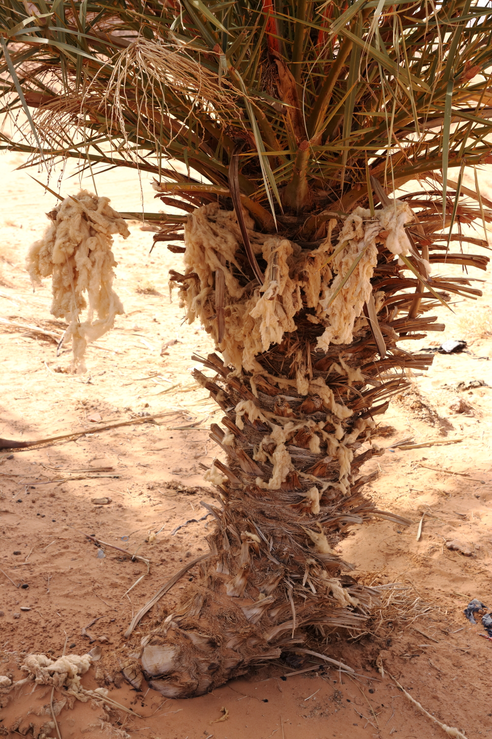 À gauche, la fleur mâle du palmier-dattier, à droite la fleur femelle et au centre les poils d’un dromadaire qui avait une furieuse envie de se gratter…