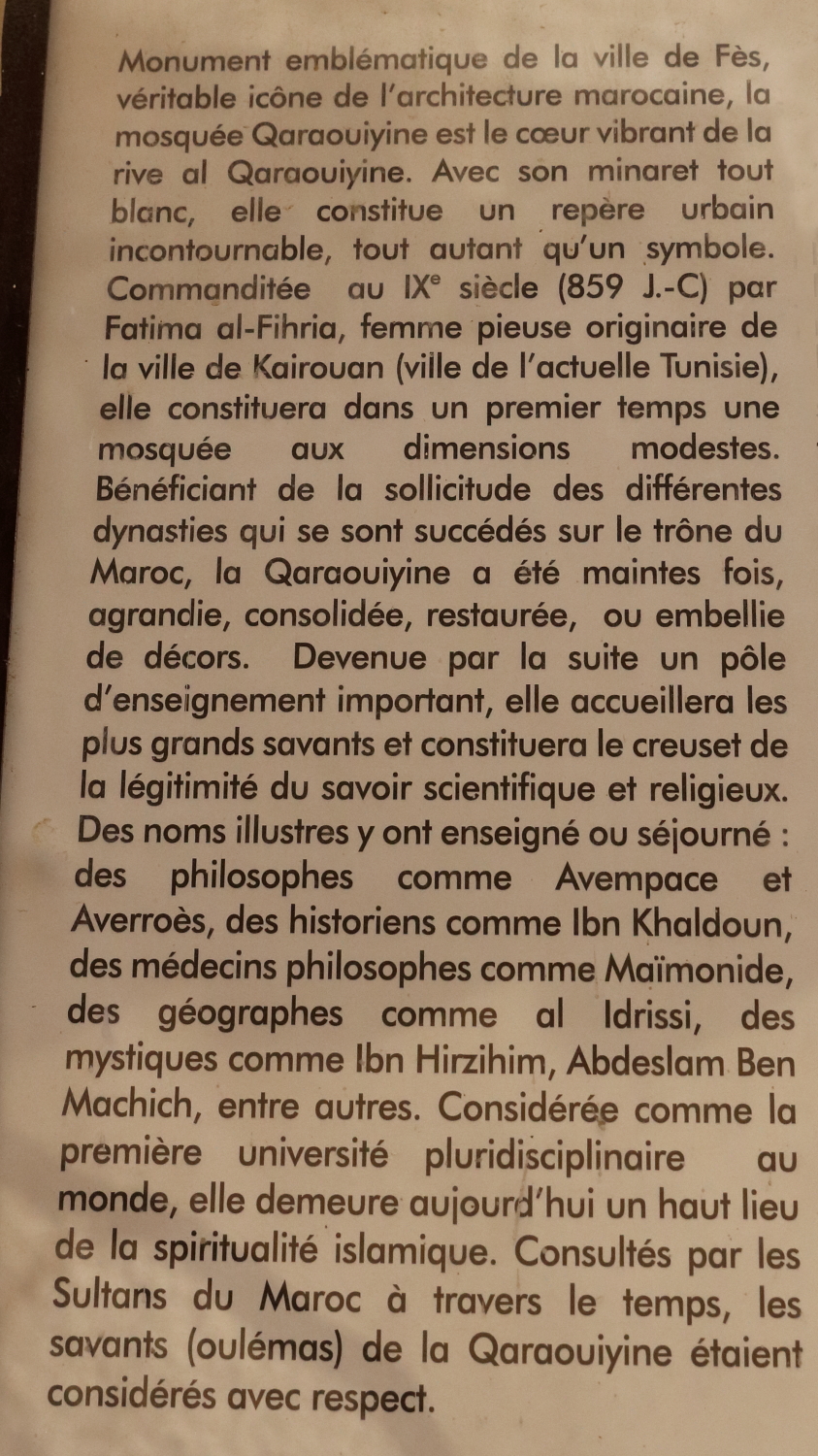 Les monuments symboliques de la ville, la mosquée et l’université Karaouiyne et Médersa Bou Inania, l’école coranique. Dans cette dernière, le mihrab dans la salle de prière indique la direction de La Mecque et les mosaïques comportent des phrases du Coran.