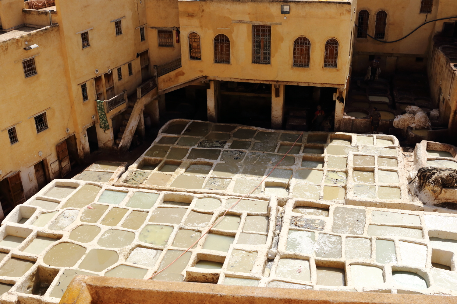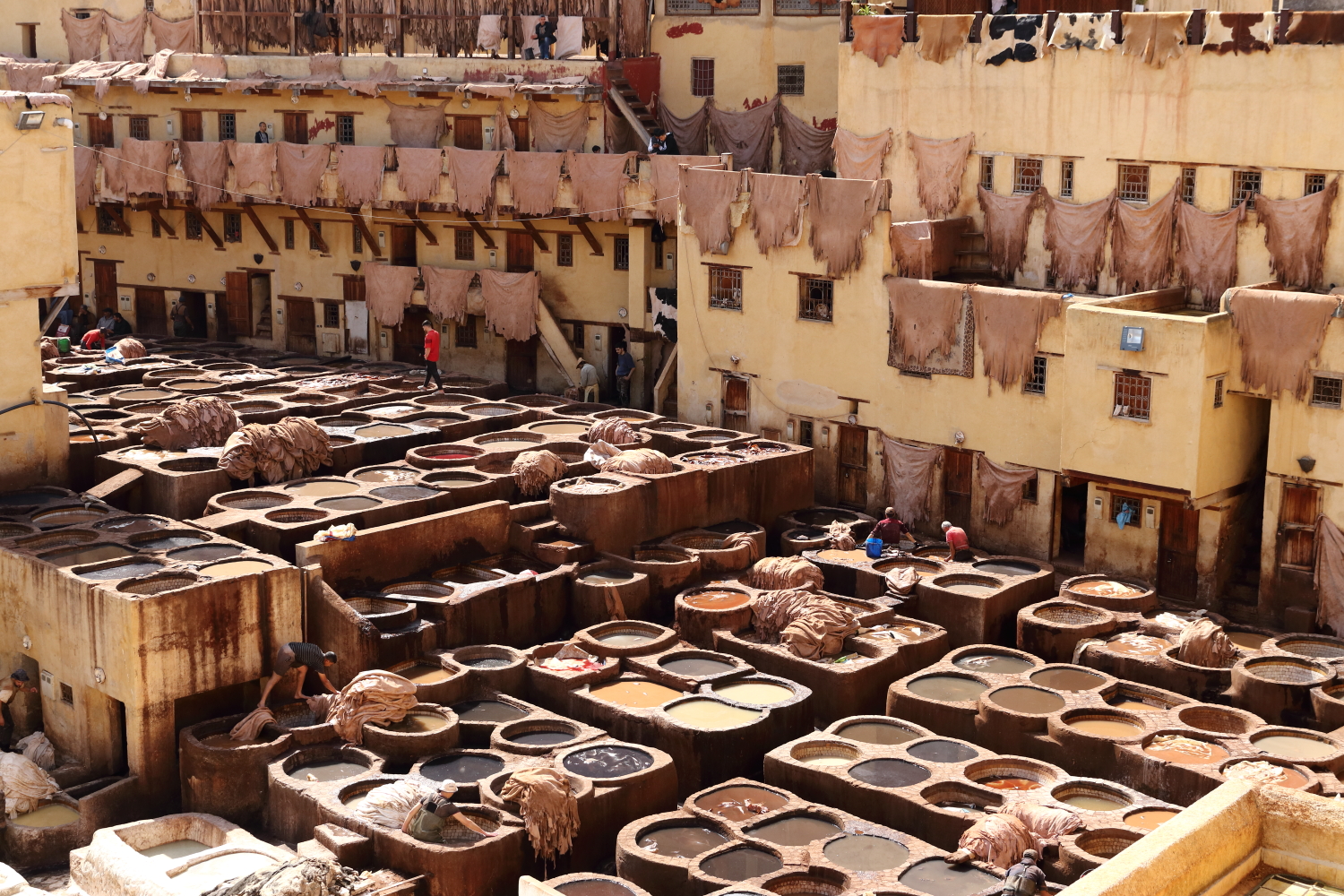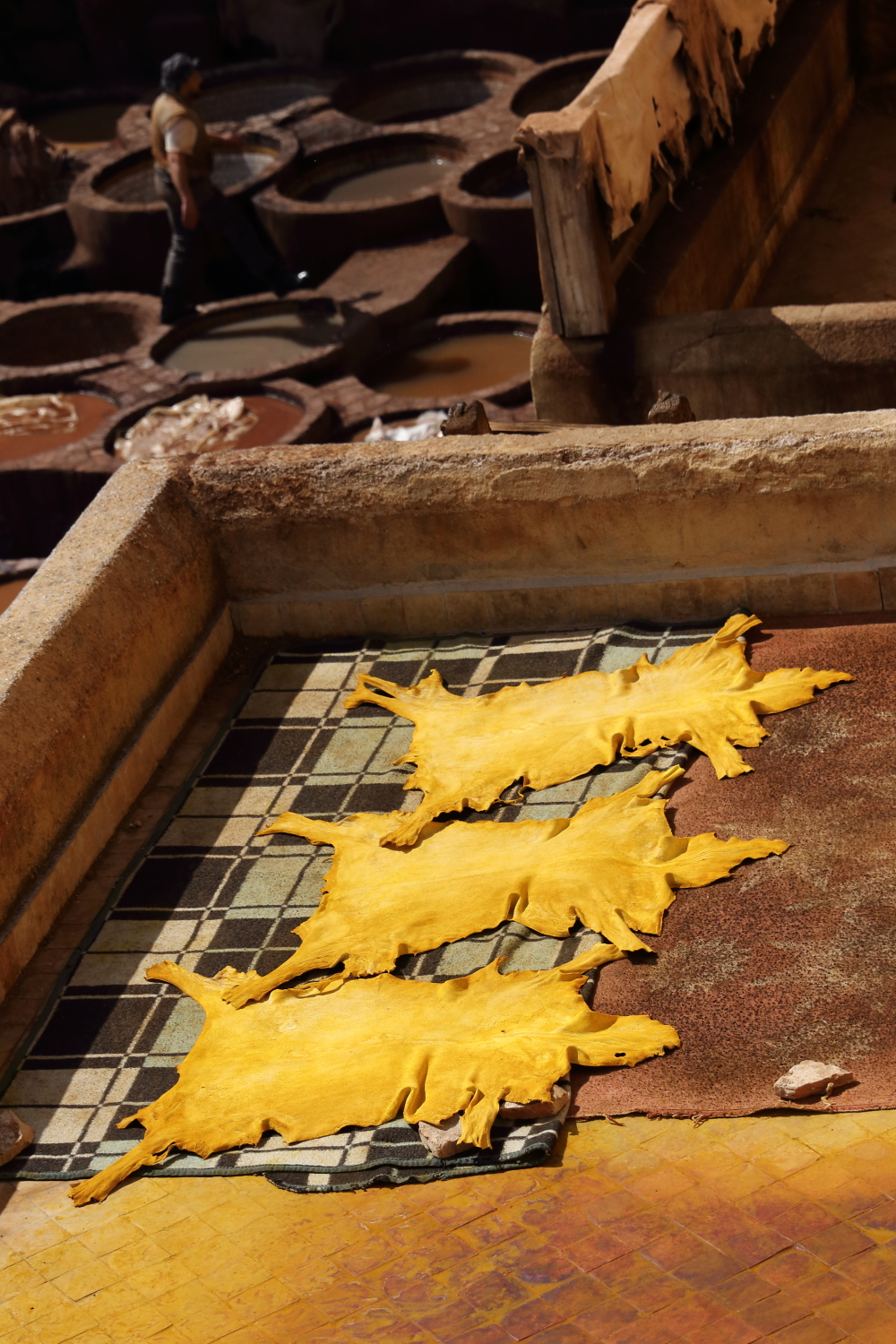 En passant la Bab Boujloud (porte), on pénètre dans l’ancienne médina de Fès avec son célèbre quartier des tanneurs. On travaille aussi bien le cuir de vache, de dromadaire et de chèvre, la couleur jaune étant la plus chère dans les peaux, car elle utilise du safran. Aucun produit chimique n’est exploité, y compris dans la poterie. Tout est naturel dans la fabrication.