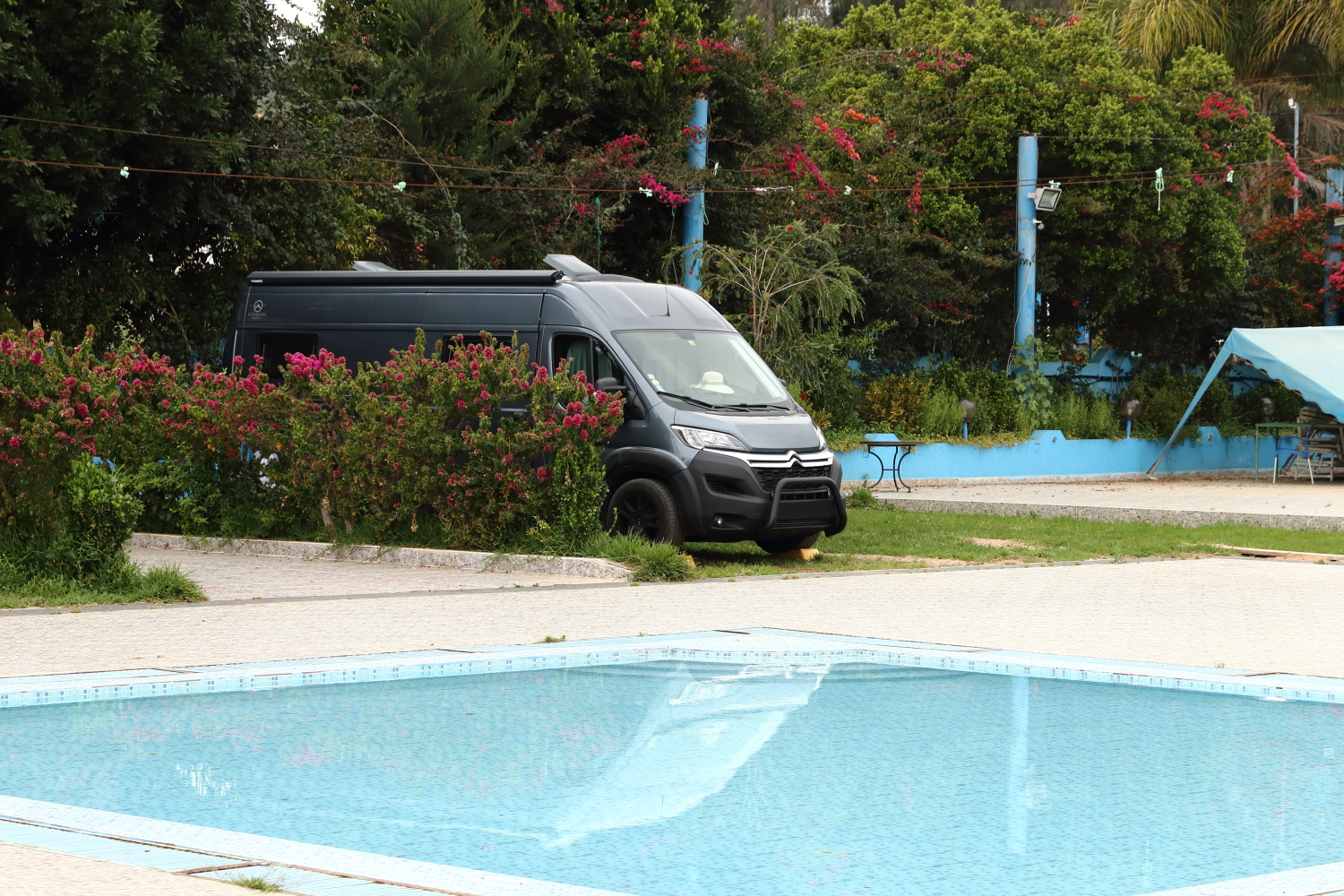 Après Volubilis, on n’en croyait pas nos yeux en arrivant sur ce camping : des véhicules au bord de la piscine. Heureuse surprise, la prochaine fois, on prévoira un maillot de bain XXXL pour mon JJ. Au Maroc, il faut aussi composer avec le sable. Là, c’est tout de suite moins drôle. Premier réflexe avant de prendre la route, soulever les essuie-glaces et aspirer les vitres électriques latérales, sinon gare aux rayures.