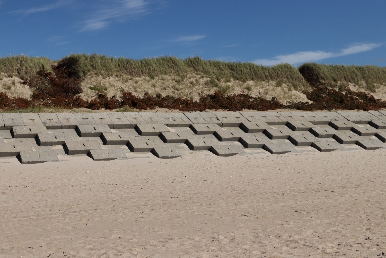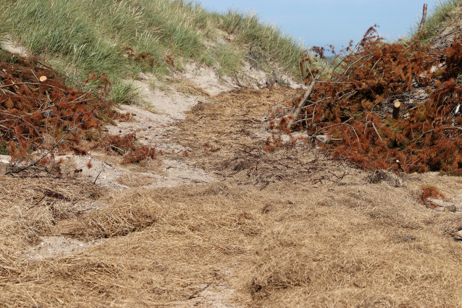 L’érosion côtière n’a pas de frontière, chacun luttant comme il peut. Le paillage des sentiers facilite grandement le passage des visiteurs dans les dunes tout en minimisant l’impact du piétinement, un système vraiment efficace. Aujourd’hui sur le sable, il valait mieux regarder où l’on posait ses pieds…