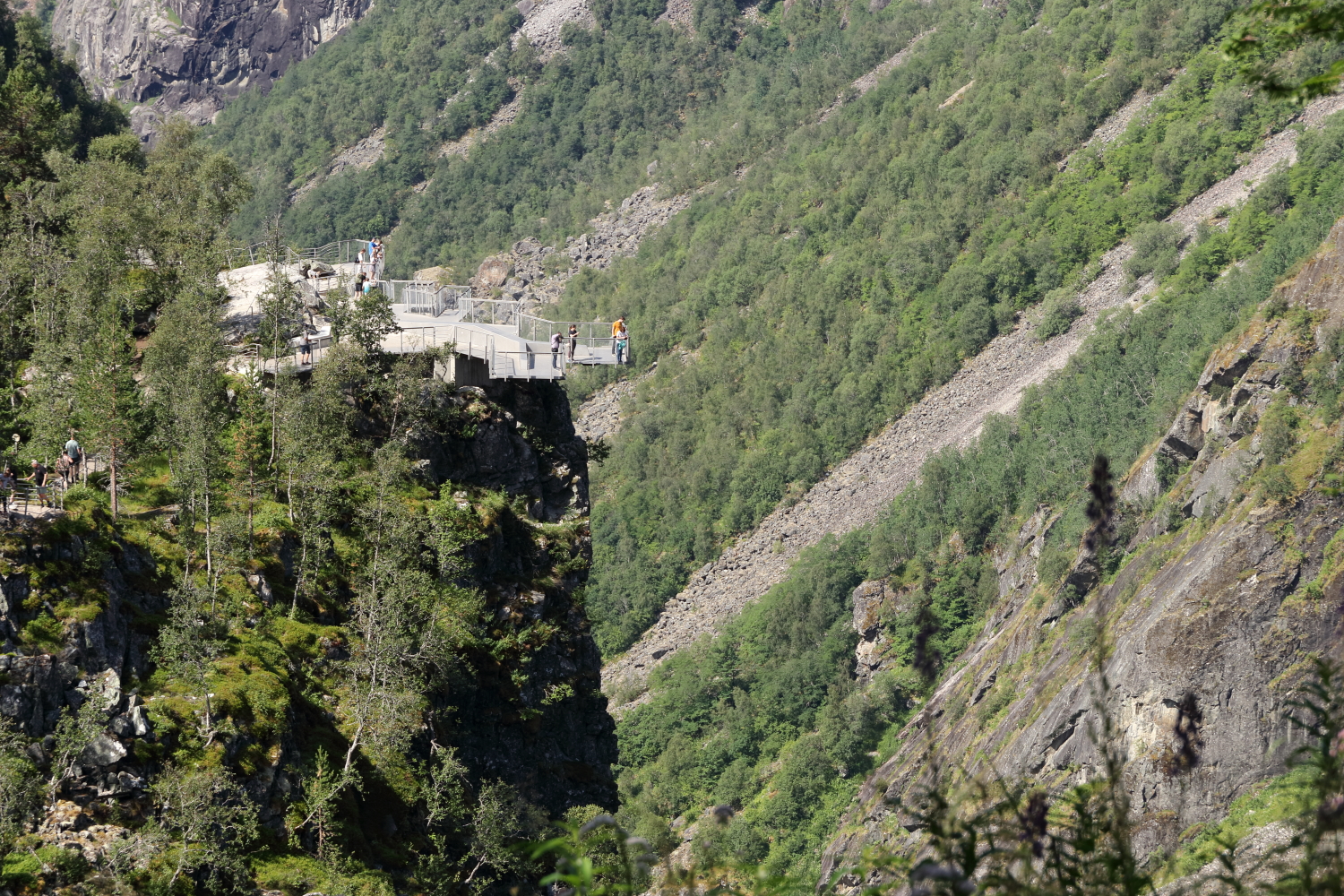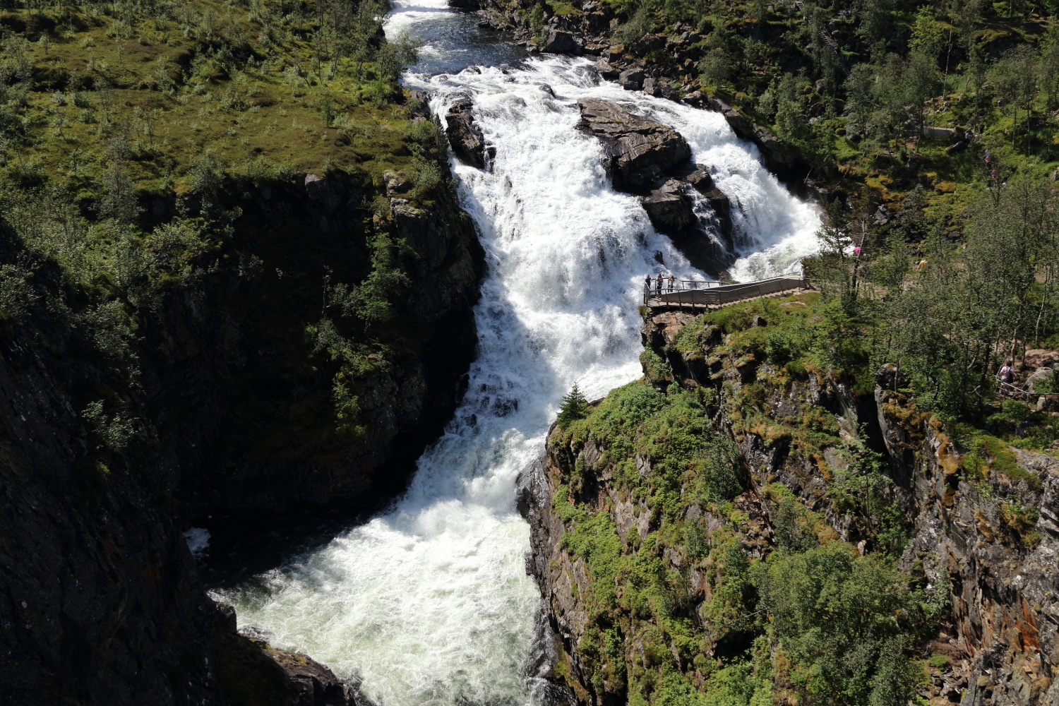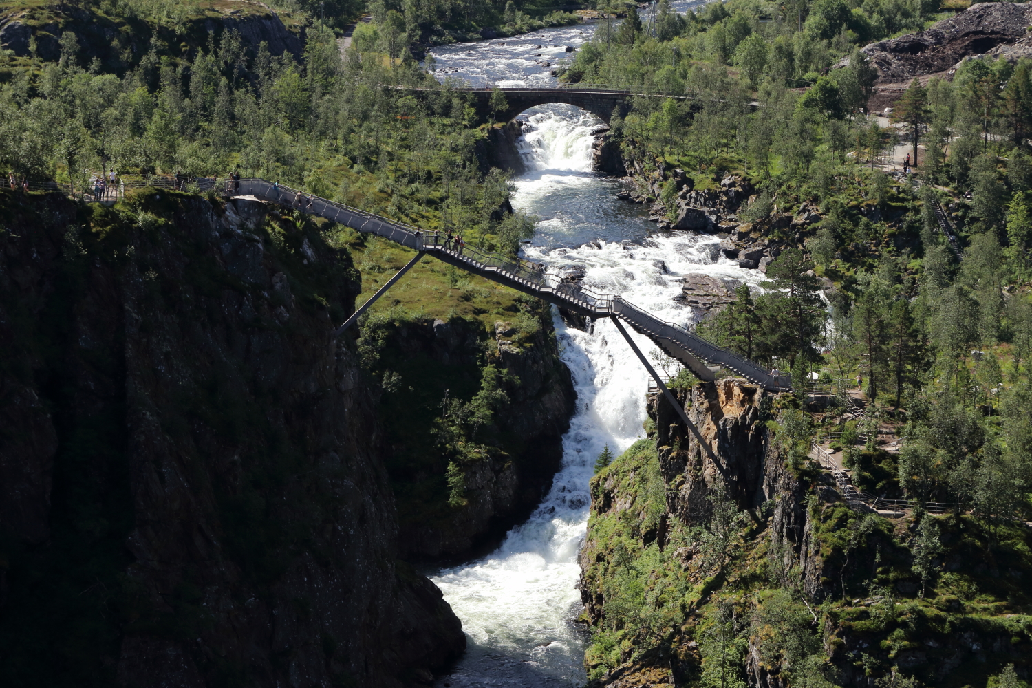 Vøringfossen et sa chute d’eau de 182 m au total, dont 163 m pour la grande cascade. De part et d’autre du canyon, tout l’aménagement est conçu pour profiter du spectacle et du panorama. Une passerelle de 47 m aux 99 marches enjambe la rivière Bjoreio.