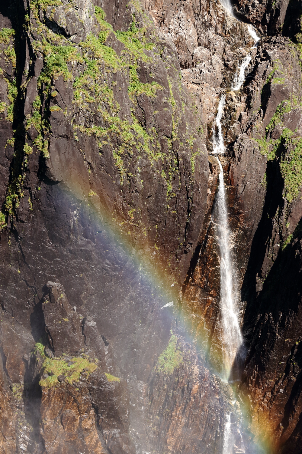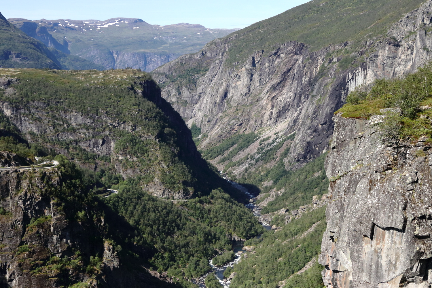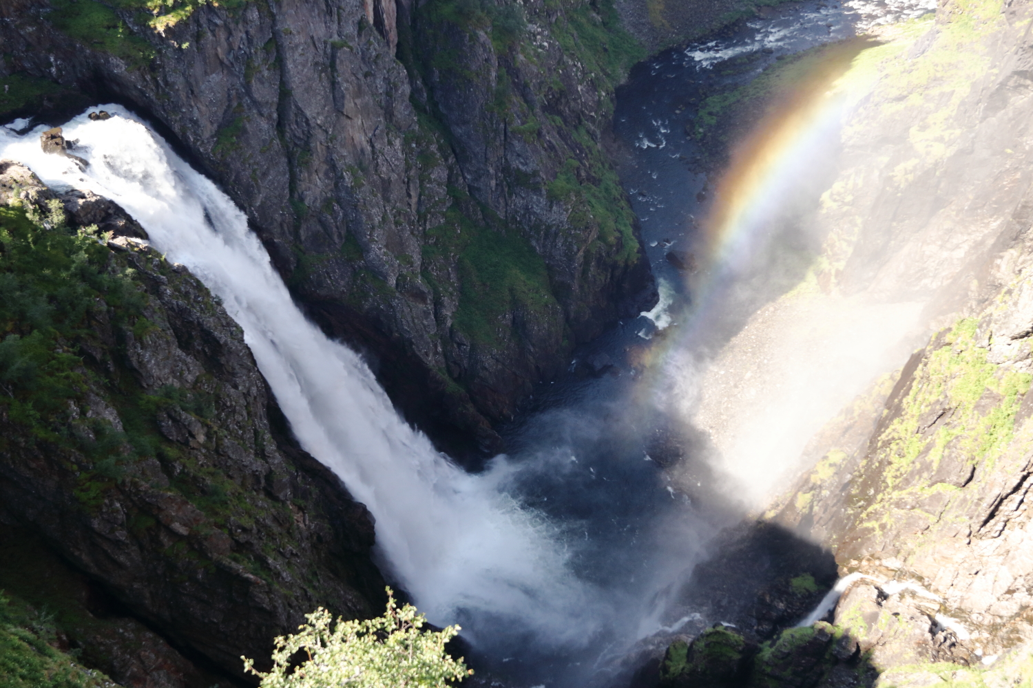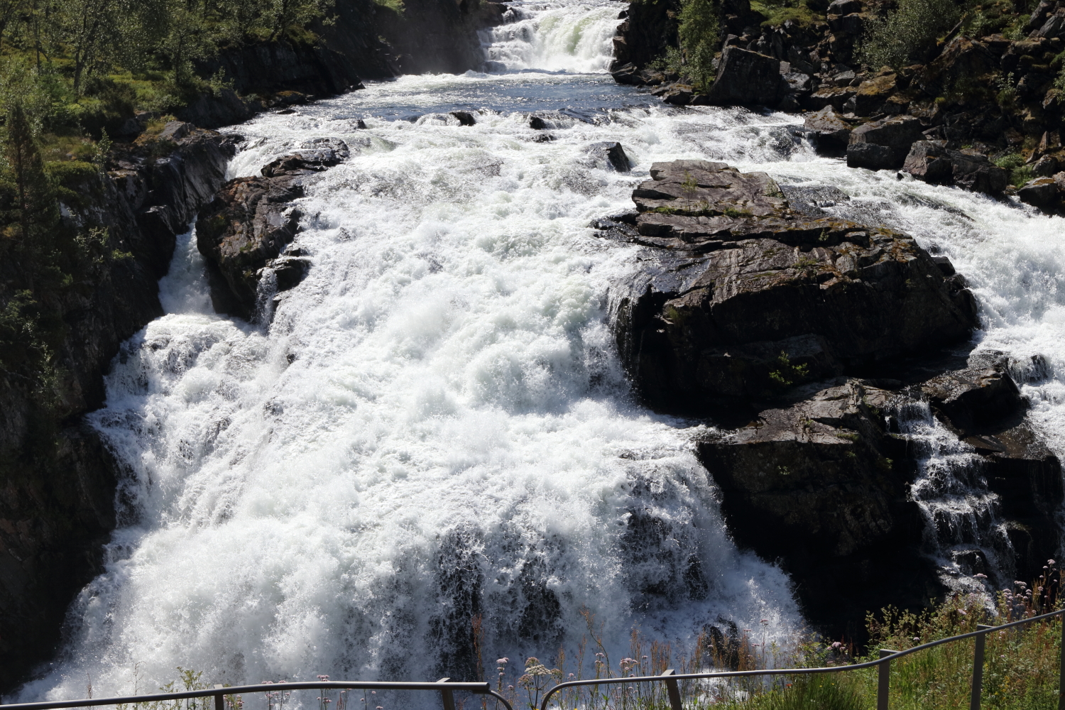Vøringfossen et sa chute d’eau de 182 m au total, dont 163 m pour la grande cascade. De part et d’autre du canyon, tout l’aménagement est conçu pour profiter du spectacle et du panorama. Une passerelle de 47 m aux 99 marches enjambe la rivière Bjoreio.