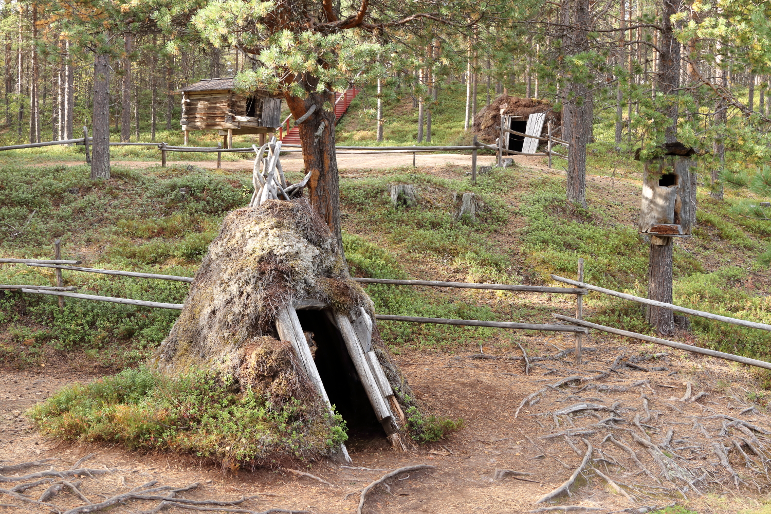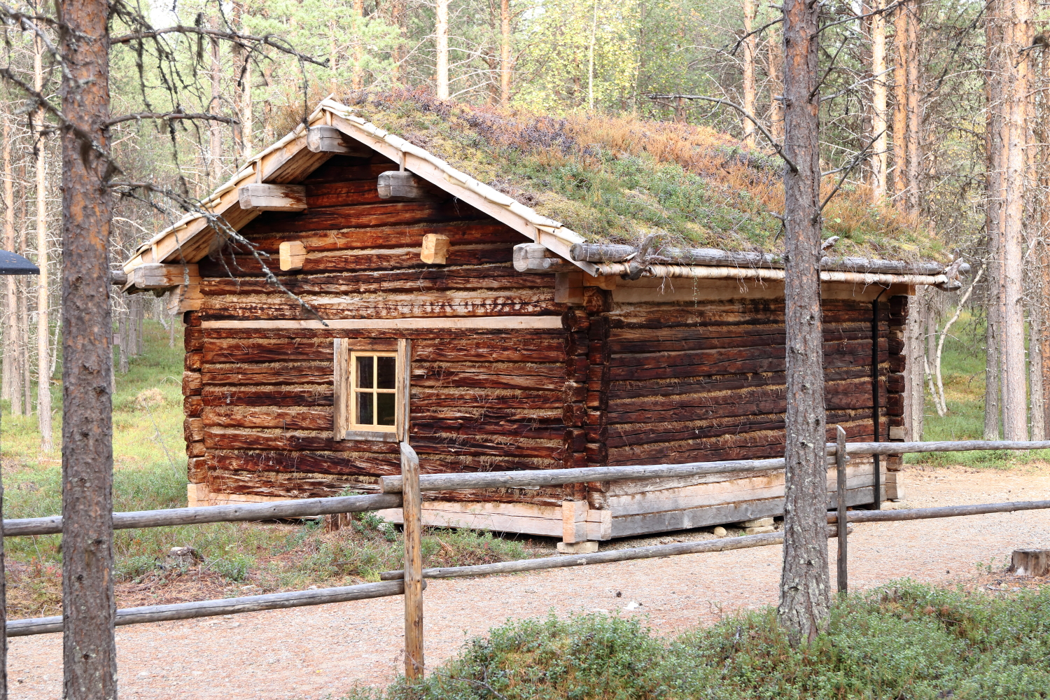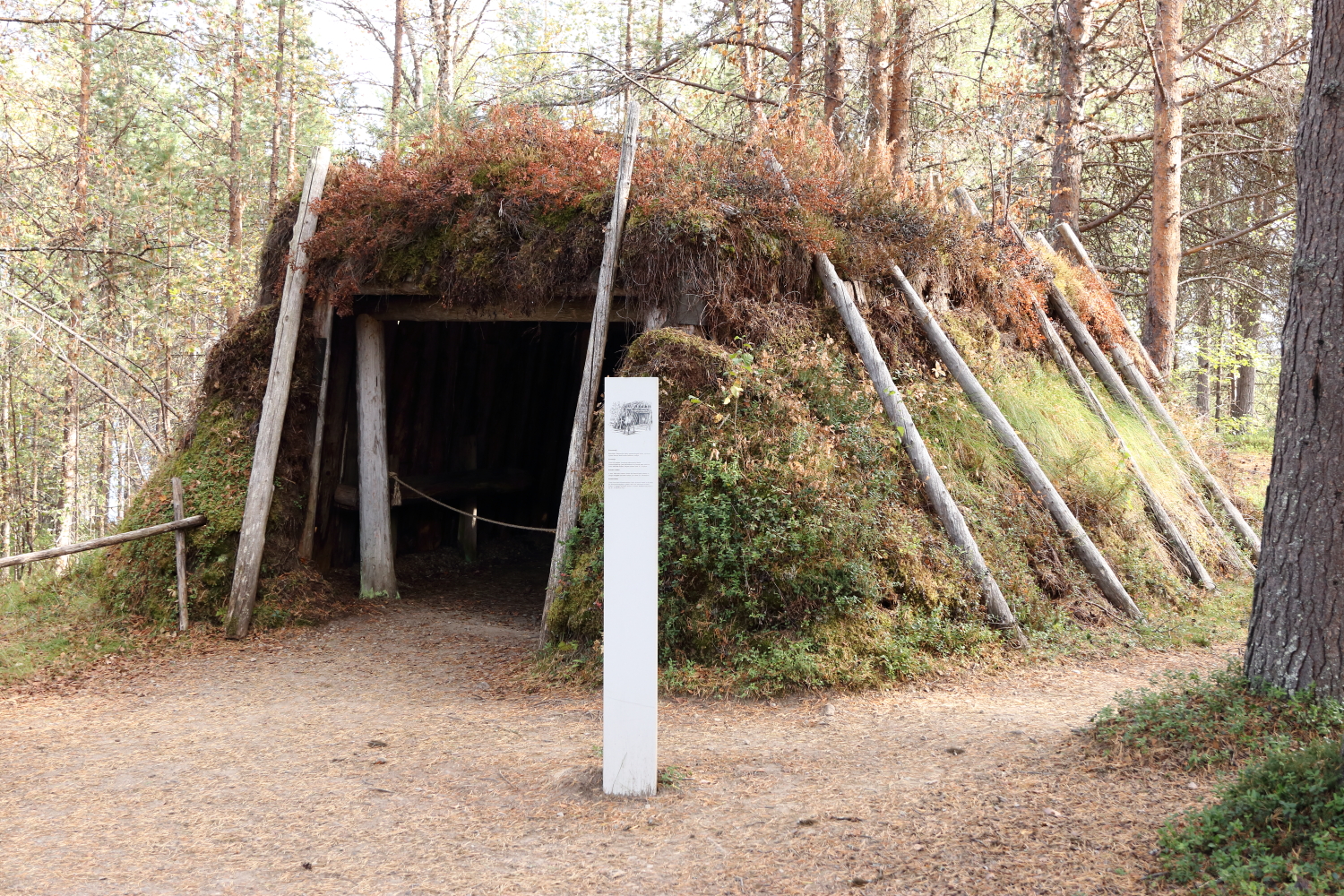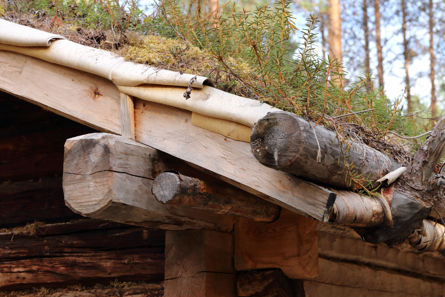 La partie extérieure du musée relate l’habitat. La toiture végétalisée régule la température et l’écorce de bouleau protège la charpente.