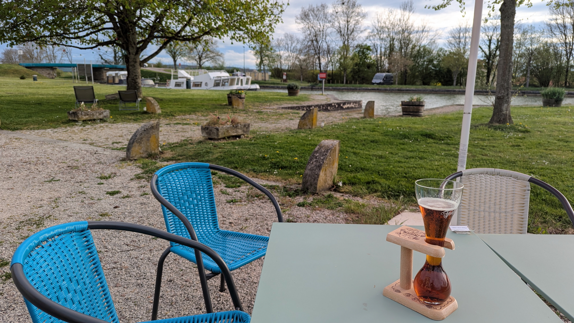 Port-Royal, traversé par le canal de Bourgogne, avant de remonter vers l’Ile-de-France. Dégustation d’une Kwak, bière belge, avec son verre et son support spécifique. Autrefois, le cocher avait obligation de rester sur son véhicule hippomobile. On a donc inventé cet appui afin qu’il puisse se désaltérer.